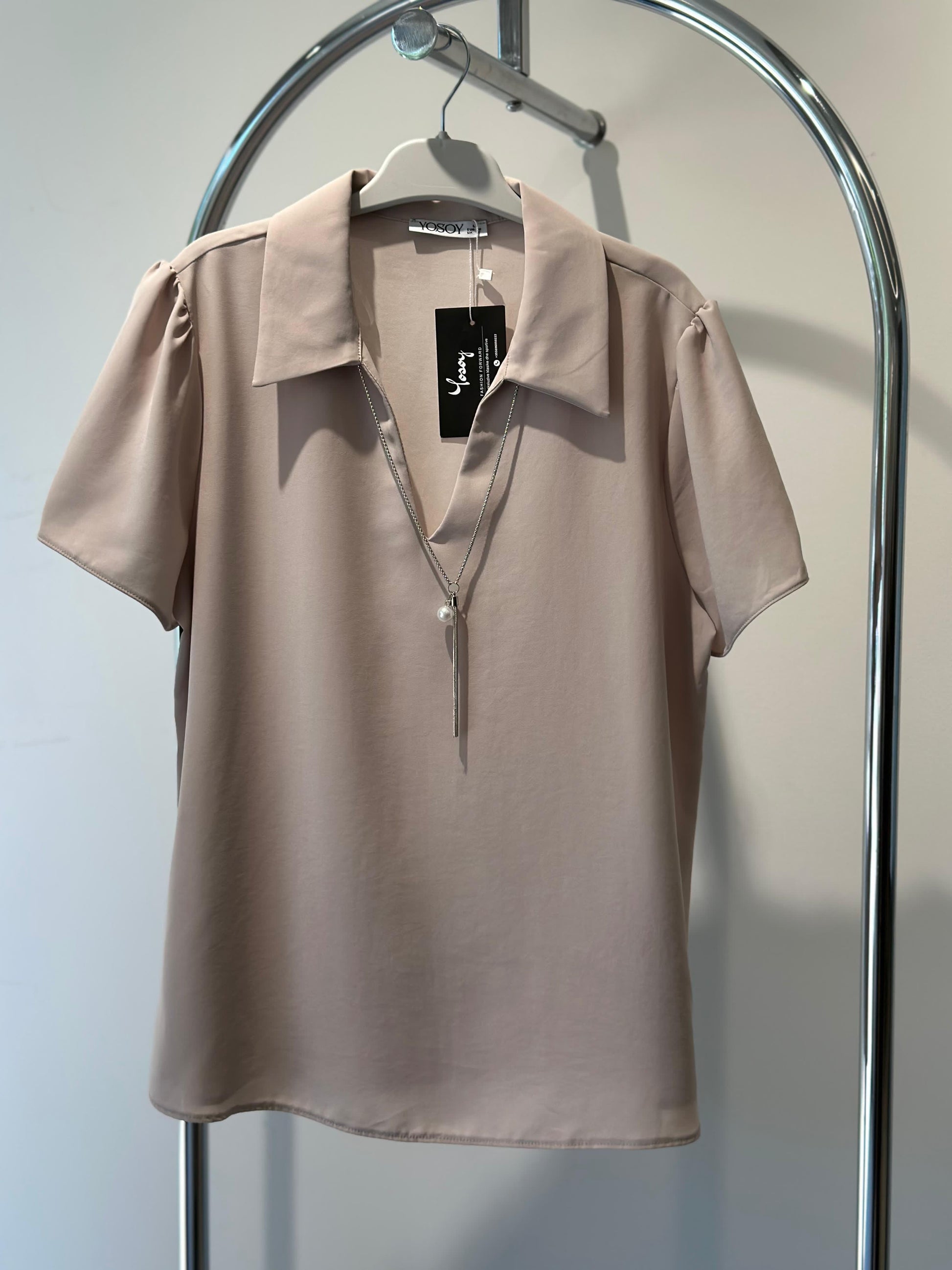 Bluze krem me menge te shkurtra, qafa V me jake dhe me aksesor varese perpara. Stil i derdhur.