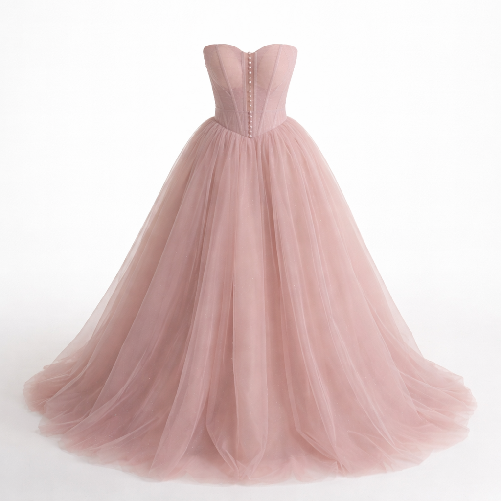 Fustan mbremjeje i gjate. Me fund te fryre deri ne fund te kembeve. Pjese e bustit pas trupit me detaje kopsash dhe kupa me formen e gjoksit. Nga koleksioni *Limited Edition*