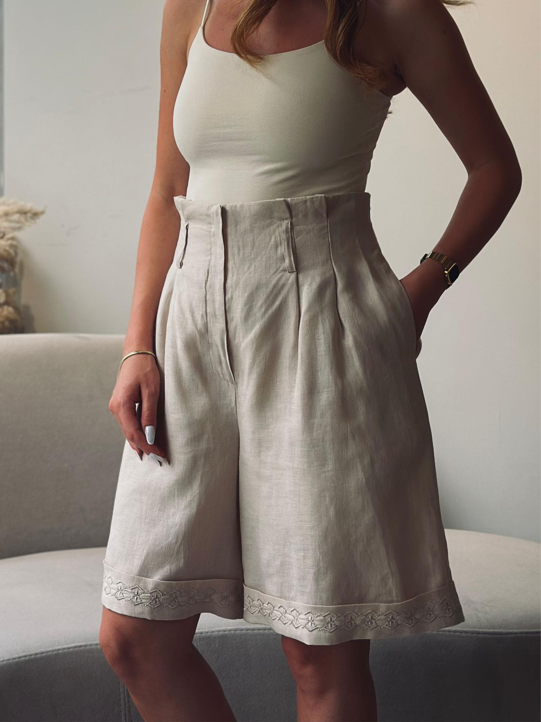Pantallona te shkurtra 100% lino, gjatesia pak siper gjurit. Beli i larte me vend per te vendosur rrip, kane zinxhir perpara dhe llastik pas. Me astar, jo transparente. Konturi posht i qendisur me logo.