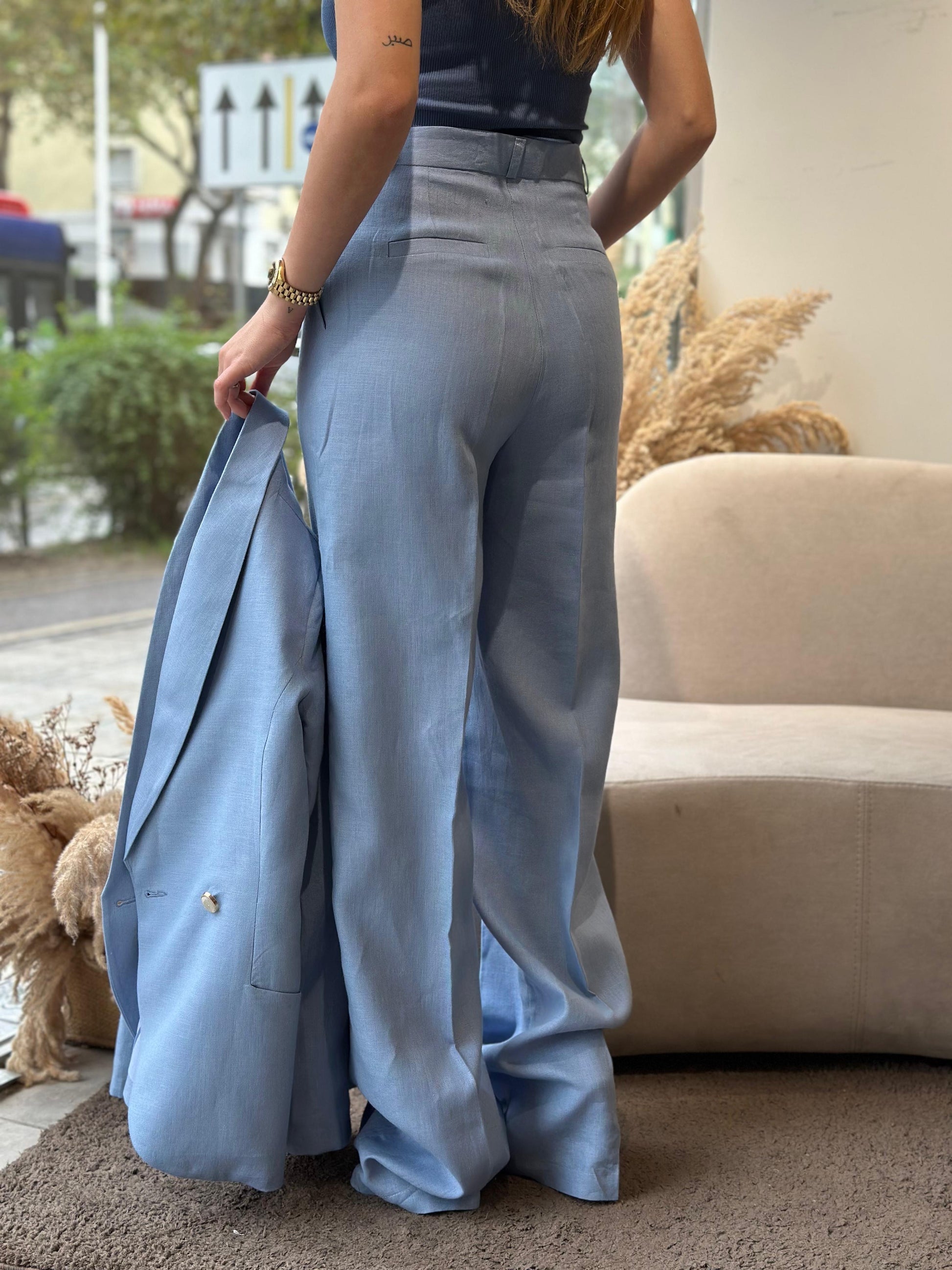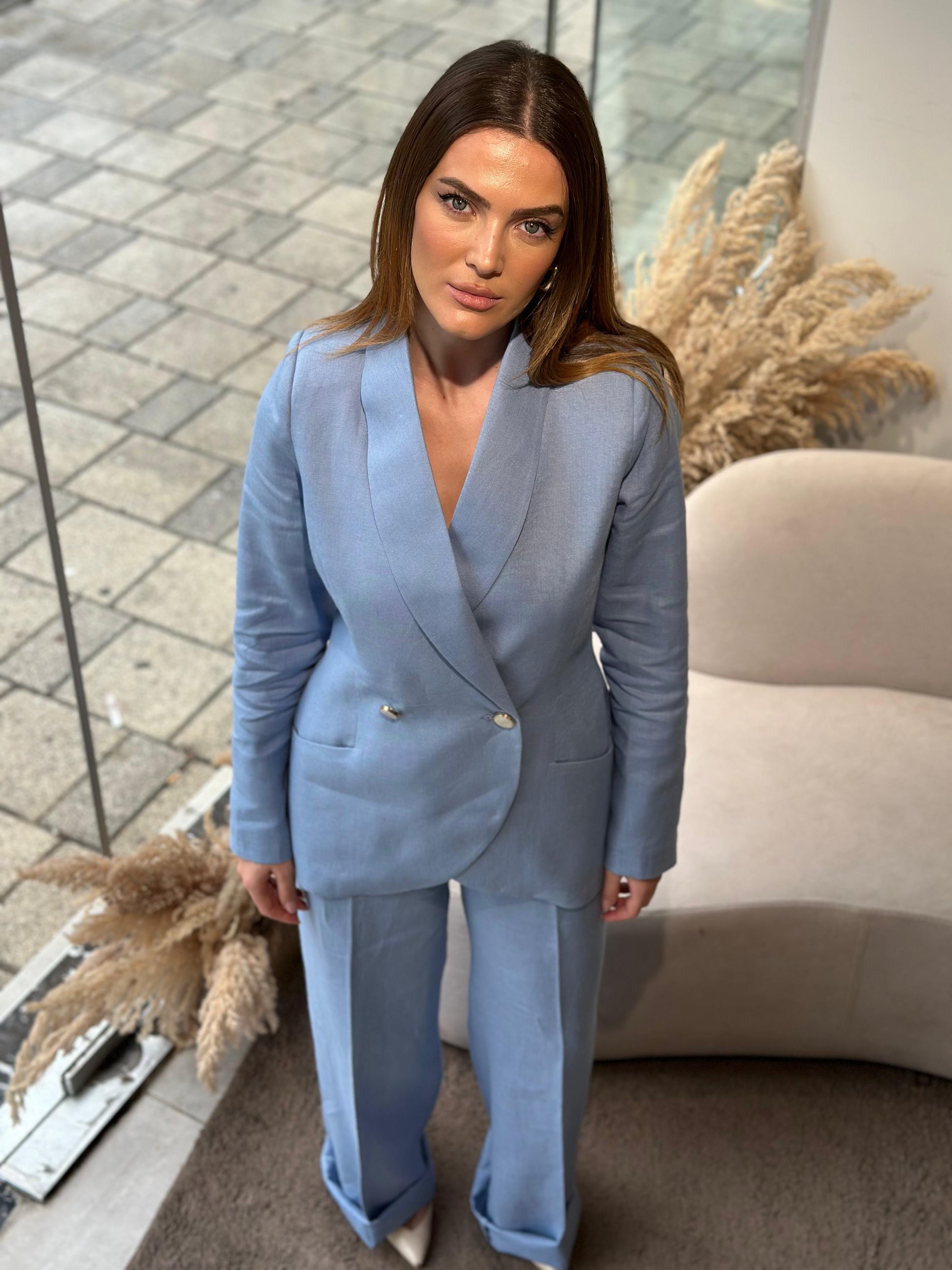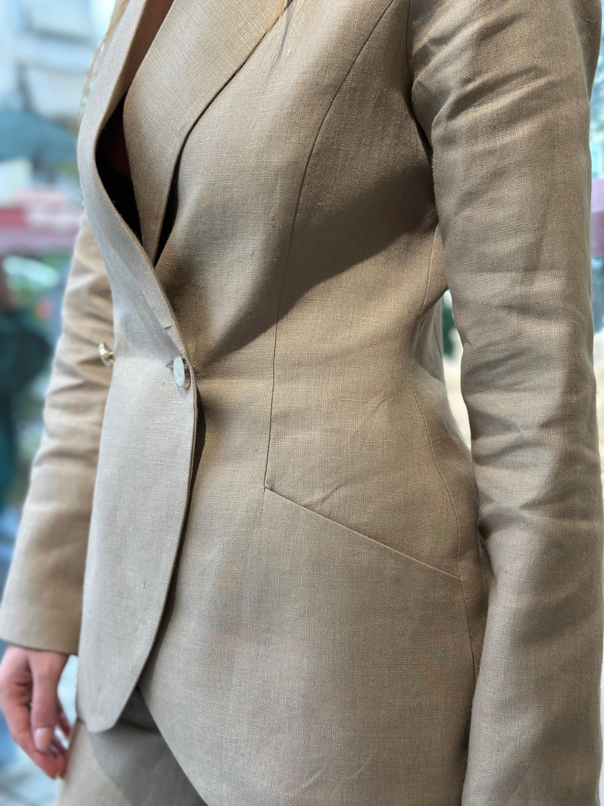 Kostum 100% lino me xhakete dhe pantallona te gjata paralel. Xhaketa me astar të lehtë pambuk. Prerja fit. Dopio kopse
