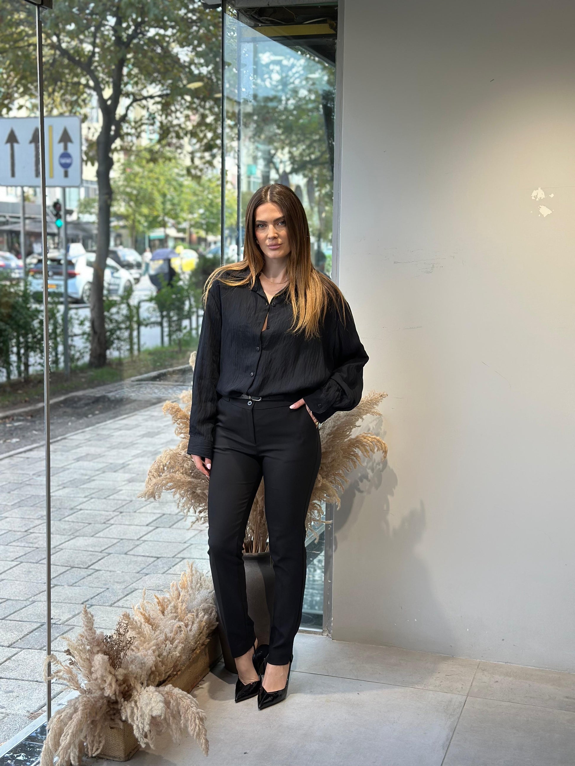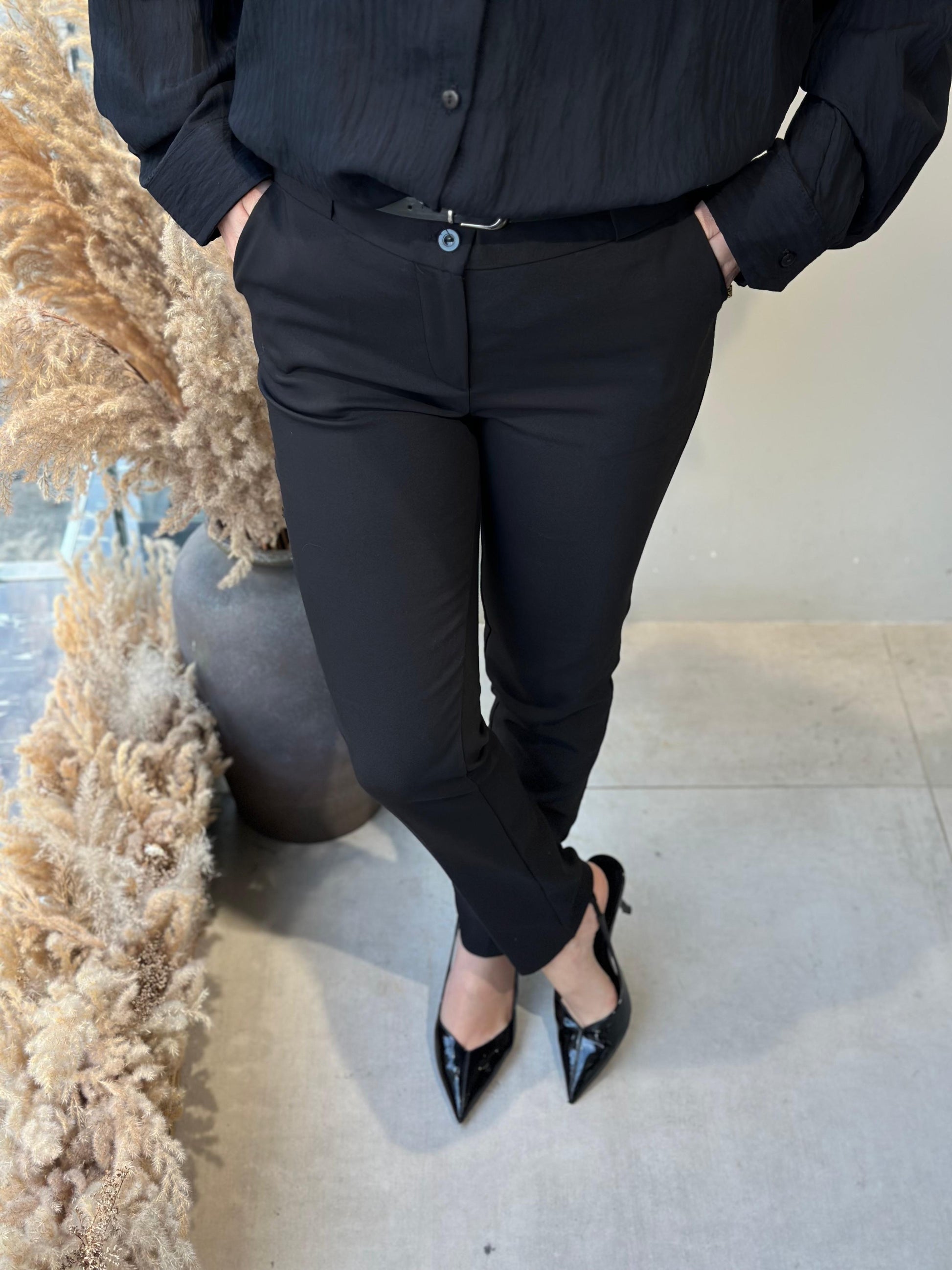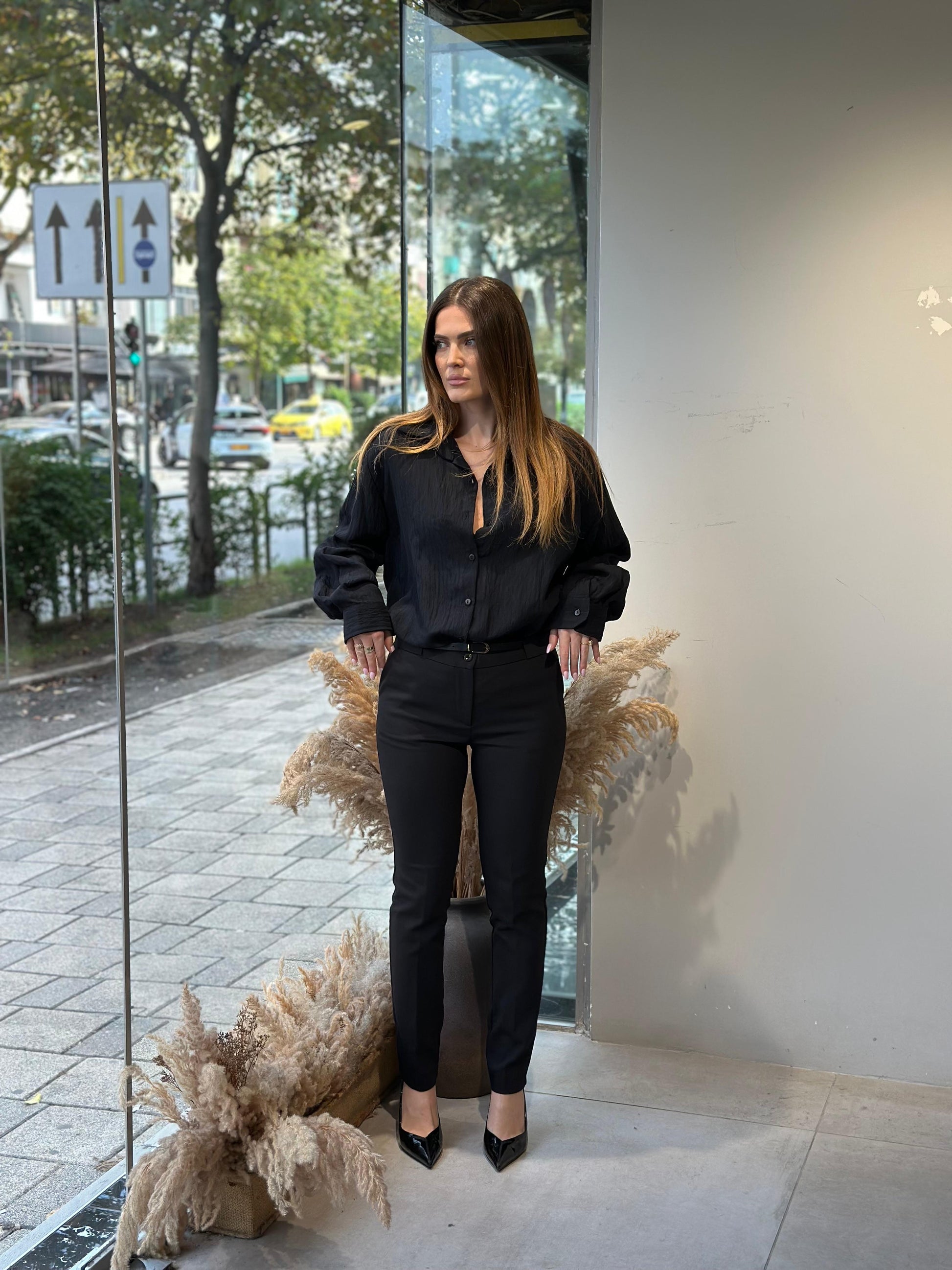 Pantallona klasike kaush, pas trupi per te dhene siluete elegante. 2 xhepa funksionale anesore. Shoqerohen me nje rrip te holle te zi. Prerja e vogel.