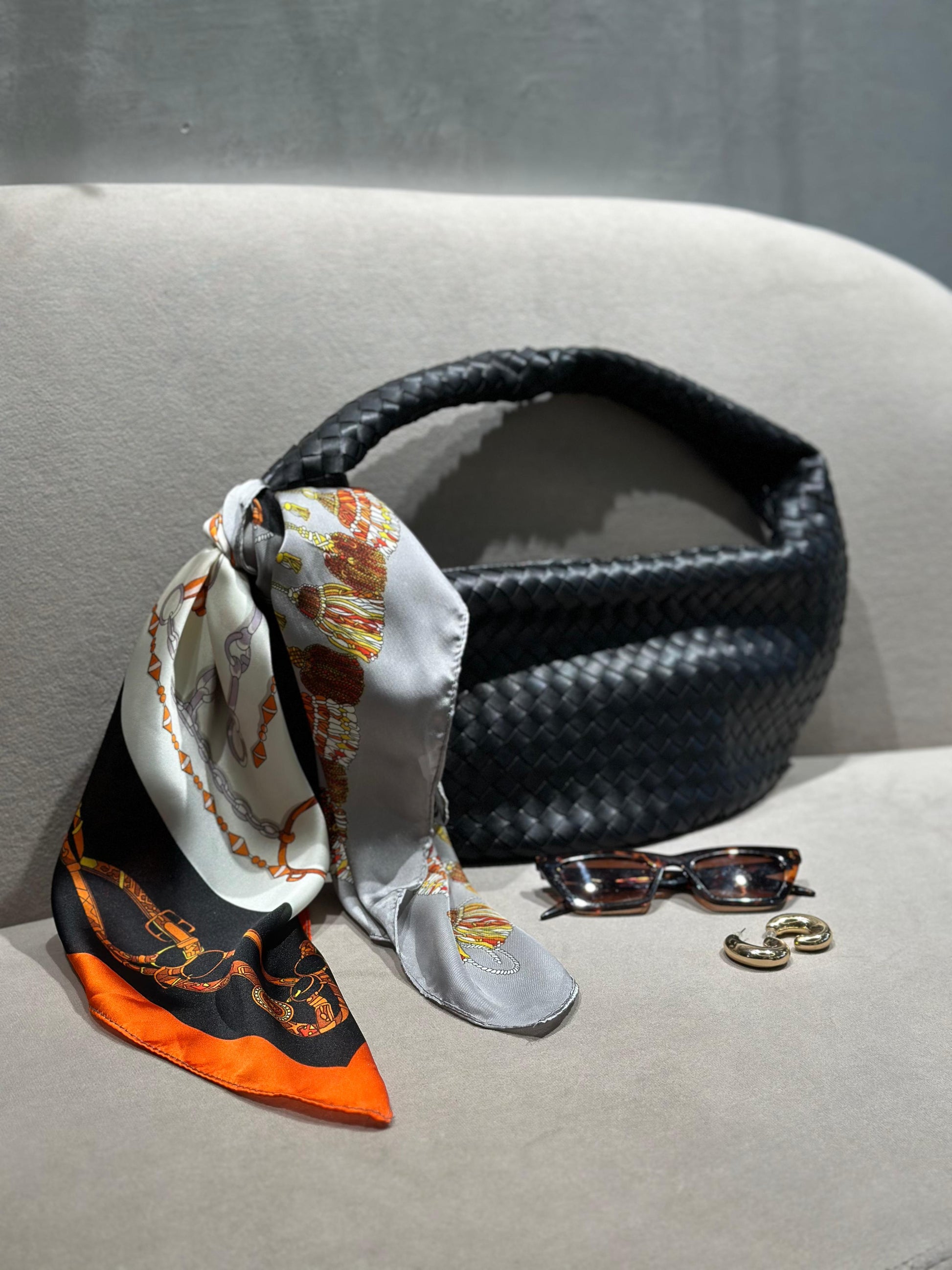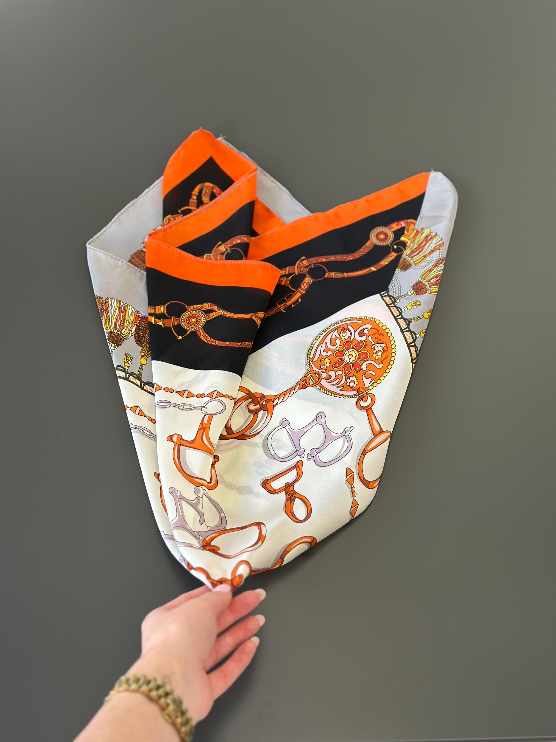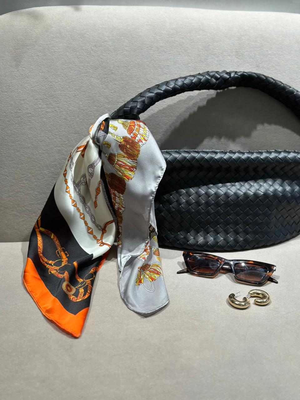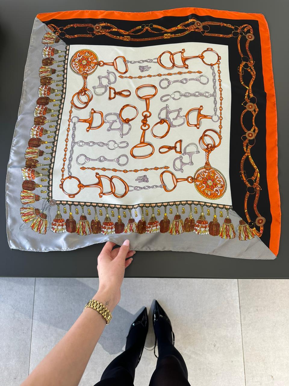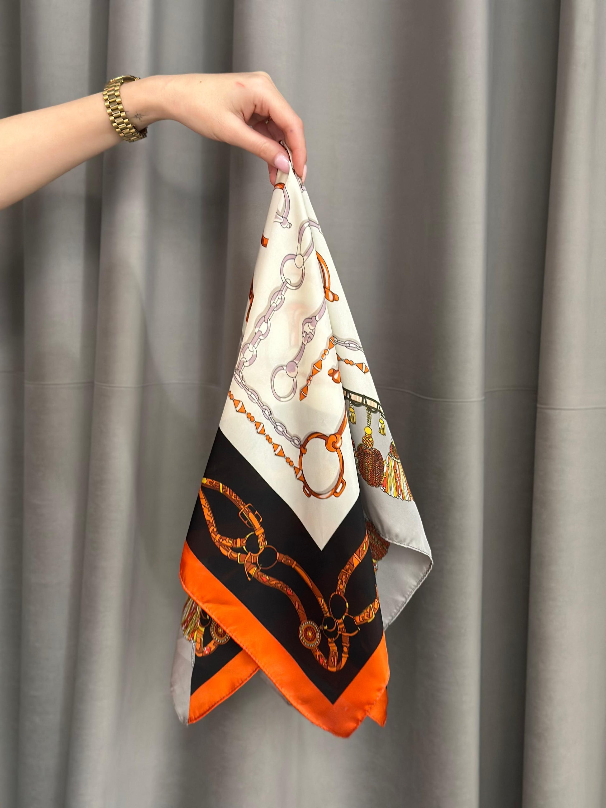 Shall i hollë mëndafshi me print klasik me elemente metalike, i përshtatshëm për ta lidhur në qafë, flokë ose çantë. Përmasat 70x70 cm. Posta nuk perfshihet ne cmim.