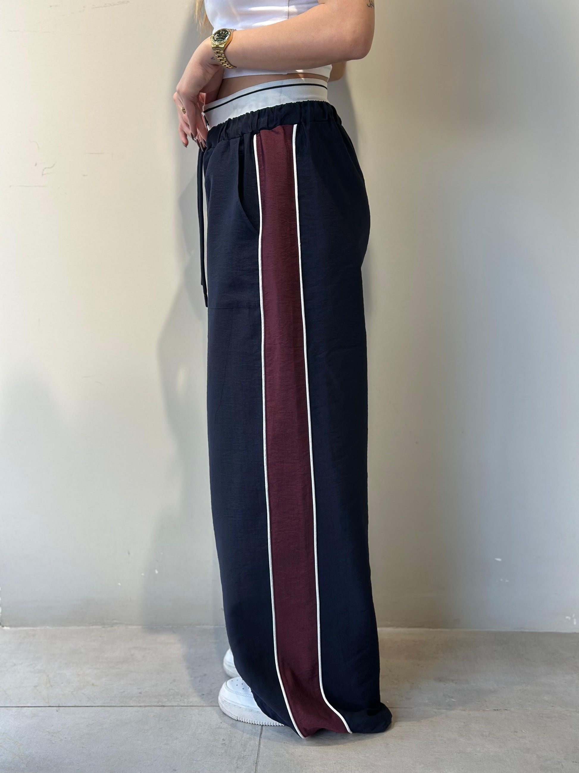 Tuta sportive te gjera. Ngjyre blu me vija te trasha vishnje anesore. Material feshe, prerje oversize.