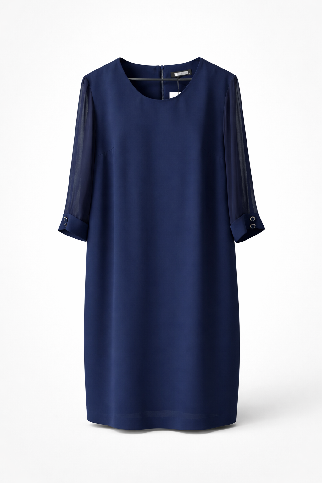 Fustan krem me gjatesi mesatare ne ngjyre blu e erret. Gjendje masa te medha, menget trecerekshe transparente, me kopsa tek manshetat.