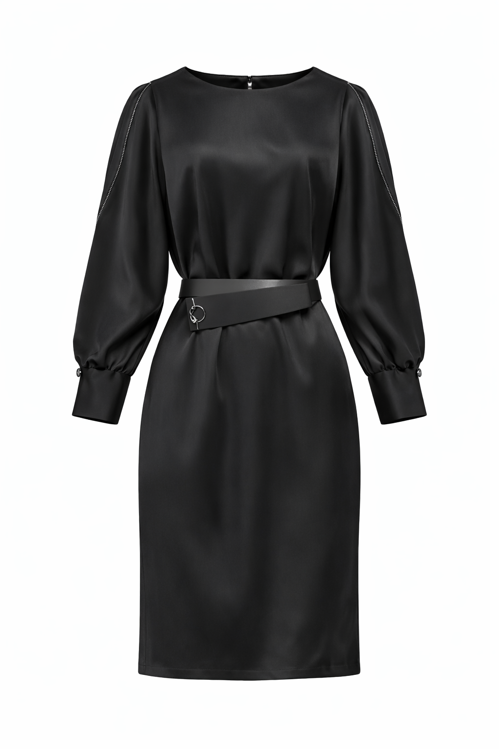 Fustan i zi saten me gjatesi trecerekshe. Menge te gjata te hapura tek supet deri tek gjatesia e brrylit dhe me gure tek anesoret e te cares. Detaj kopse tek menga.