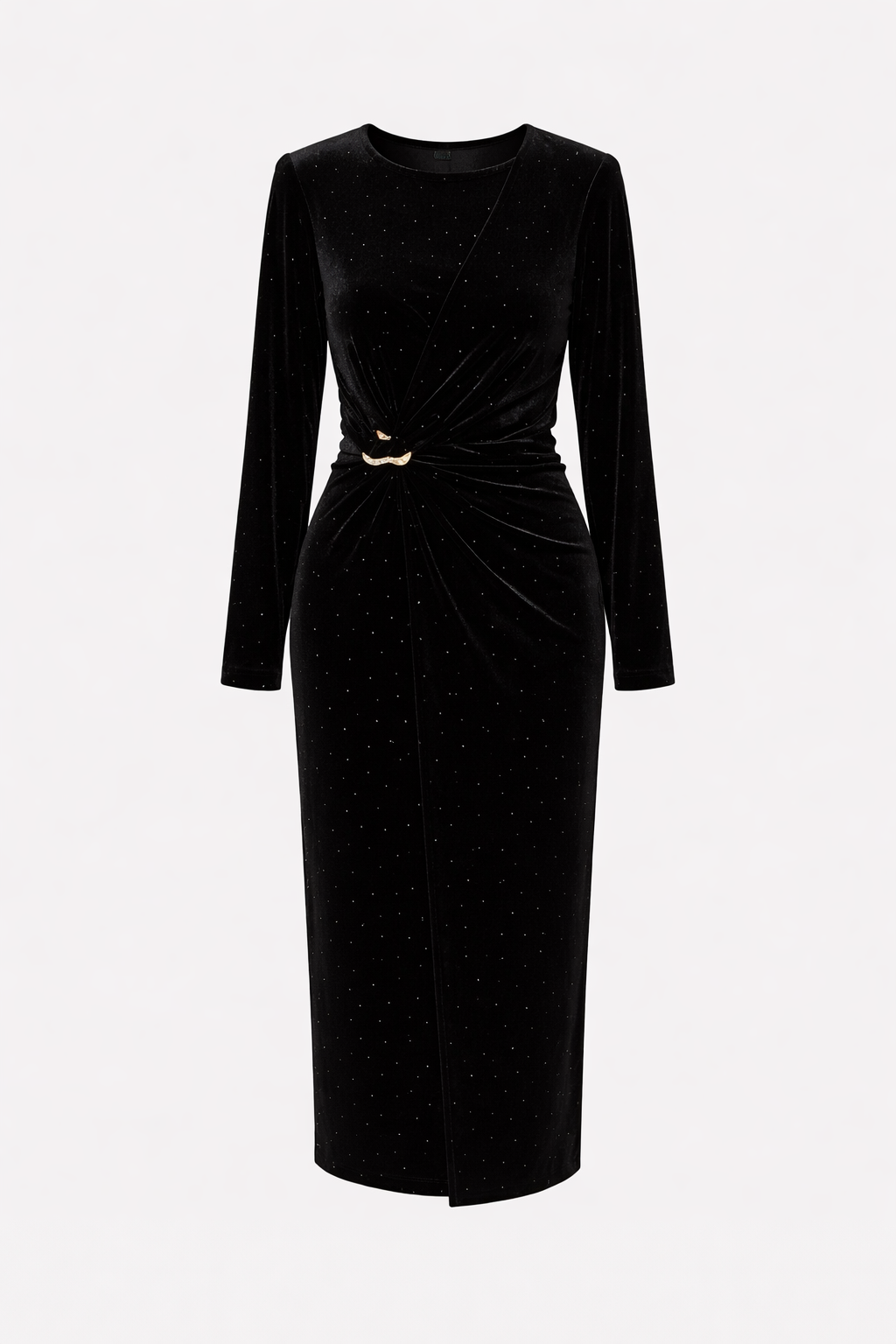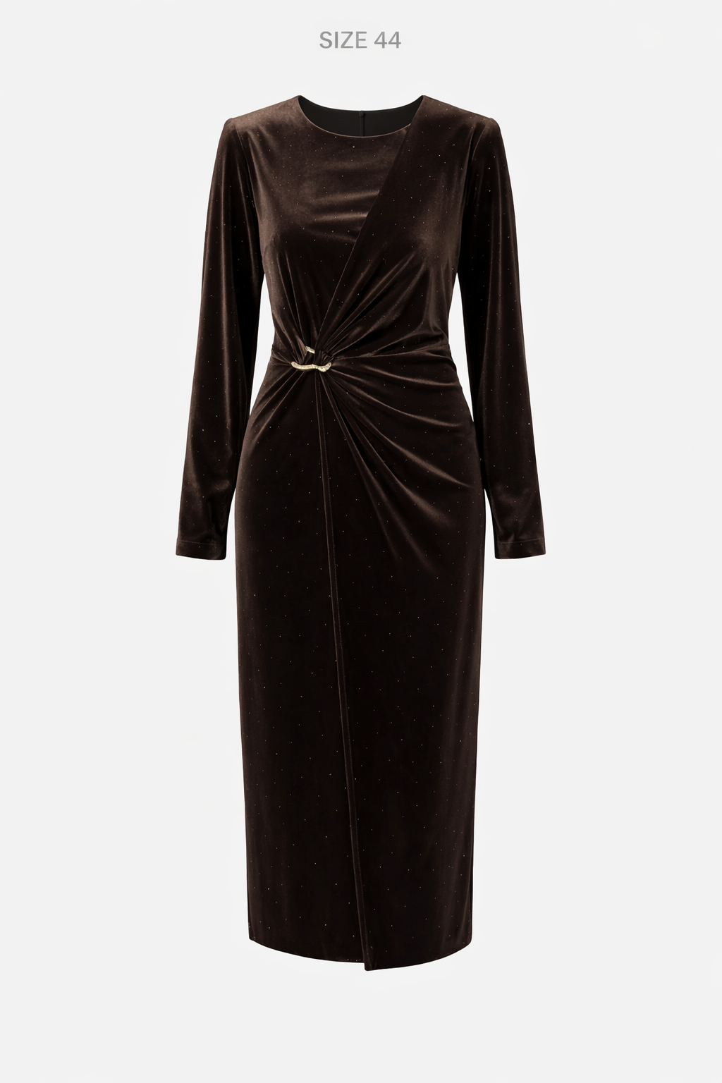 Fustan i gjate velvet me gure ne gjatesine e tij. Eshte me vata tek supet dhe me qepje draping.