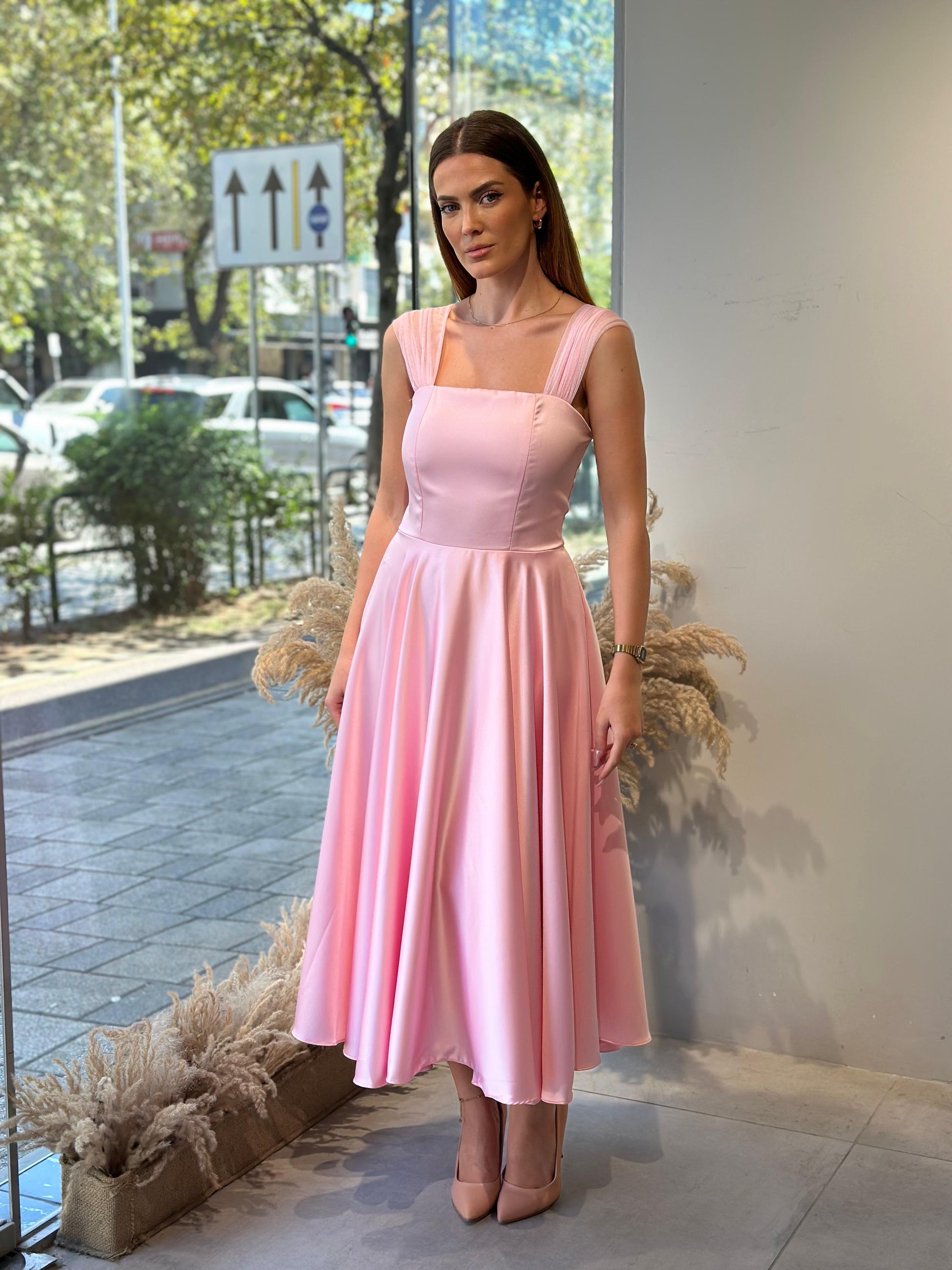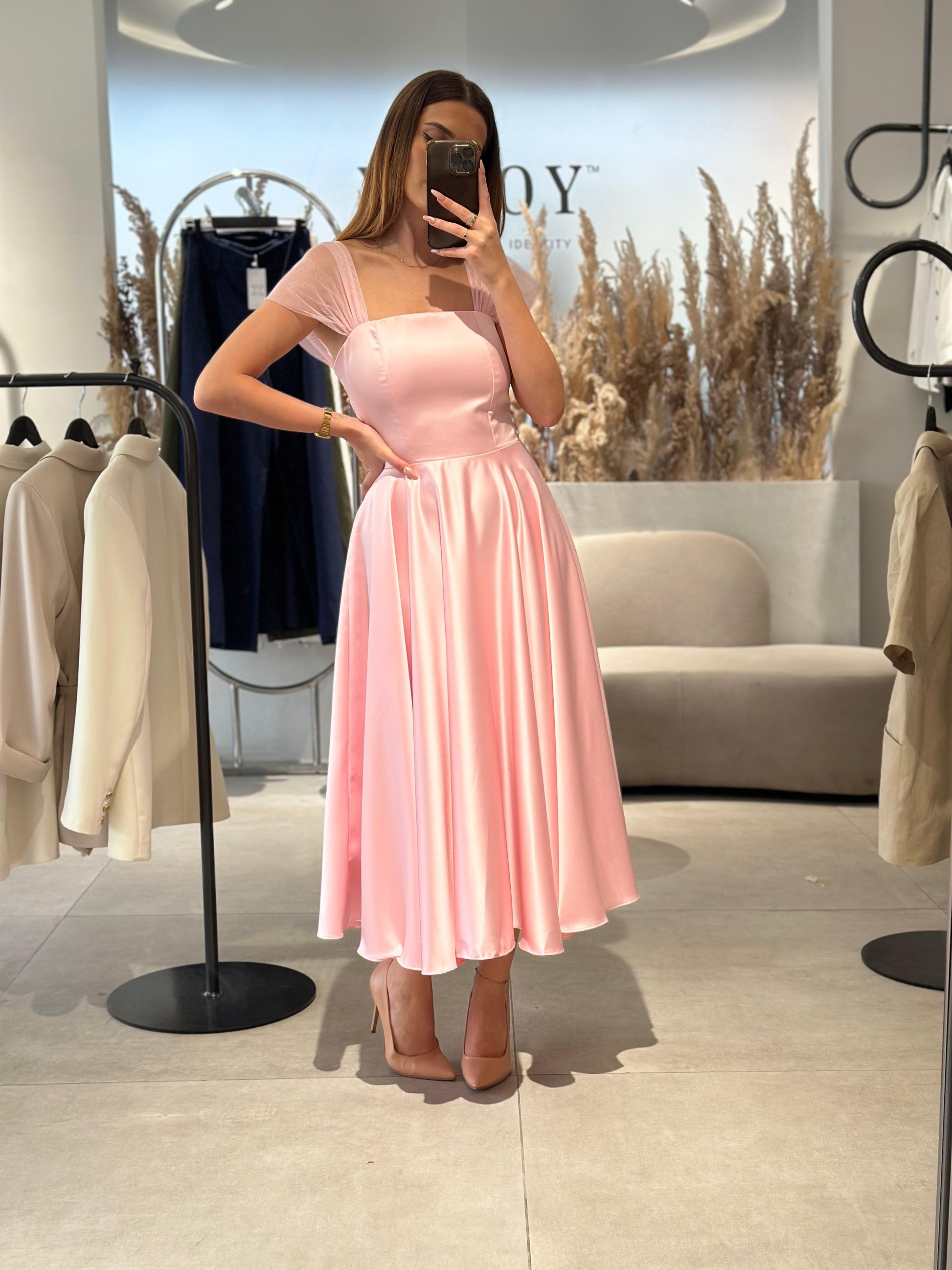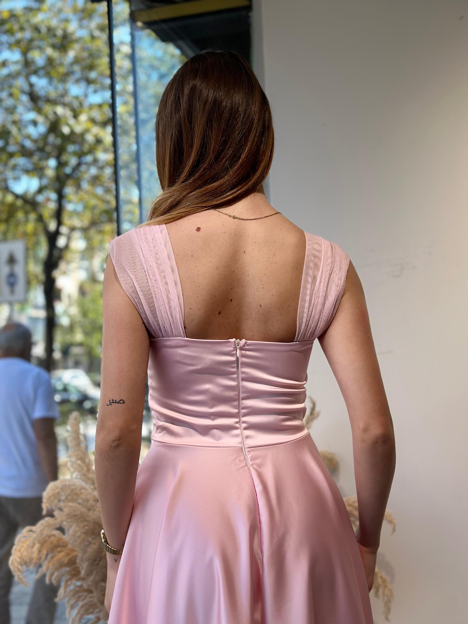 Fustan mbremjeje ne ngjyre roze te embel, gjatesi mesatare. Me dy rripa ne material tyli dhe me mberthim me zinxhir nga pas.