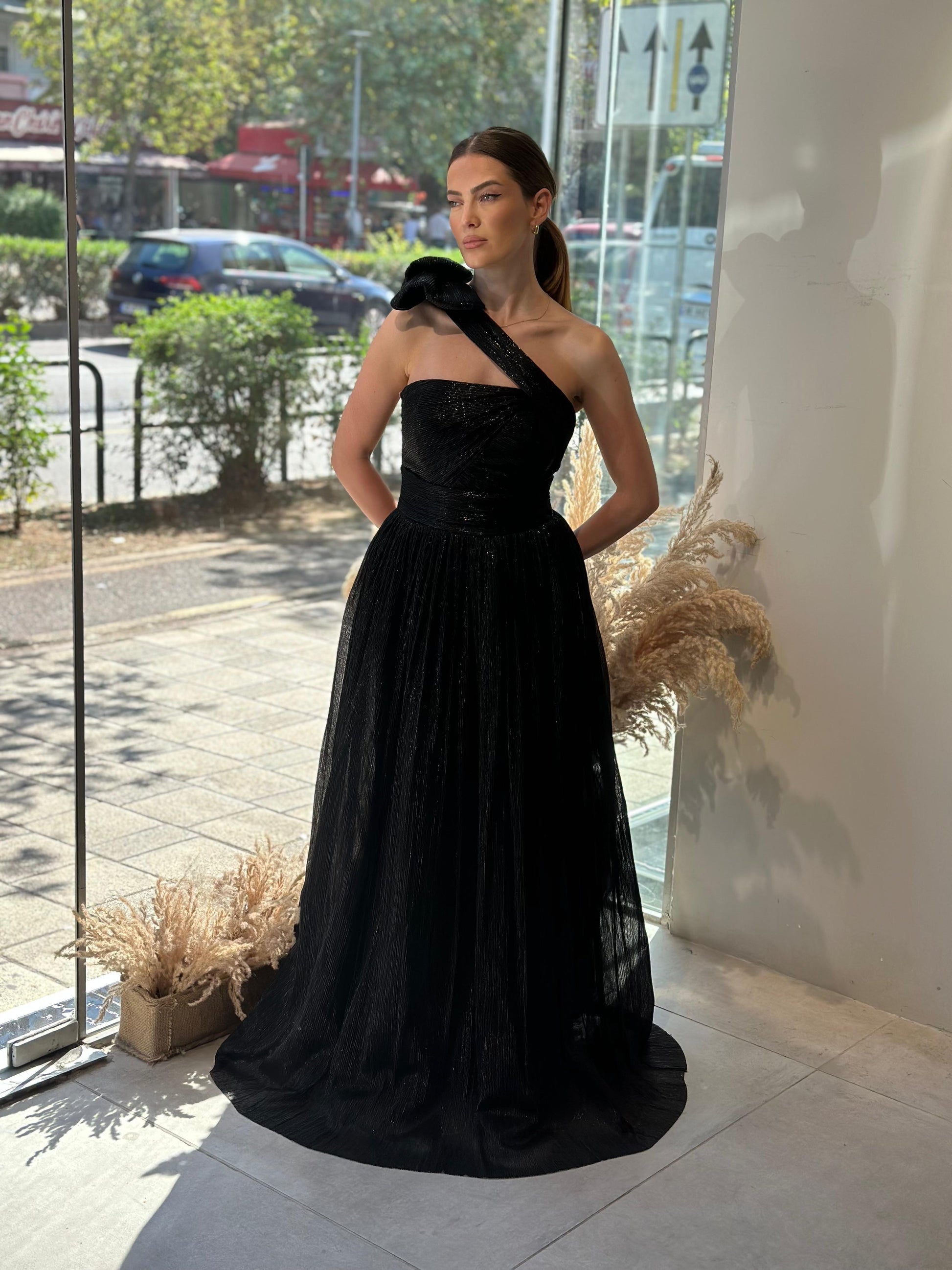 Fustan klasik i gjate me shkelqim ne ngjyre te zeze dhe gold. Pjesa e bustit pa menge, me efekt draping dhe me nje rrip diagonal tek qafa, ne kulmin e te cilit ndodhet nje aksesor fjongo.
