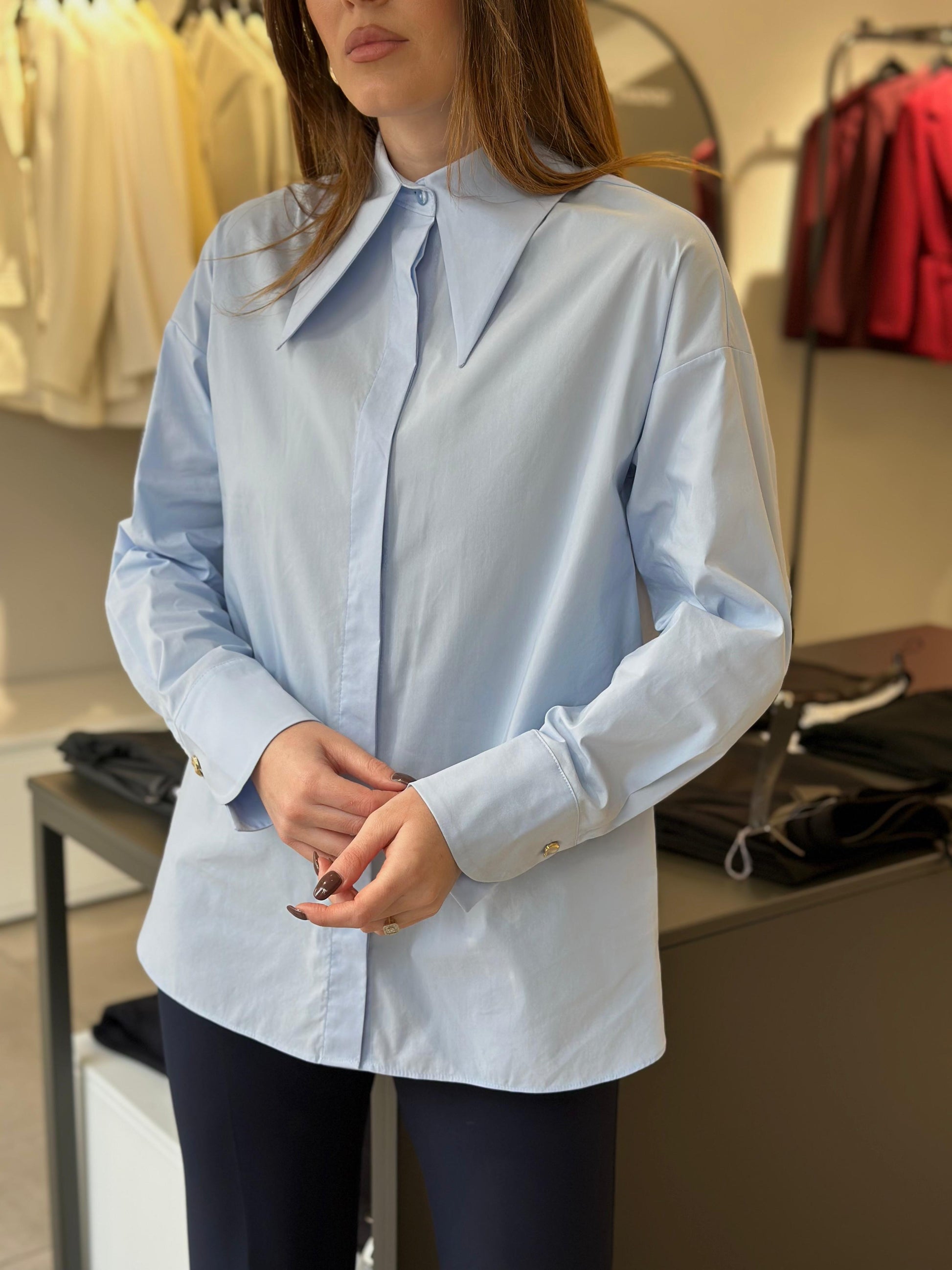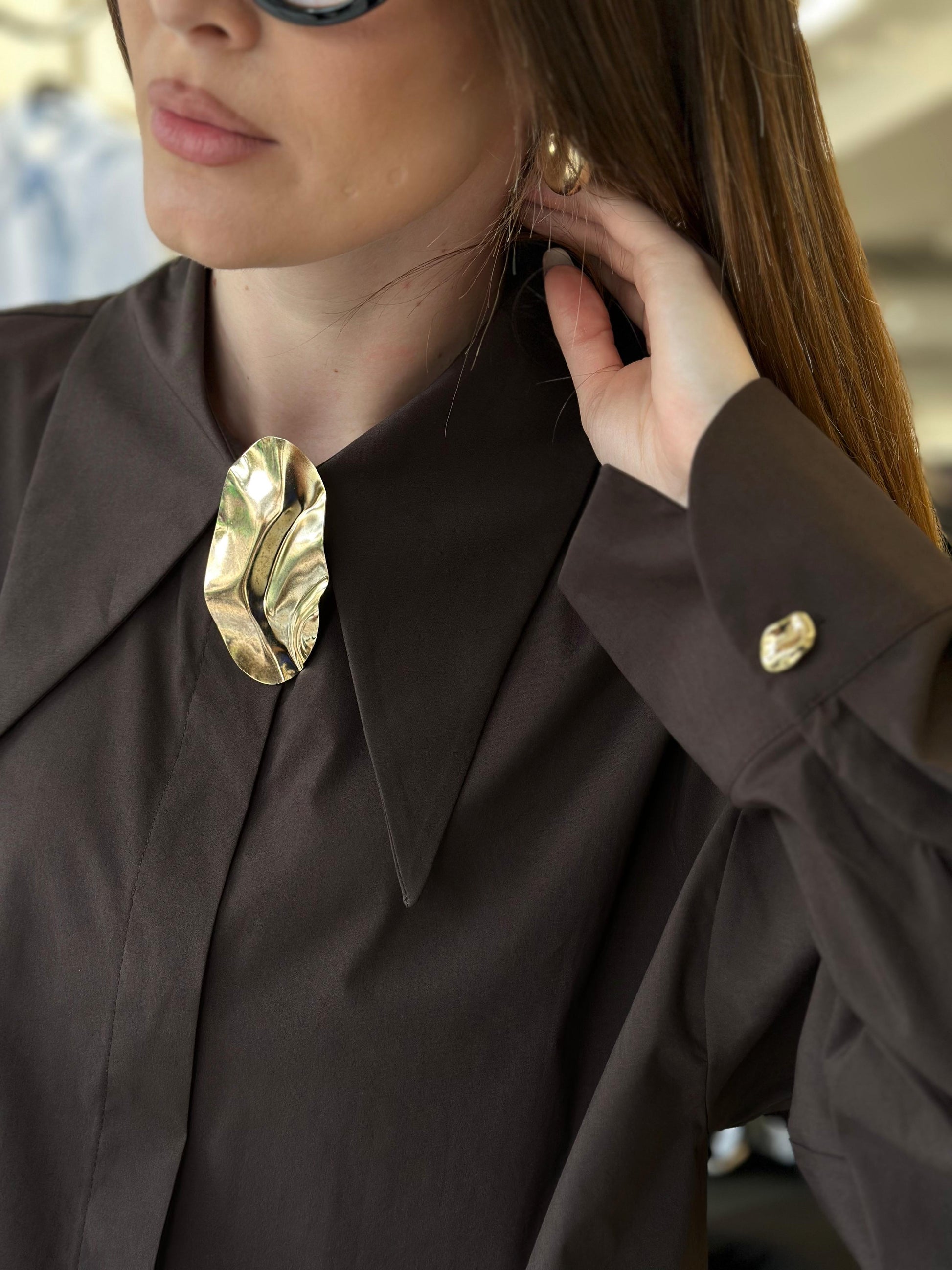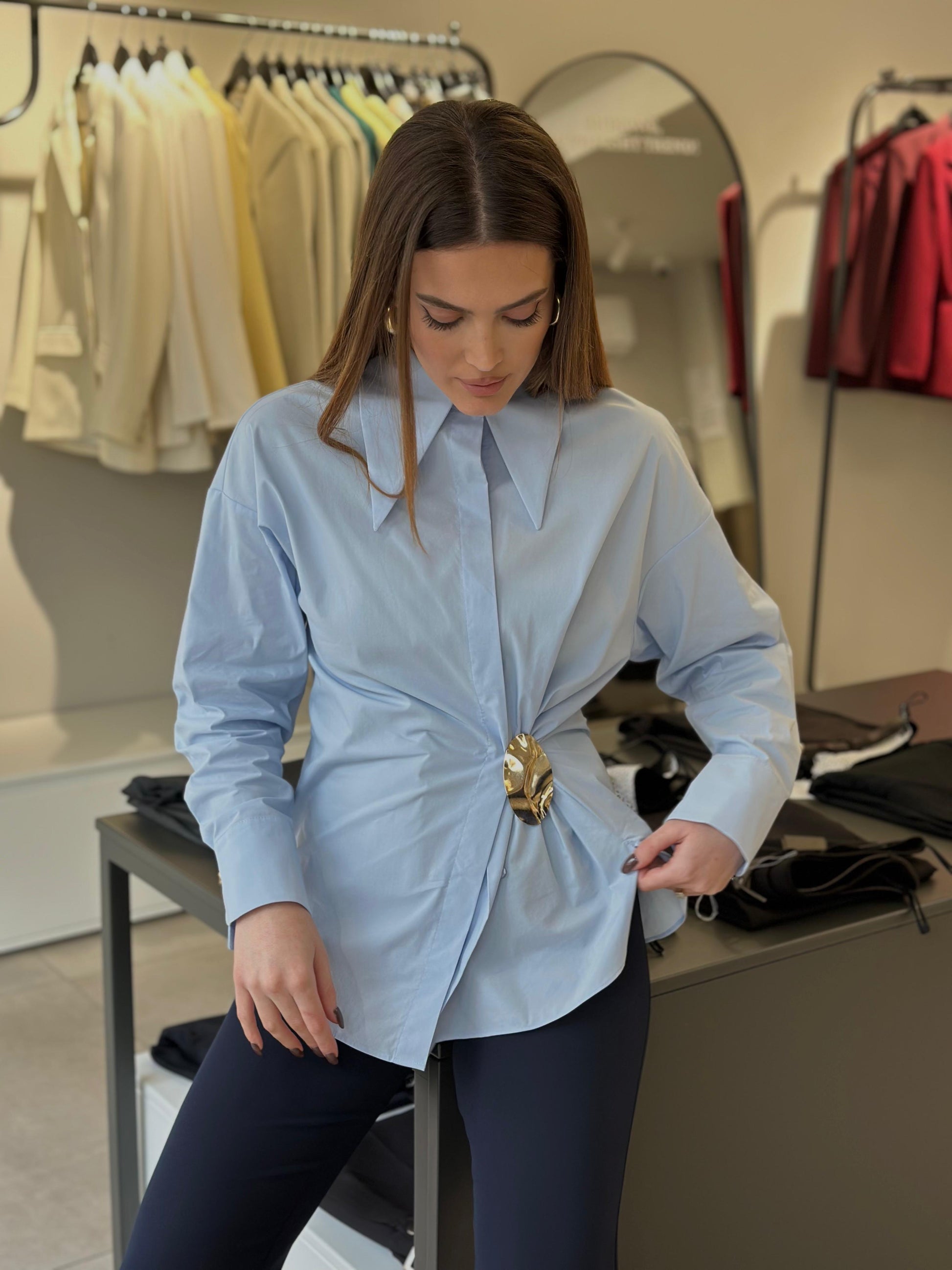 Kemishe poplin me pak elasticitet, stil pak i lirshem dhe kopsa te fshehura. Tek manshetat ka kopsa gold minimaliste dhe shoqerohet me nje spille gold asimetrike e madhe e cila mund te vendoset tek jaka ose te perdoret ne stilimin e kemishes.