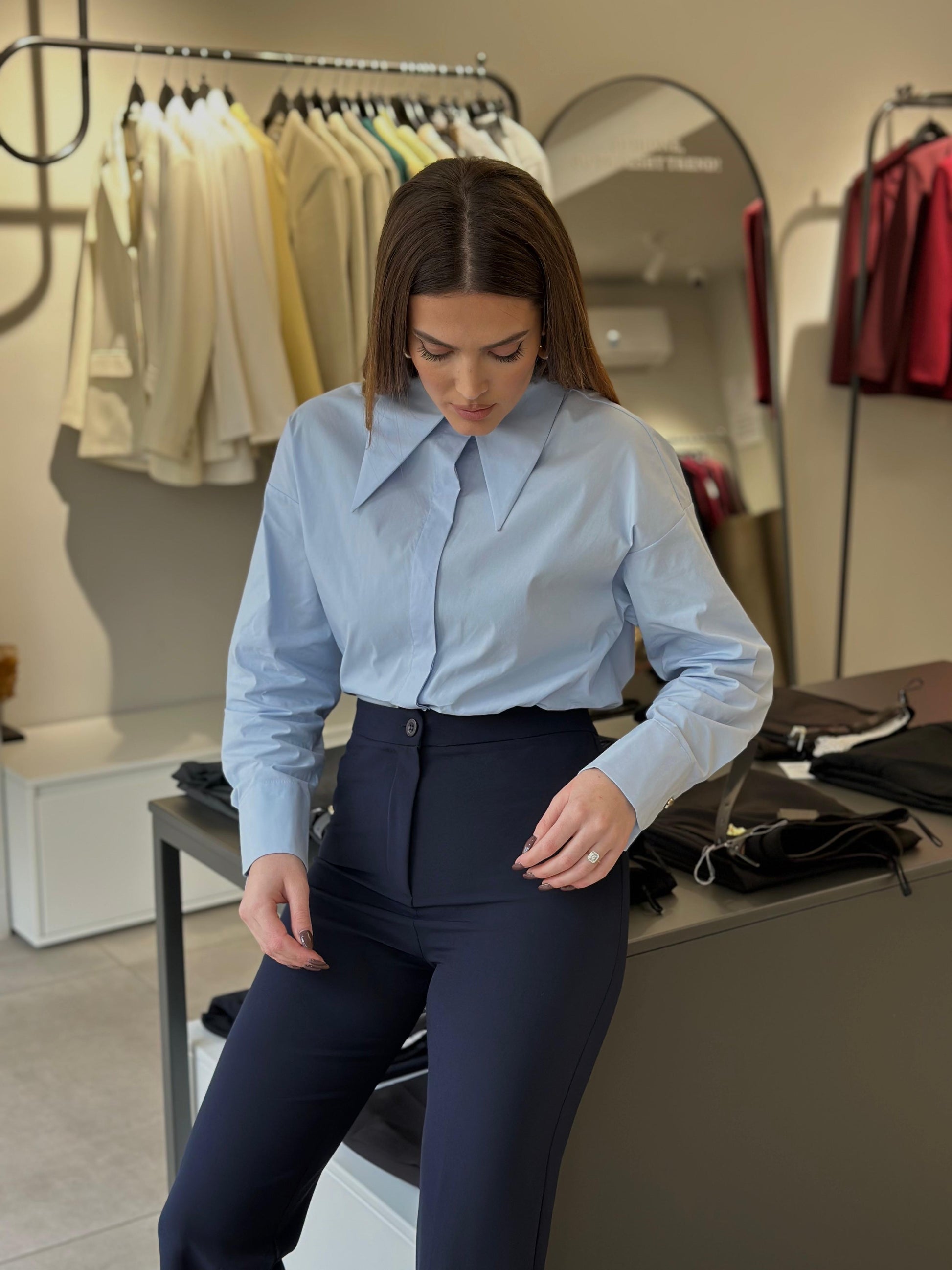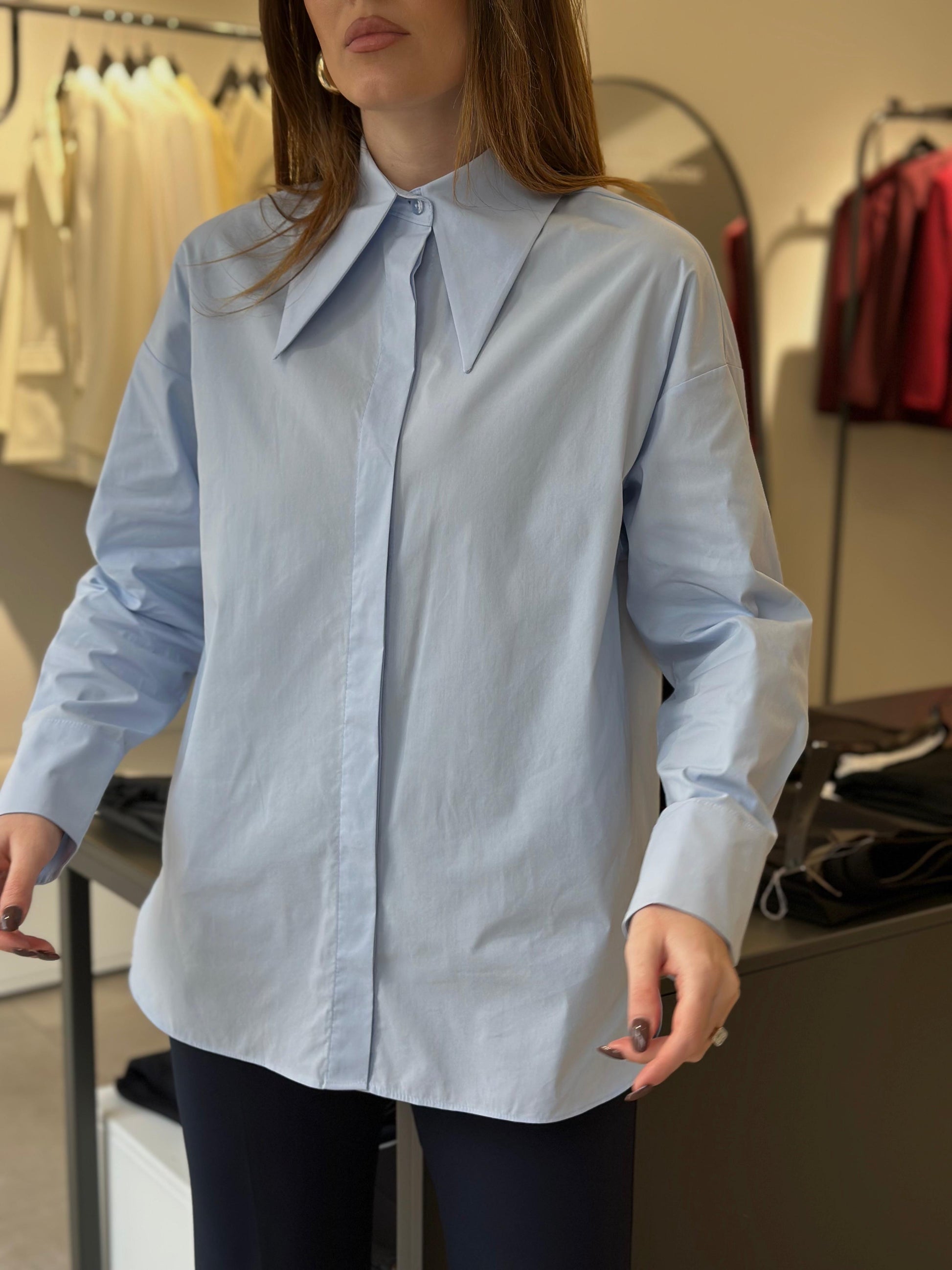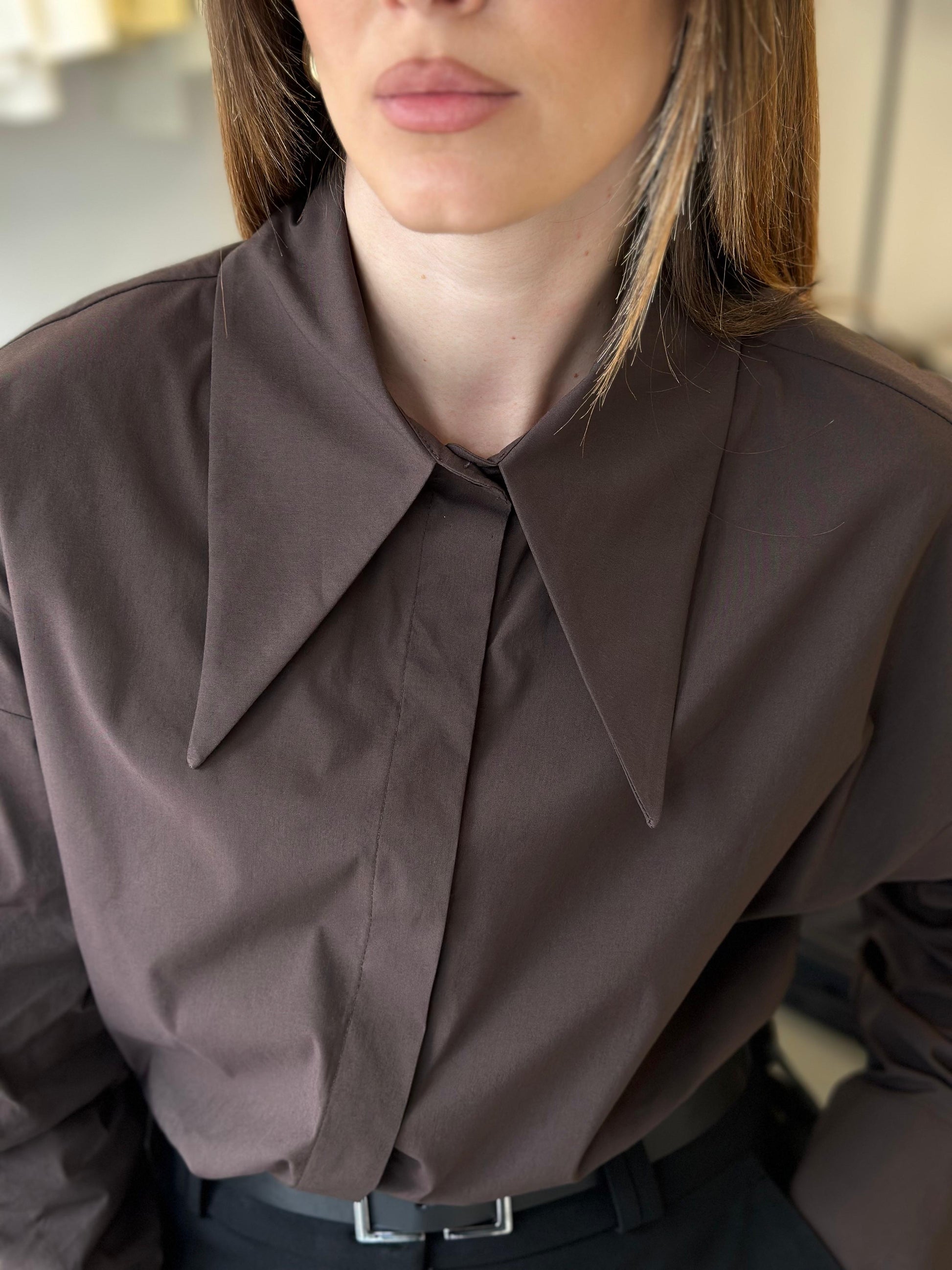 Kemishe poplin me pak elasticitet, stil pak i lirshem dhe kopsa te fshehura. Tek manshetat ka kopsa gold minimaliste dhe shoqerohet me nje spille gold asimetrike e madhe e cila mund te vendoset tek jaka ose te perdoret ne stilimin e kemishes.