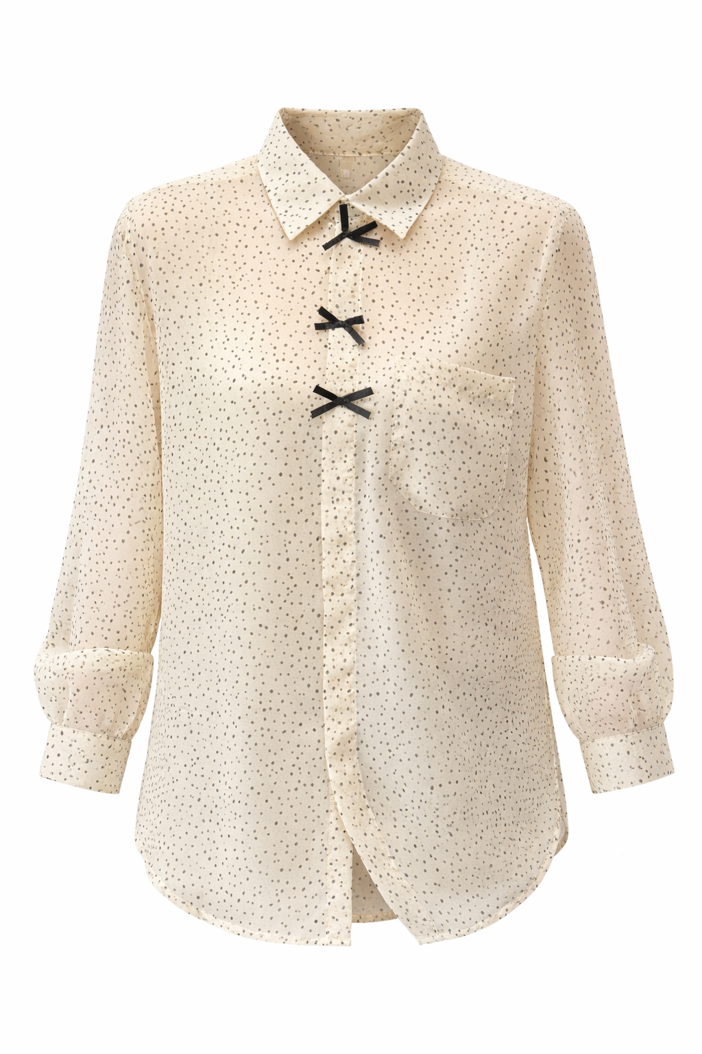 Këmishë pana gjysmë transparente me pika të zeza dhe me fjongo të zeza përpara. Mëngë të gjata dhe prerje fit.