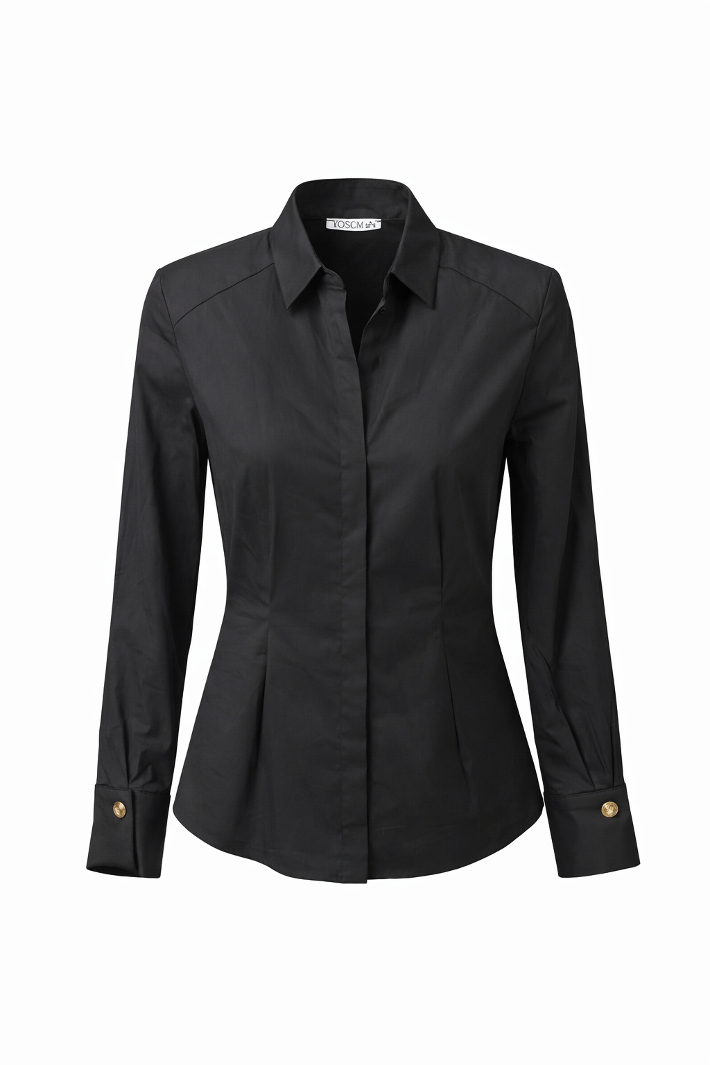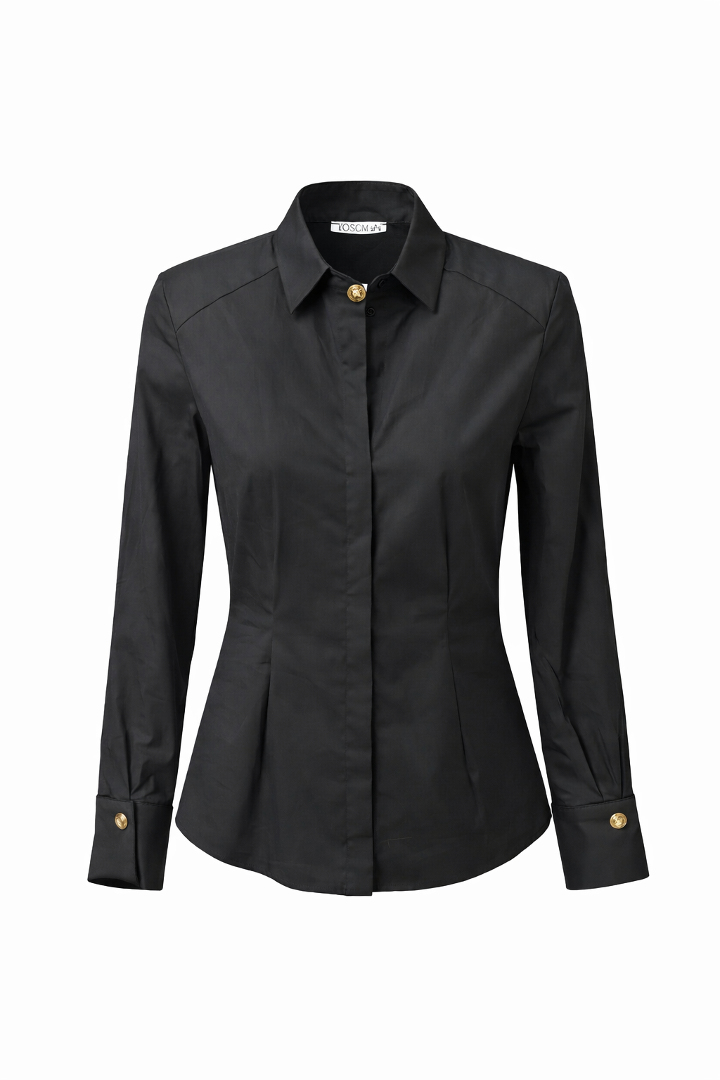 Kemishe e zeze pambuku me vata dhe me pensa te beli. Kopsa gold tek menget dhe tek jaka.