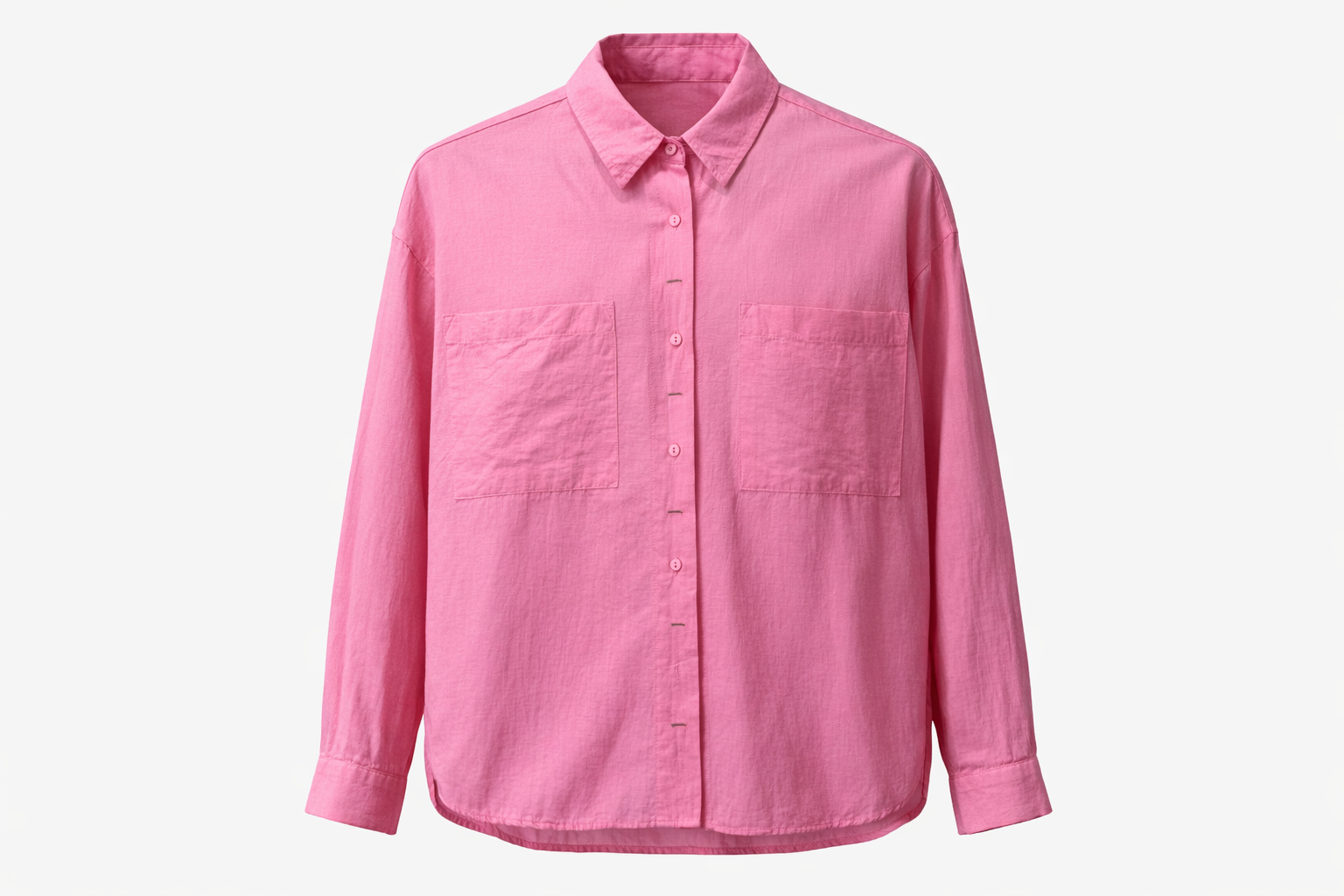 Këmishë pambuk e hollë rozë. Jaka klasike, me dy xhepa përpara.