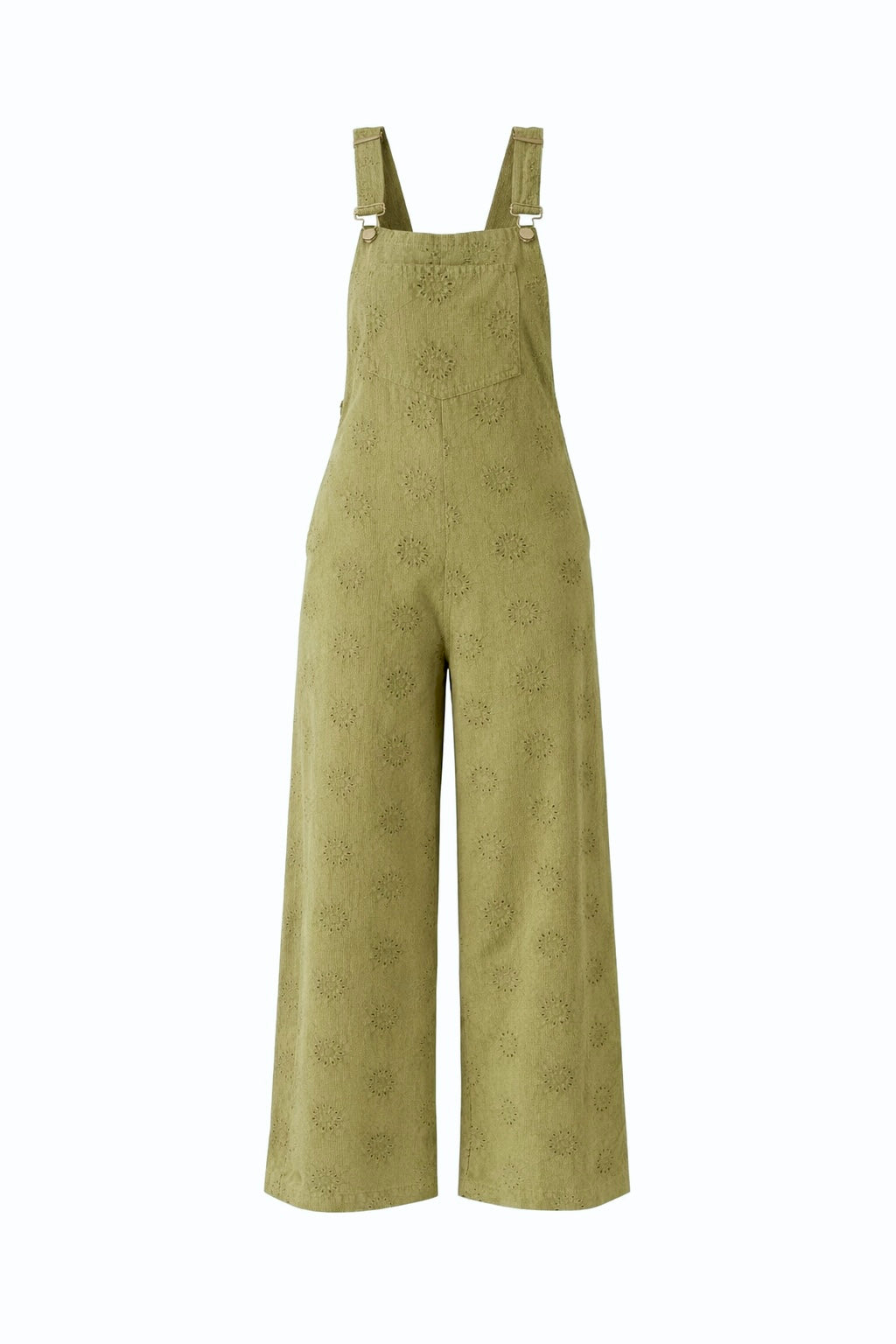 Kominoshe oversize jeshile me lule dantelle te qendisur. Pjesa e pantallonave e gjere, me xhepa mbrapa dhe anash. Xhep i madh perpara tek busti.