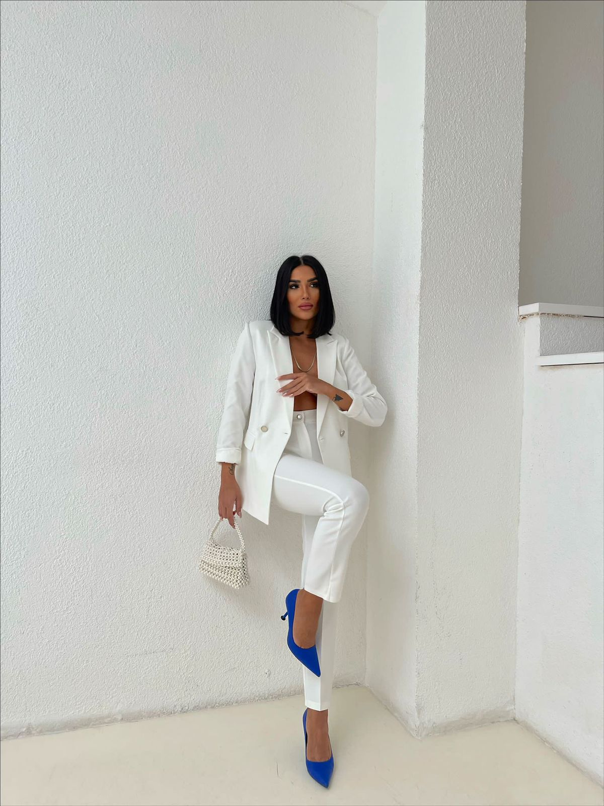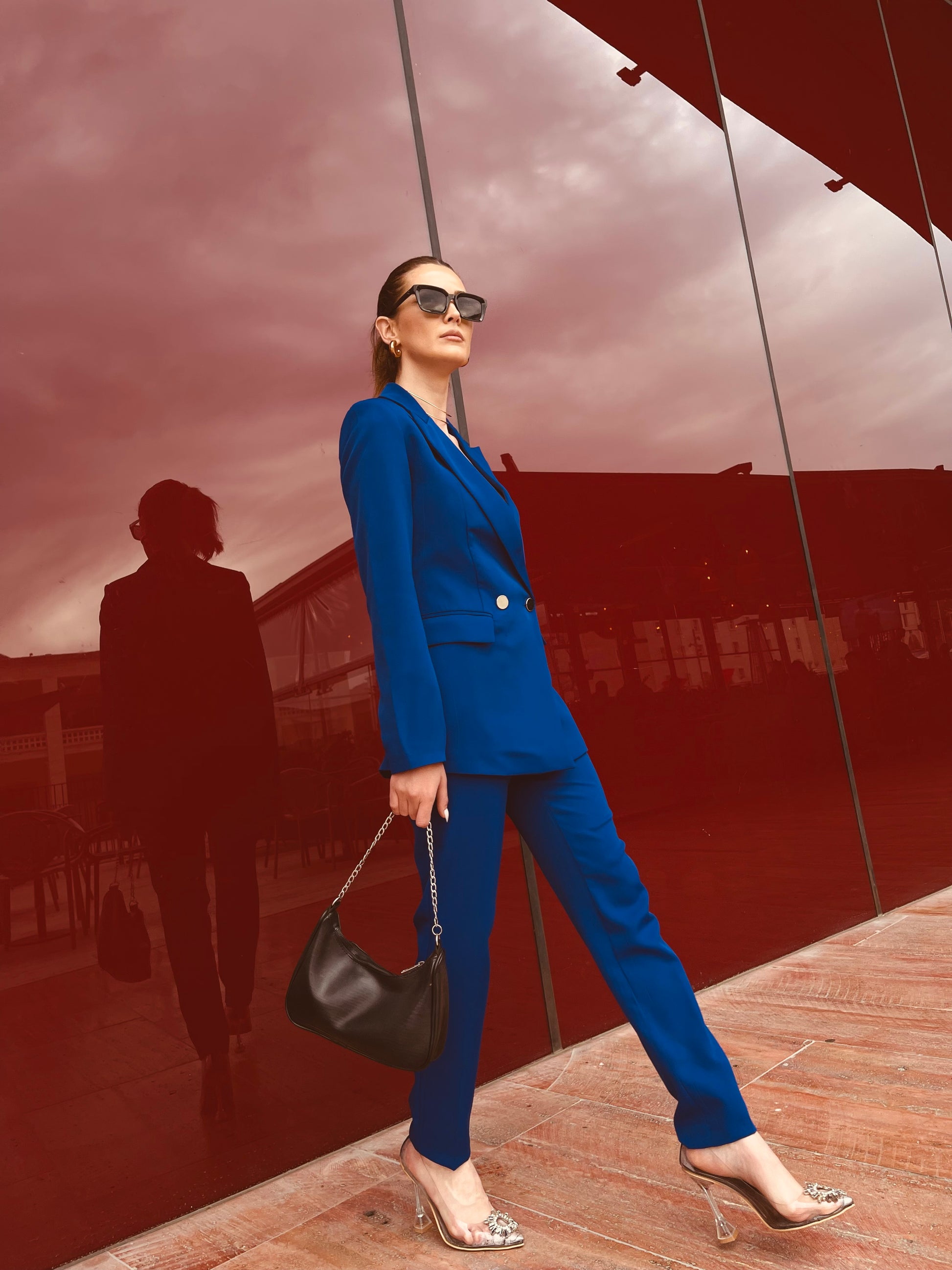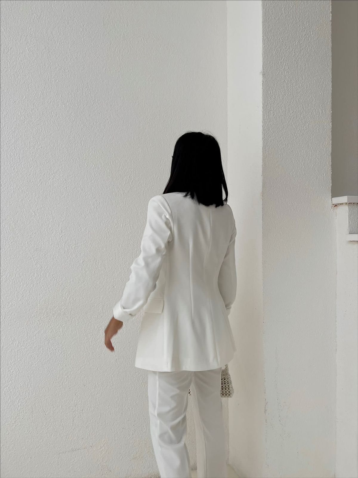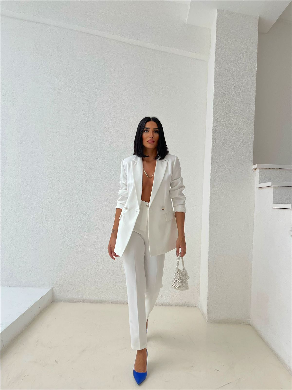 Kostum dopio kopsë në masa të mëdha. Kopsat janë metalike, ngjyrë argjend.