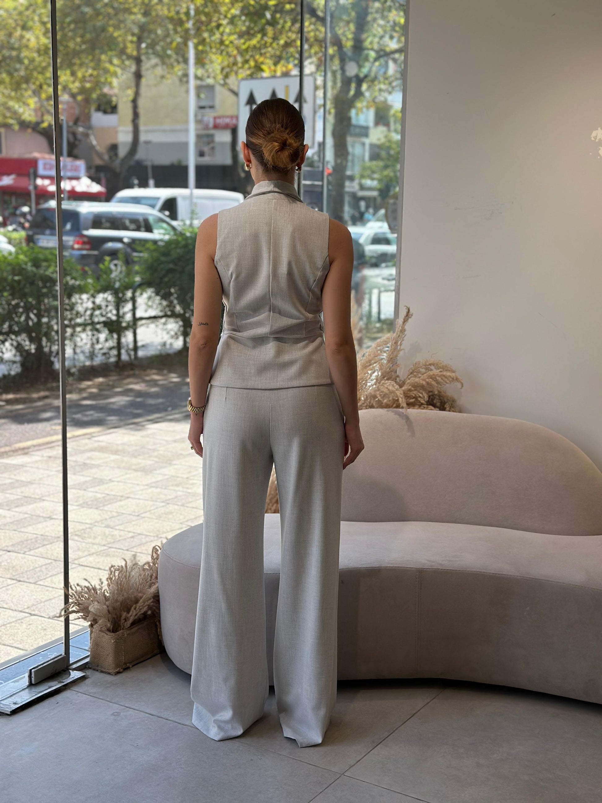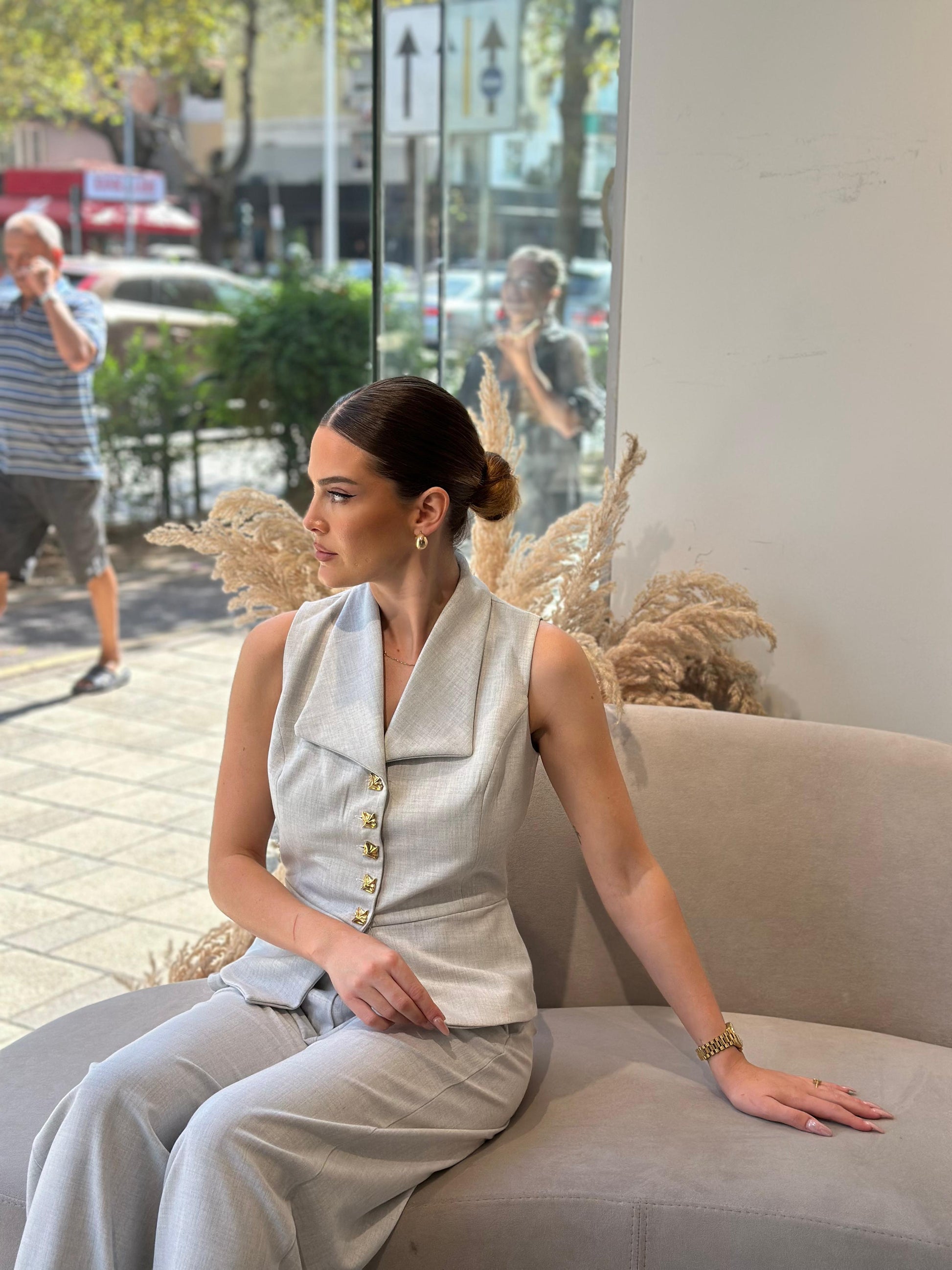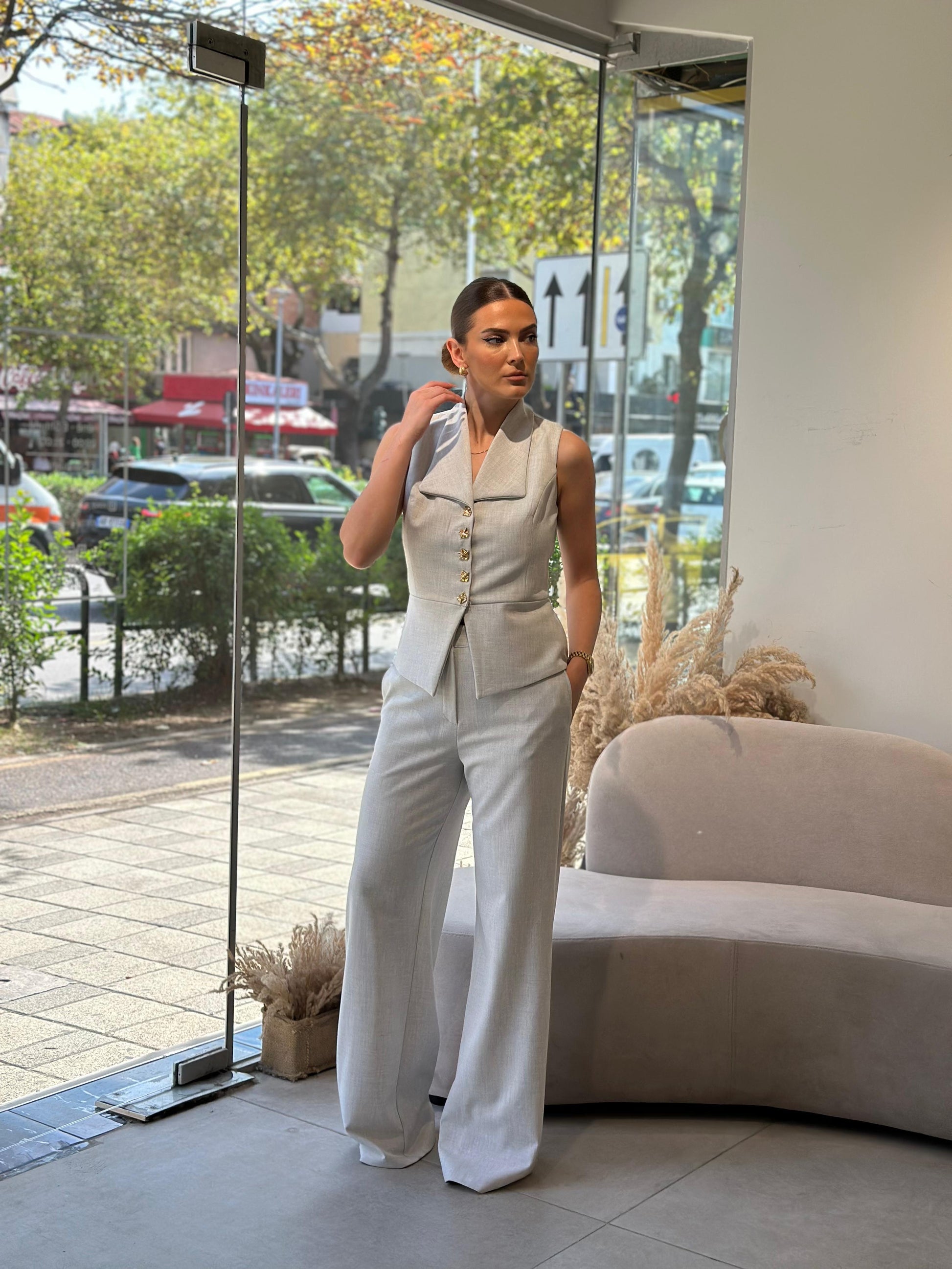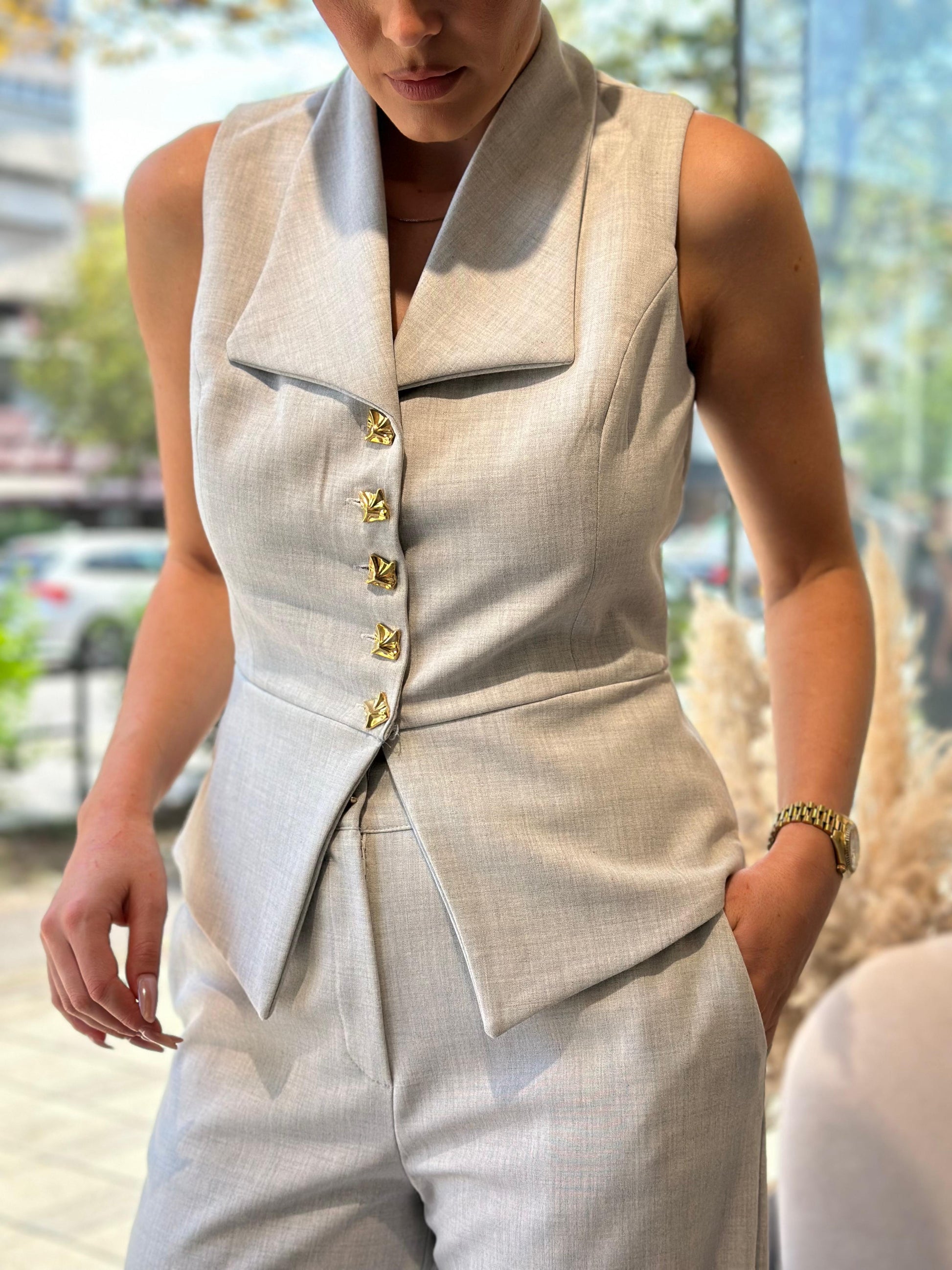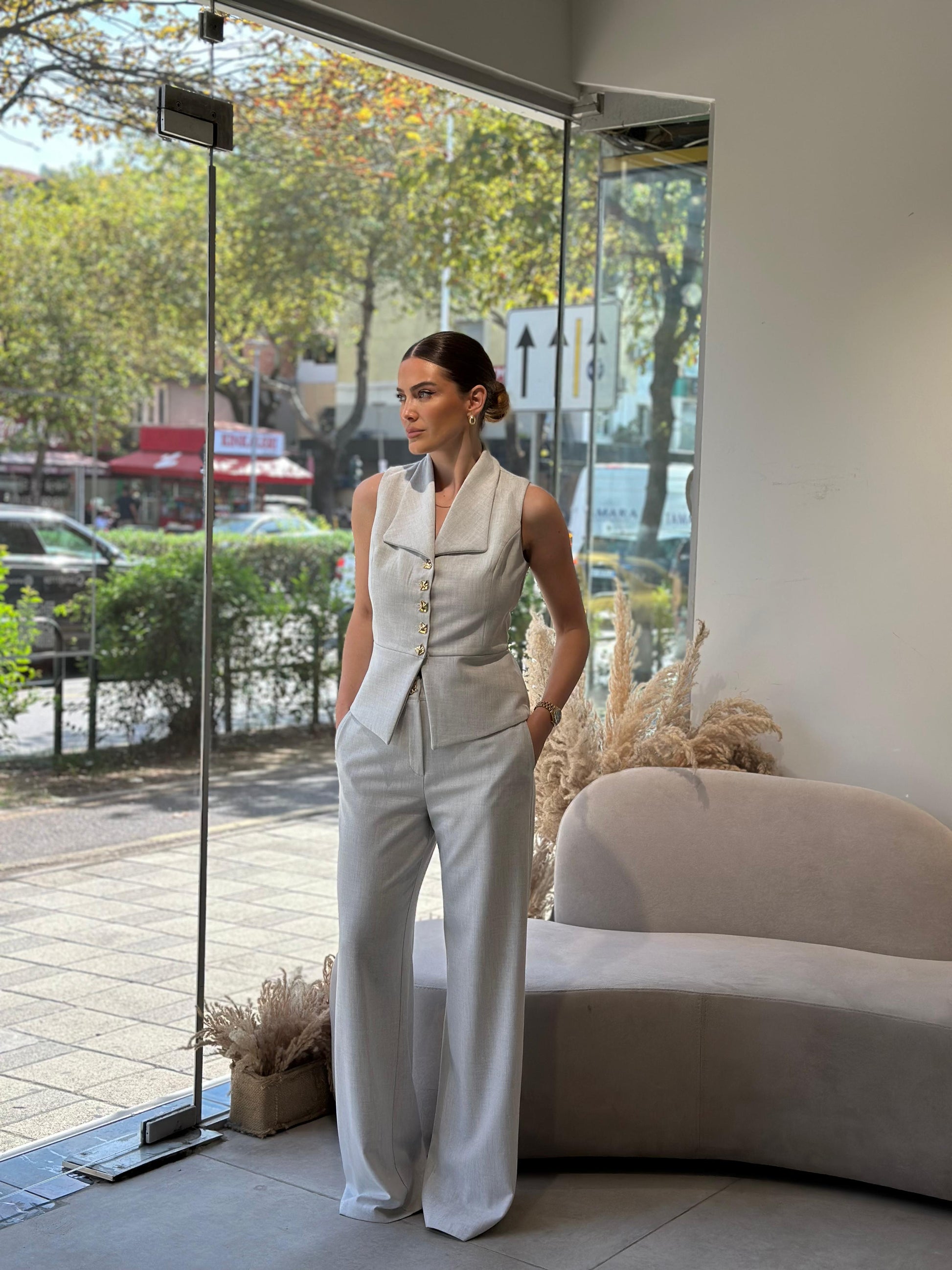 Kostum gri e hapur me jelek dhe pantallona te gjata. Jeleku mberthehet me kopsa perpara. Kopsat jane gold me forme jo te rregullt katrore. Pantallonat stili paralel.