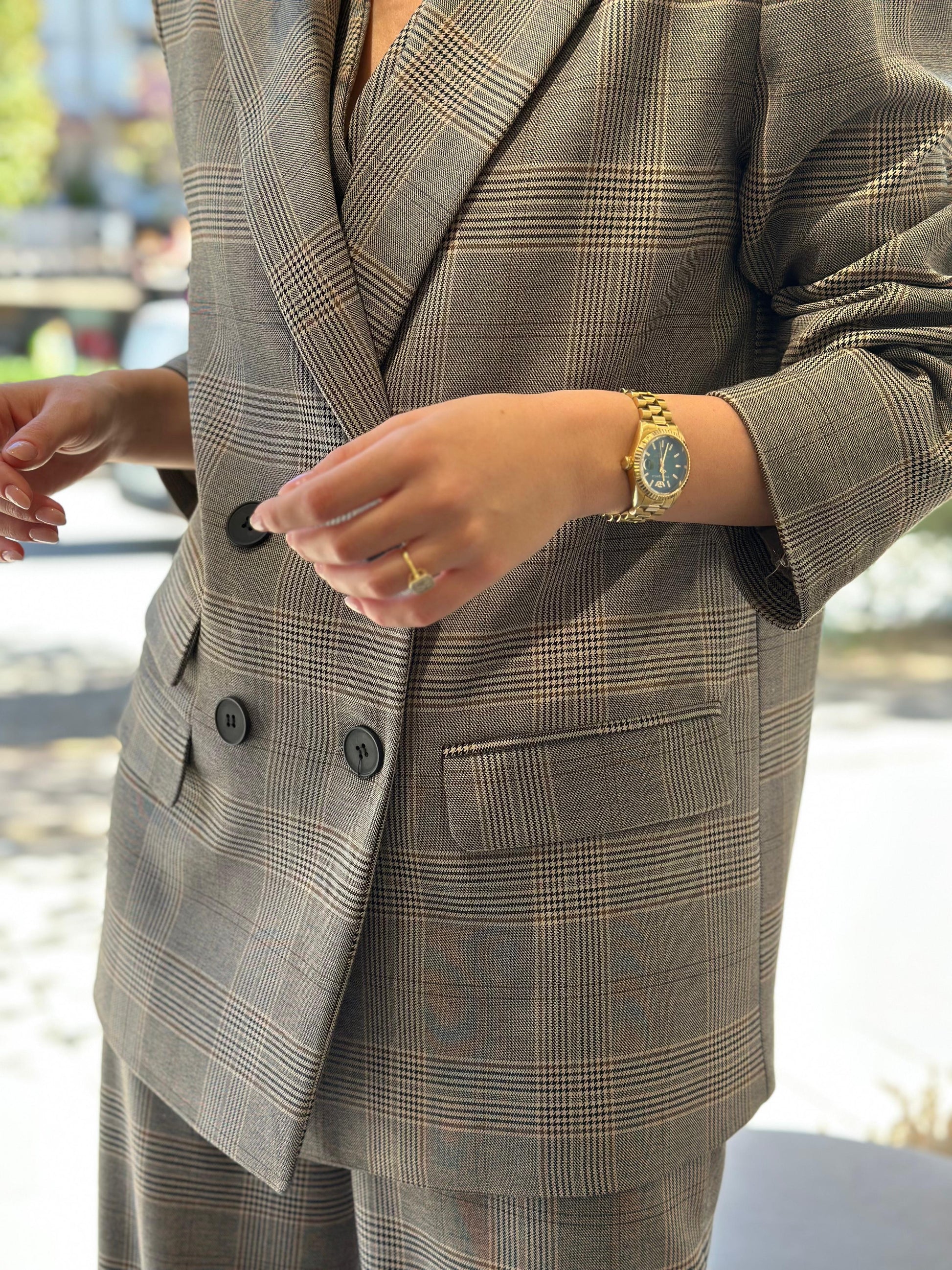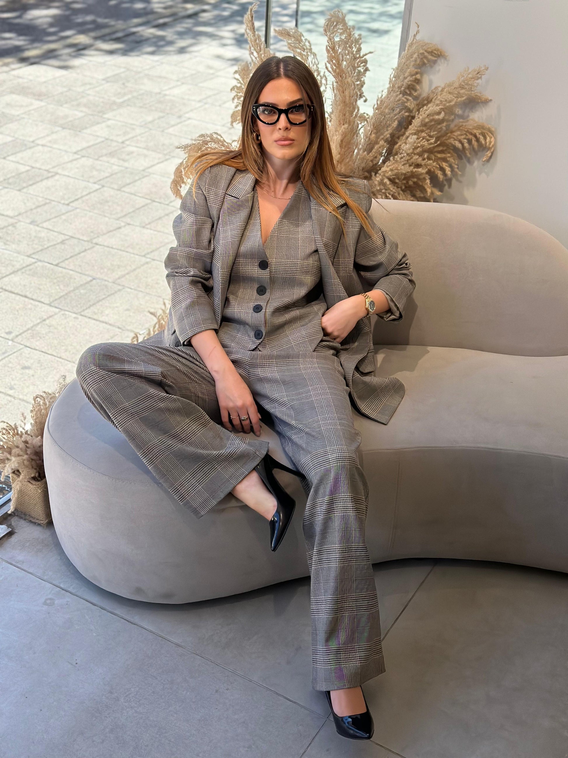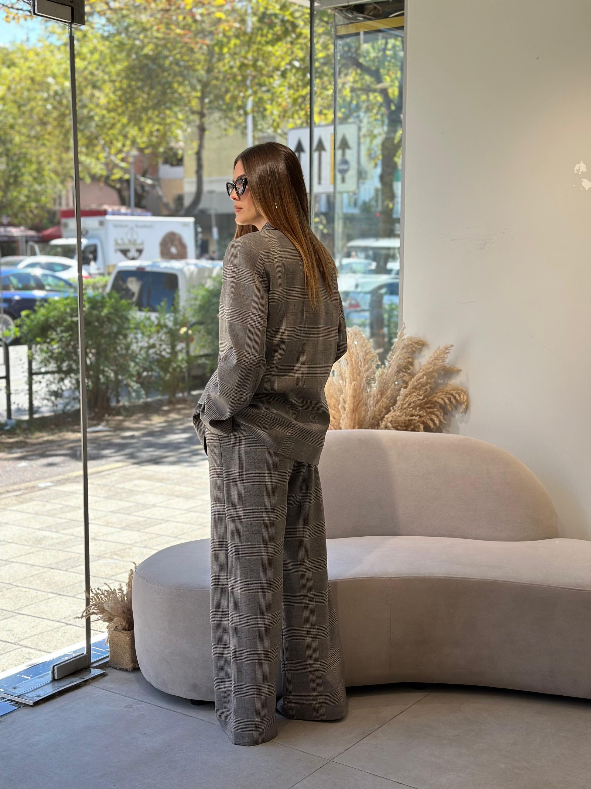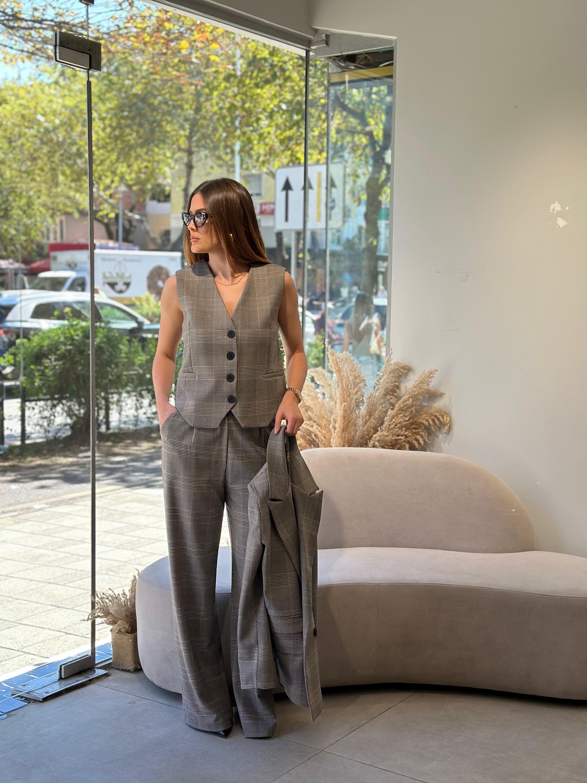 Kustum oversize me 3 pjese - xhakete, jelek, pantallona. Copa me kuadrata te zbehta me nderrhurje ngjyrash gri dhe bezhe.