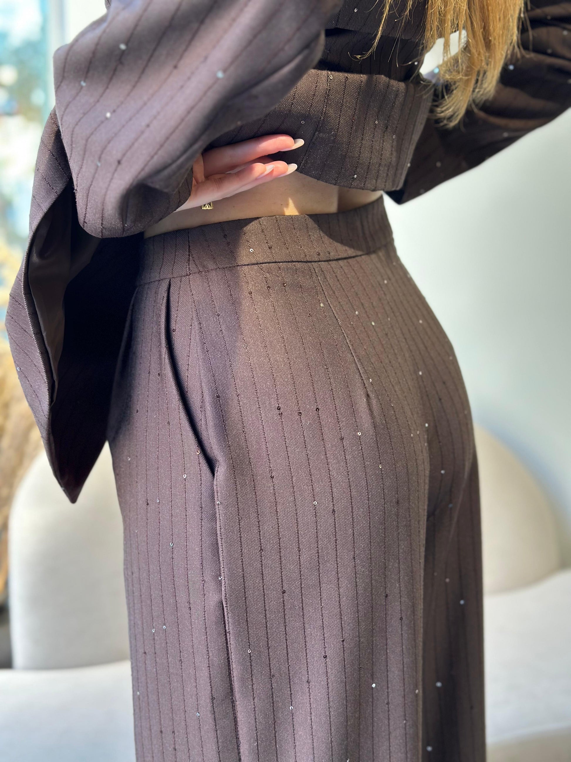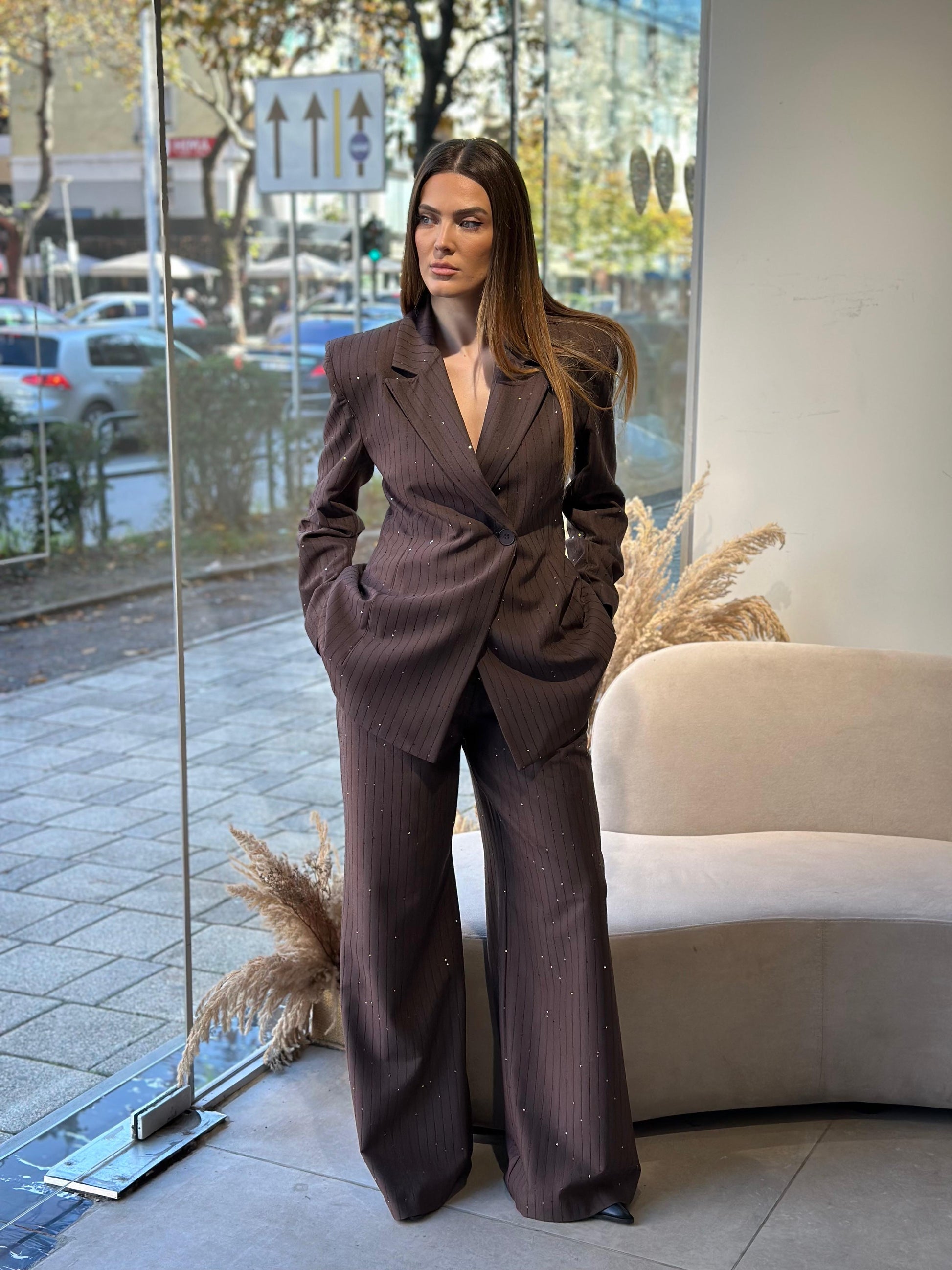 Kostum ne ngjyre kafe me xhakete me bel dhe pantallona te gjera. Copa me vije te holle fine dhe temina te rralla minimaliste ne ngjyre kafe. I pershtatshem per evente festive fundviti.