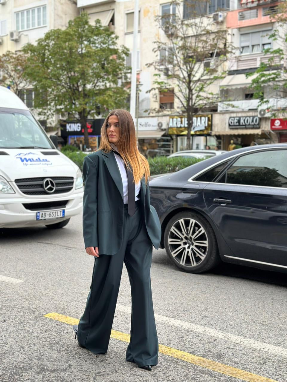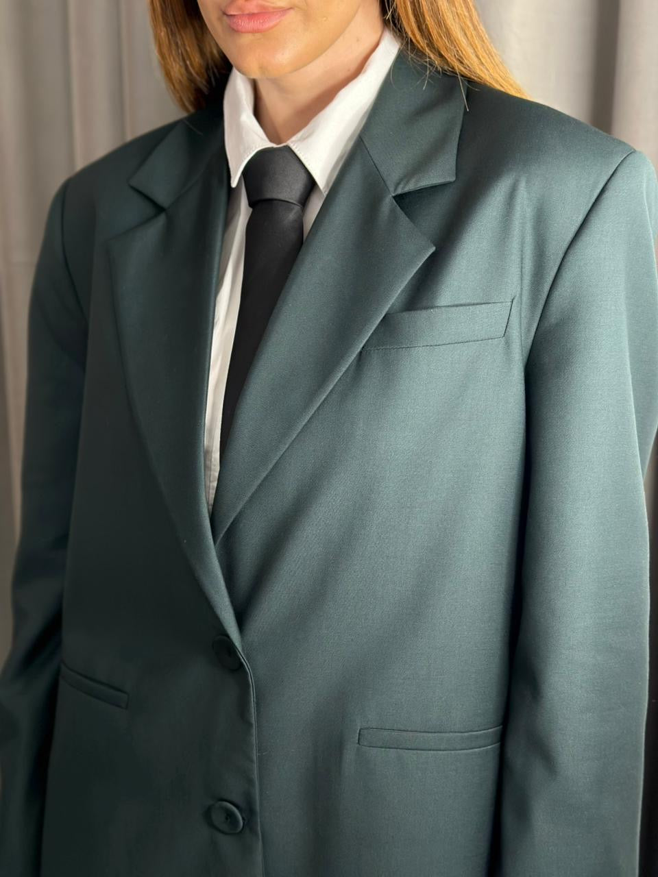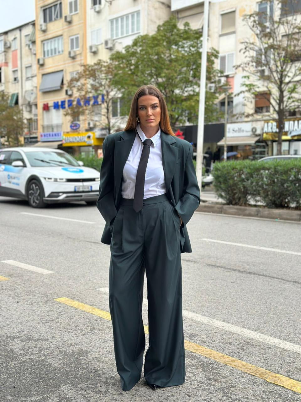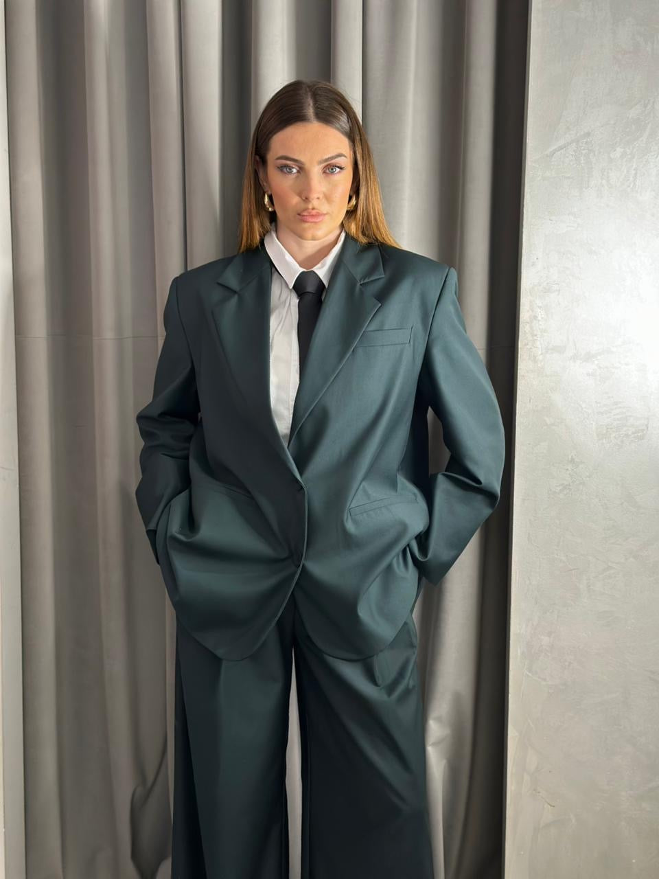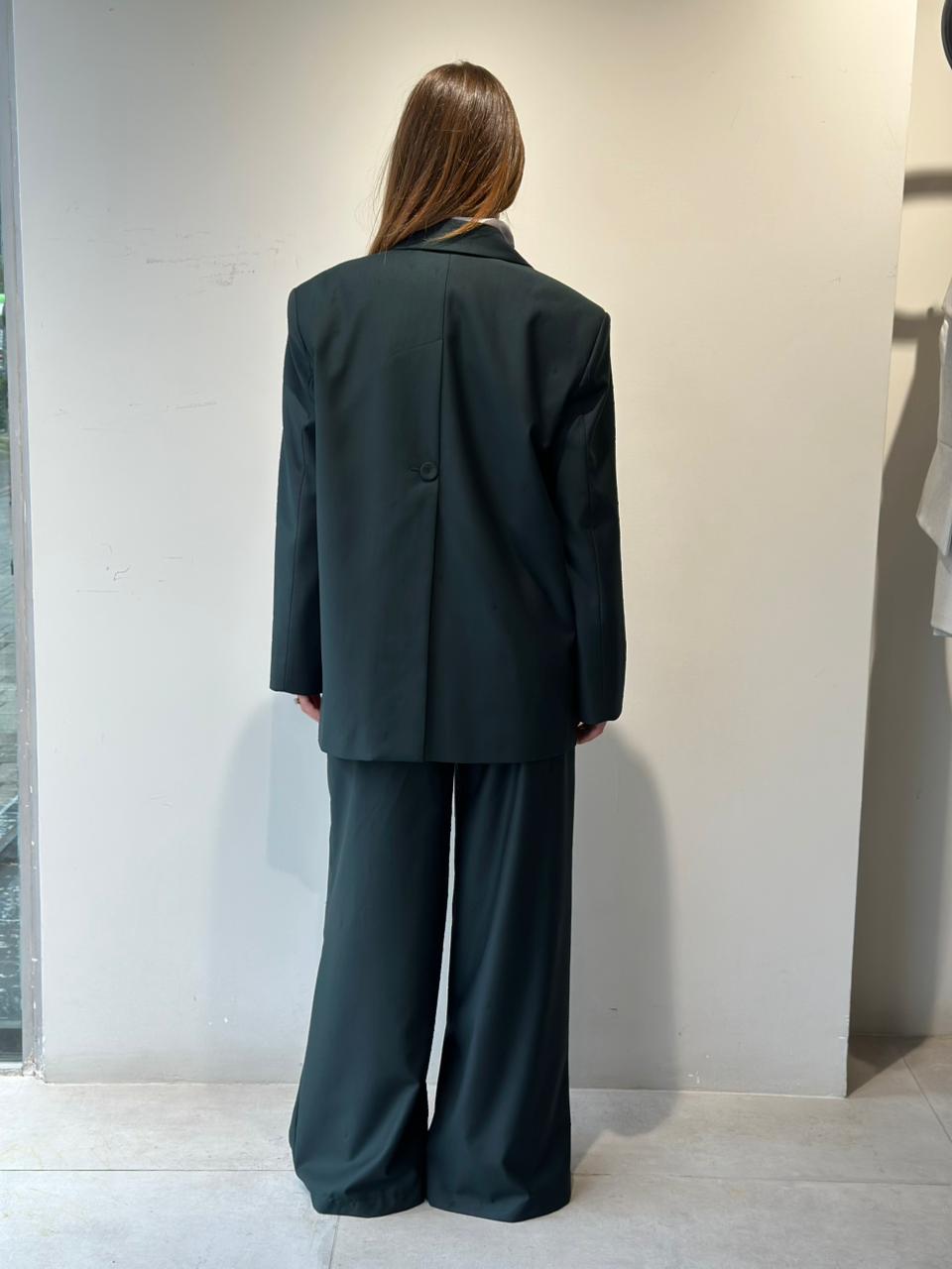 Kostum oversize per femra. Cilesia premium. Xhaketa me supe te medha oversize dhe e gjere. Pantallonat stil i gjere me pensa perpara dhe xhepa anash.