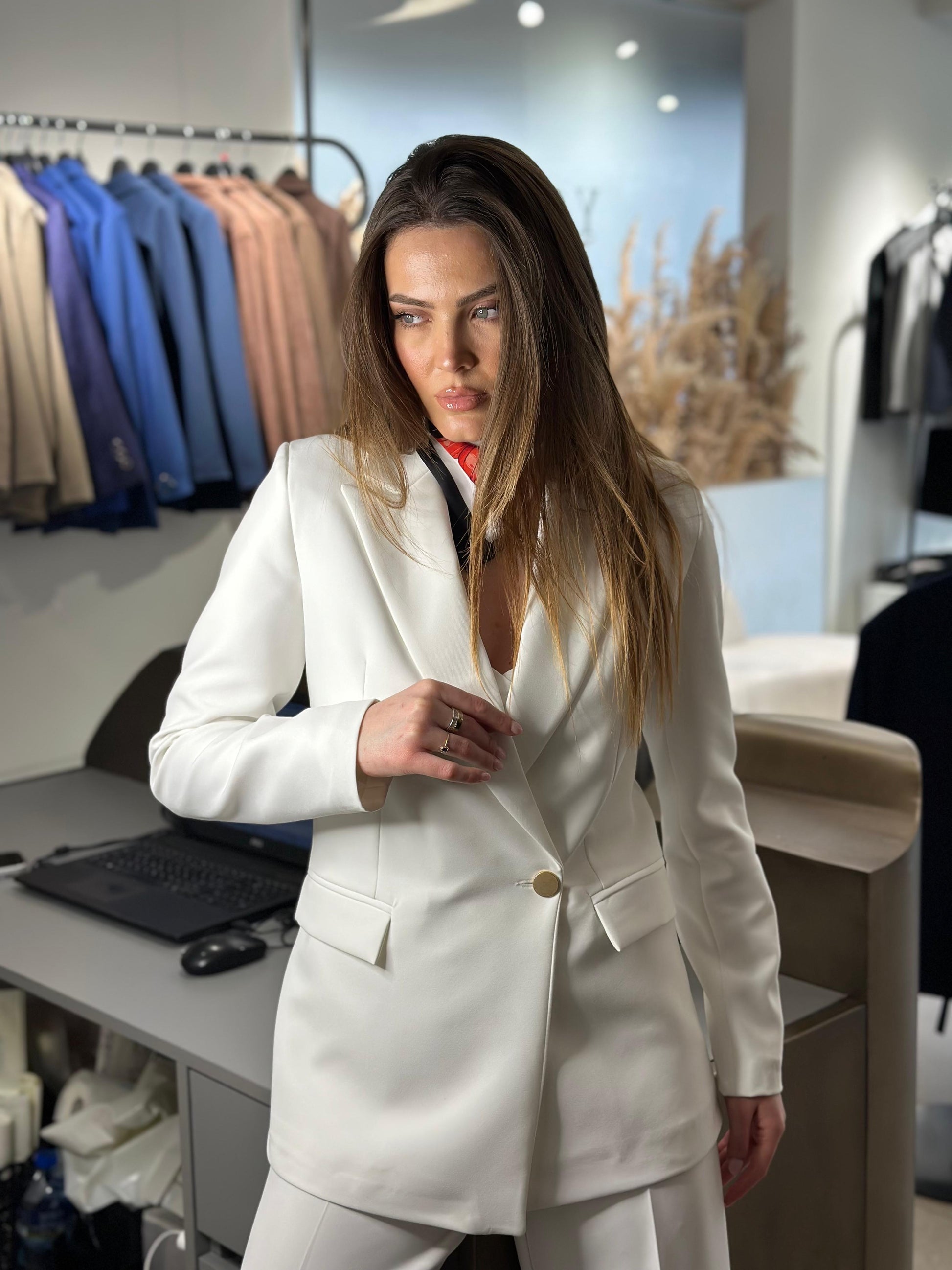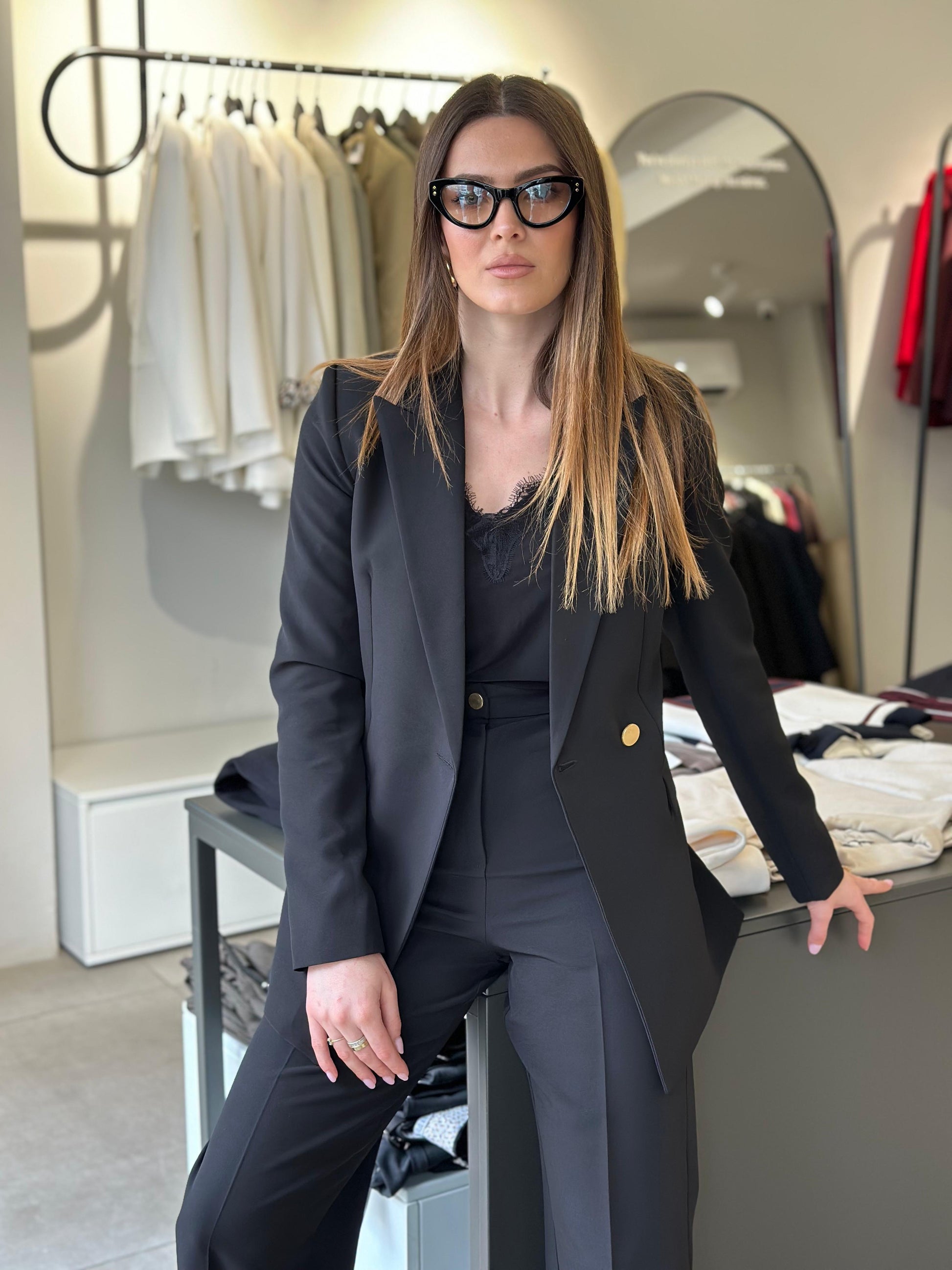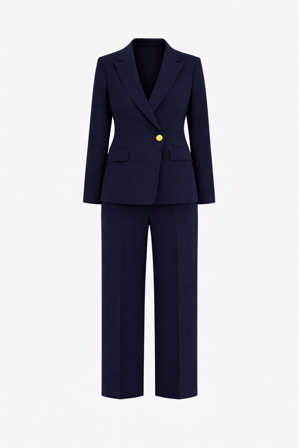 Kostum me xhakete me prerje te drejte dhe pantallona paralel te drejta. Xhaketa me kopse gold. Cope e plote, xhaketa me frazeline e gjitha.