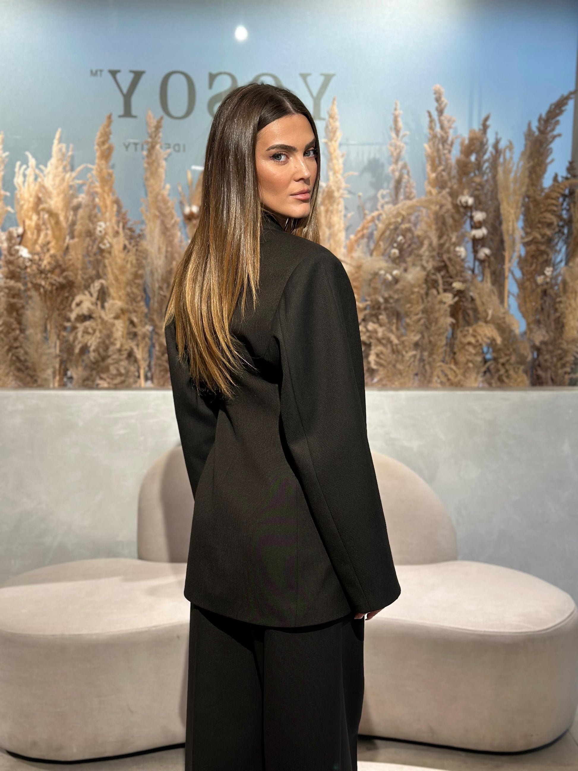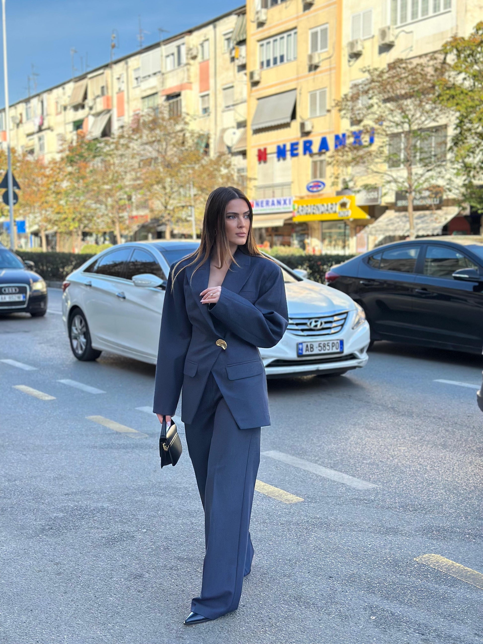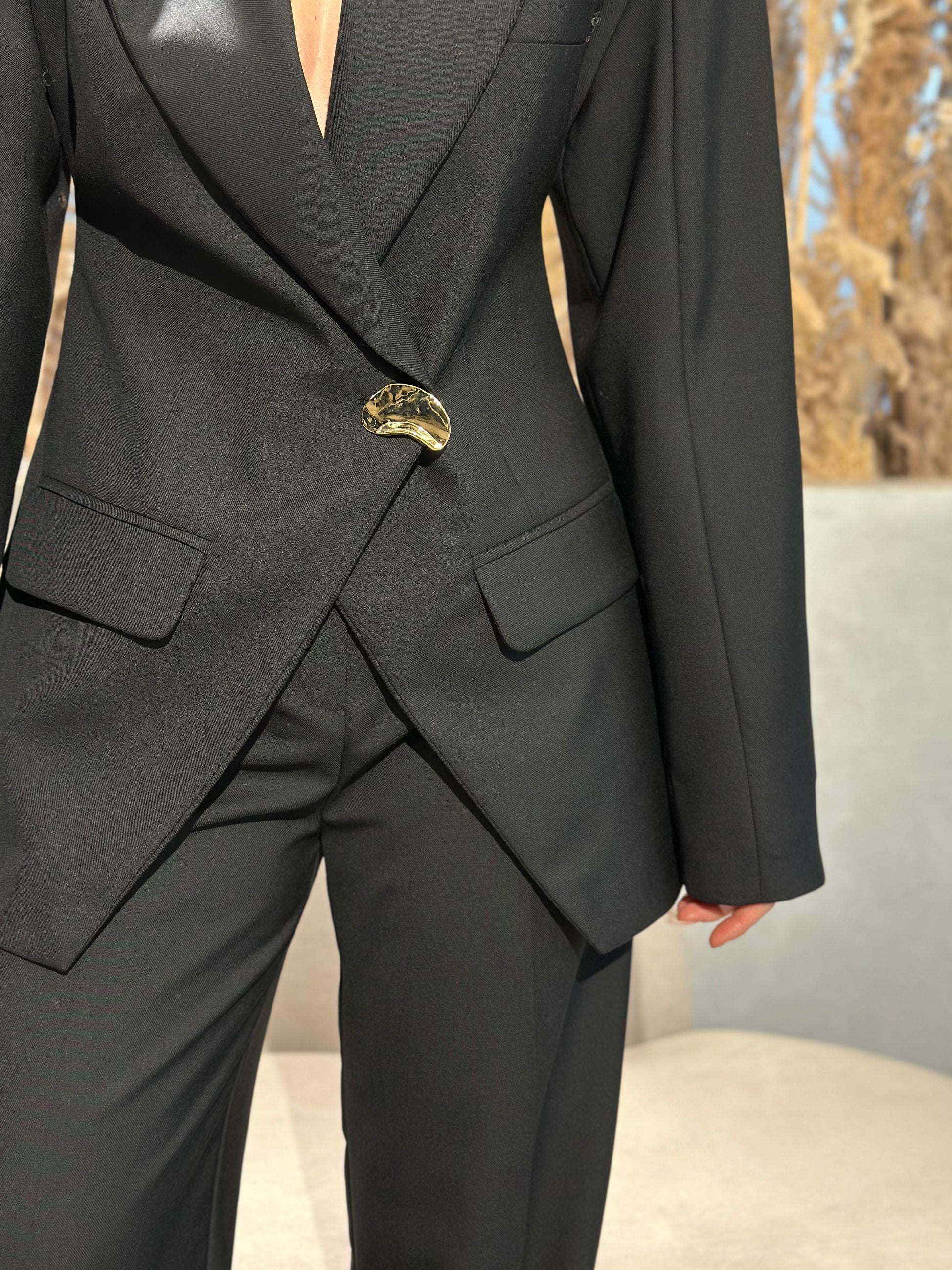 Kostum me xhakete me bel dhe pantallona te gjata. Xhaketa e gjate dhe me pak hapje ne fund. Mberthehet nga nje kopse gold asimetrike.