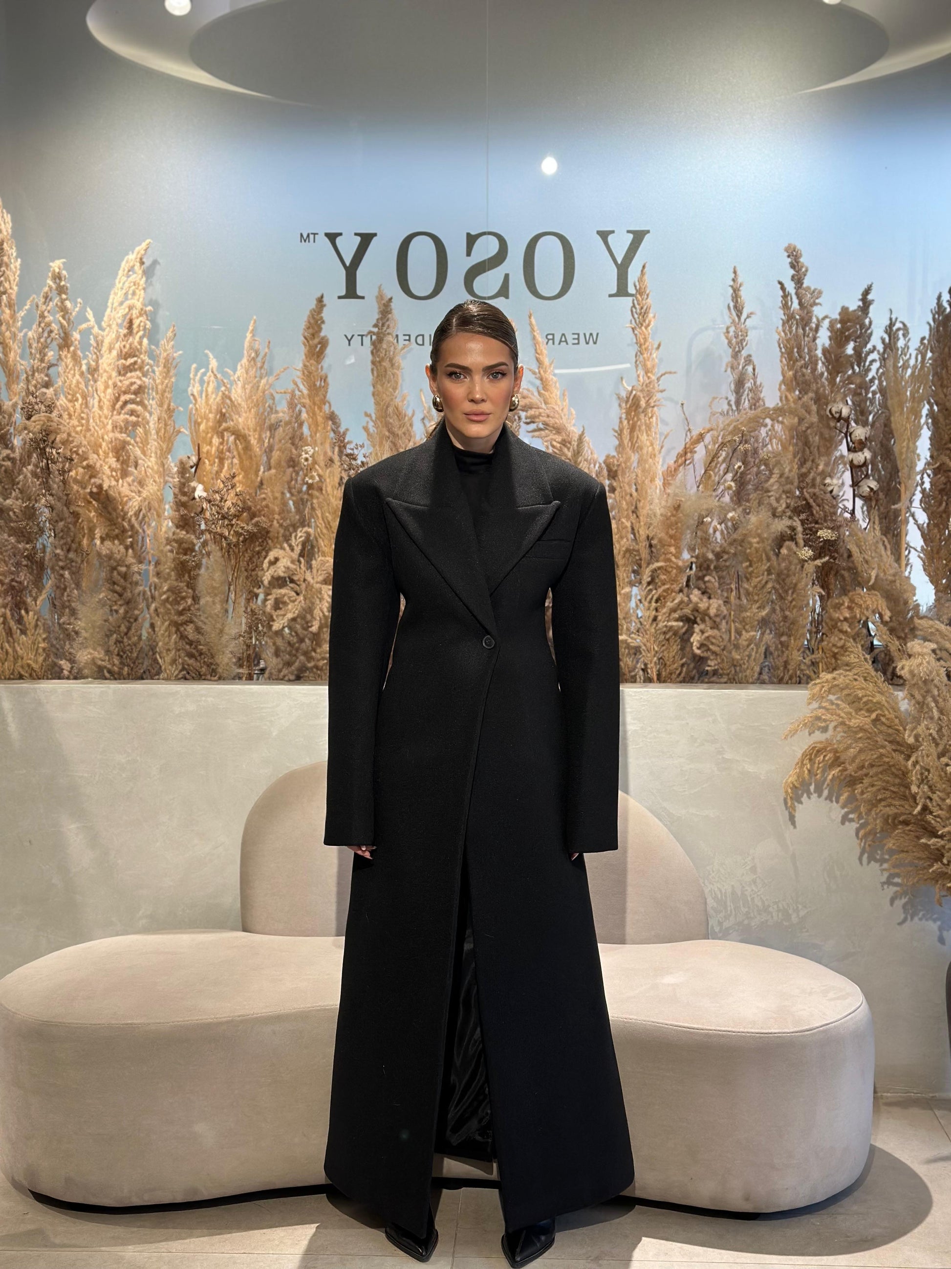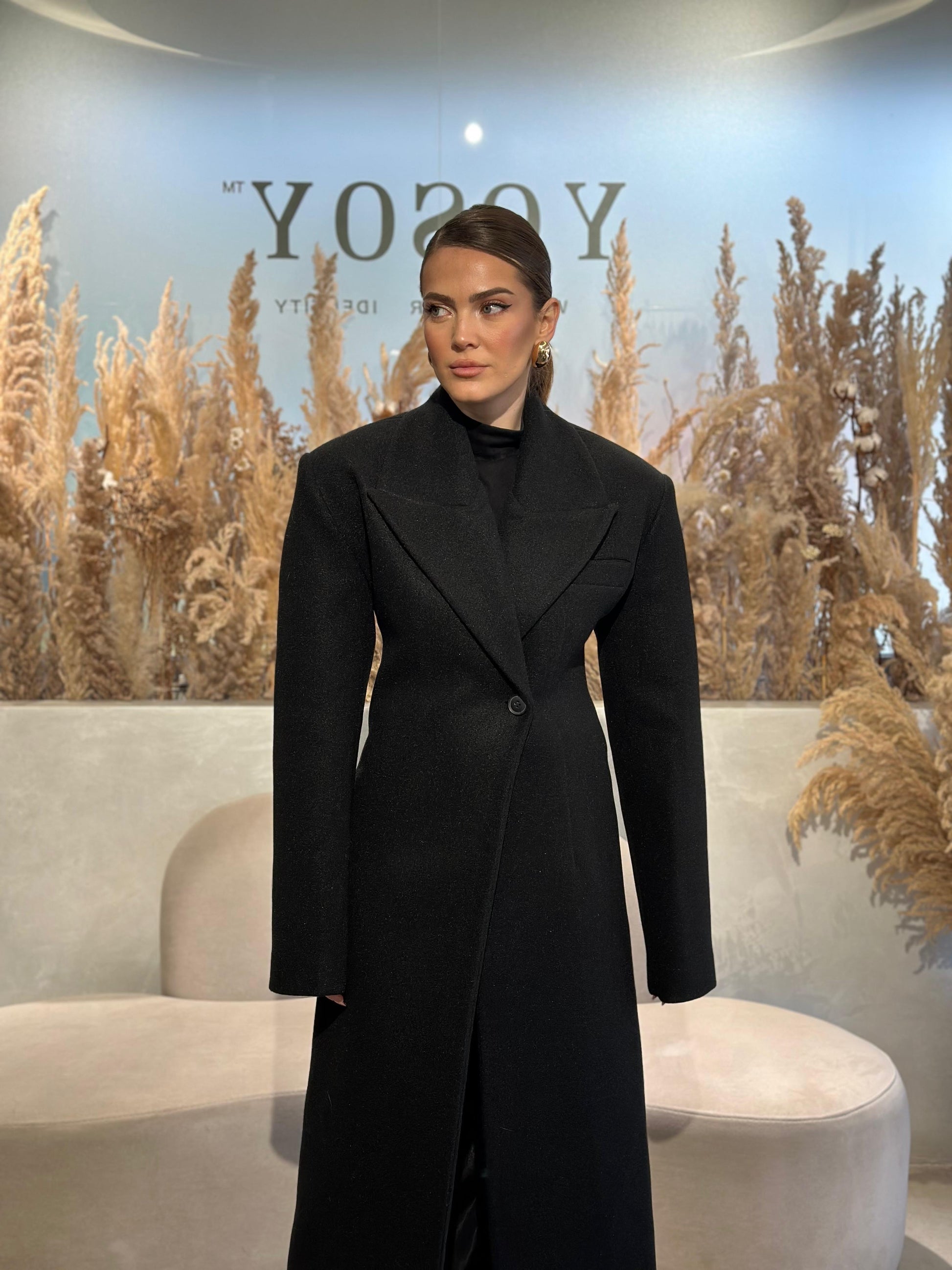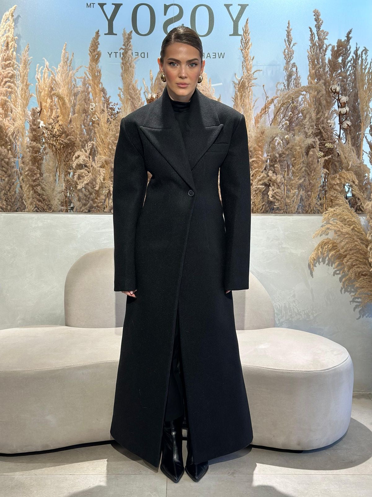 Pallto oversize e gjate me forma minimaliste te theksuara. Kopsa e vetme, i thekson belin.