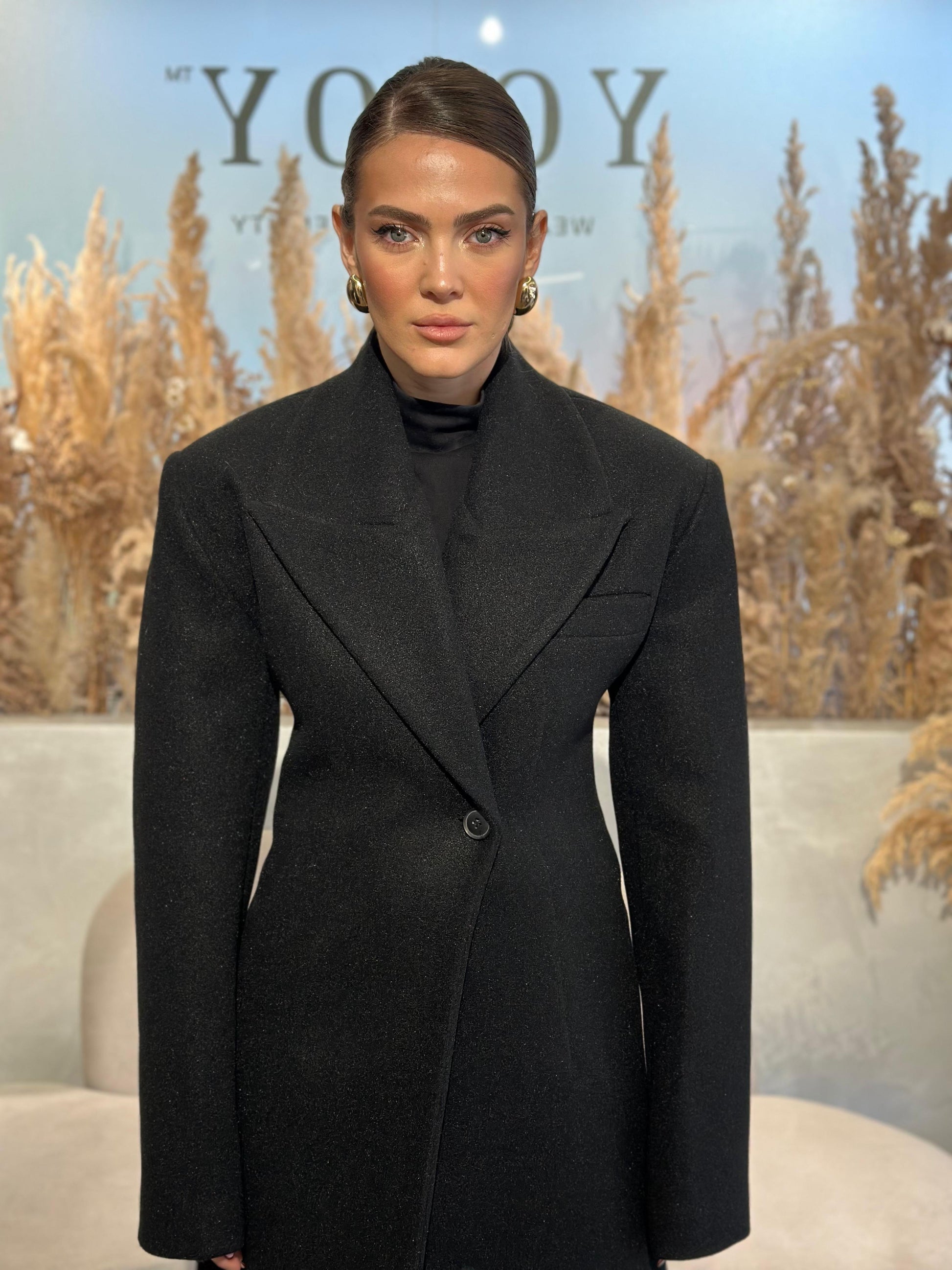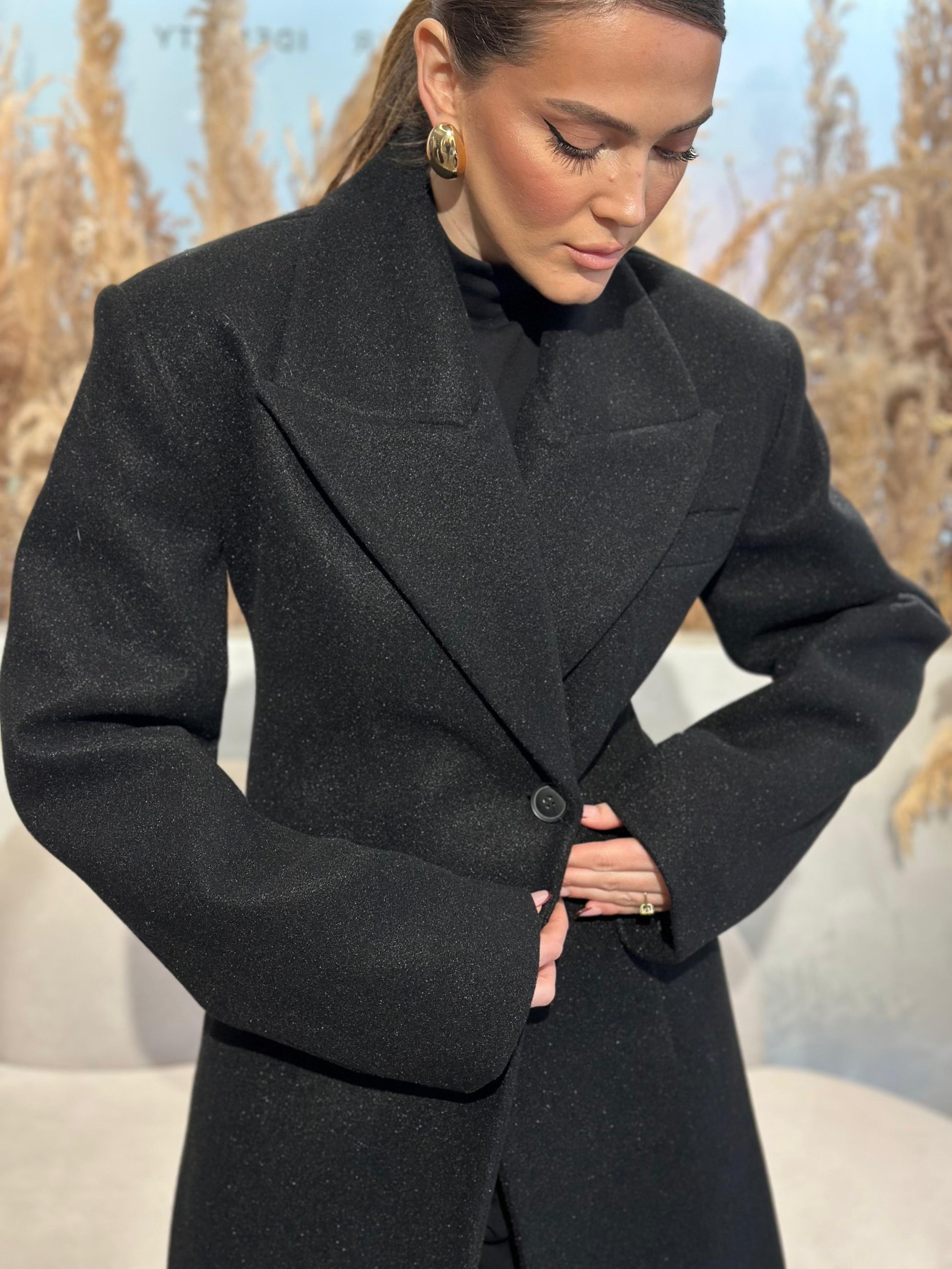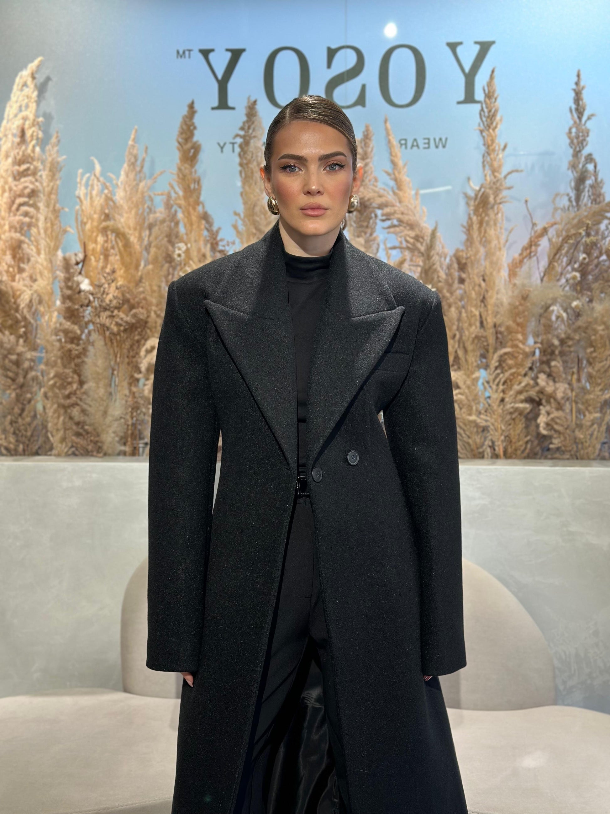 Pallto oversize e gjate me forma minimaliste te theksuara. Kopsa e vetme, i thekson belin.