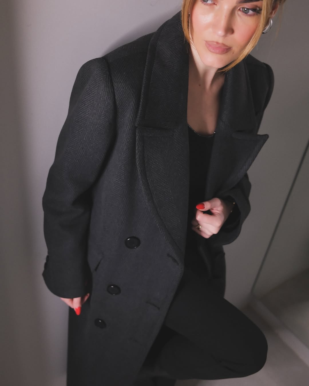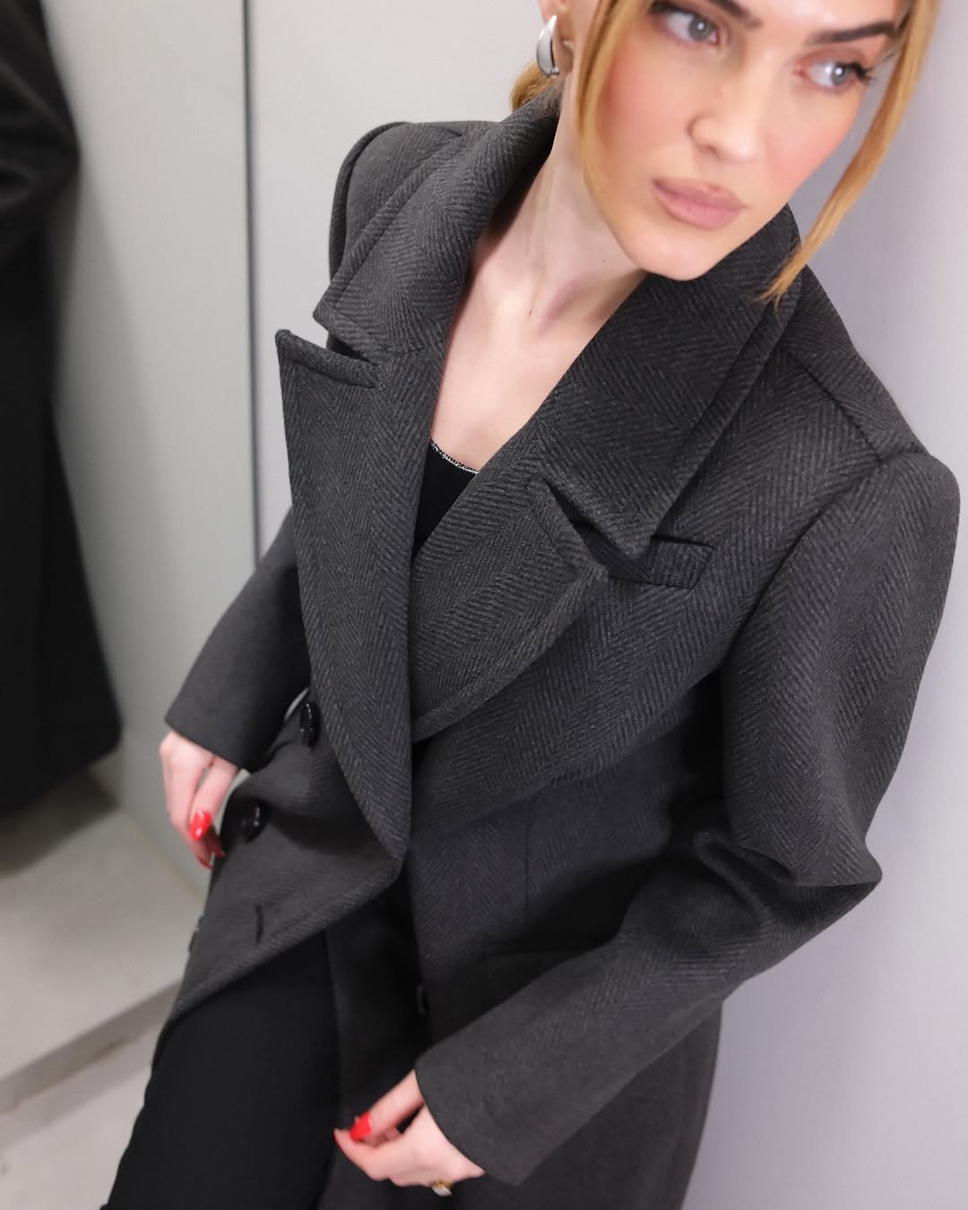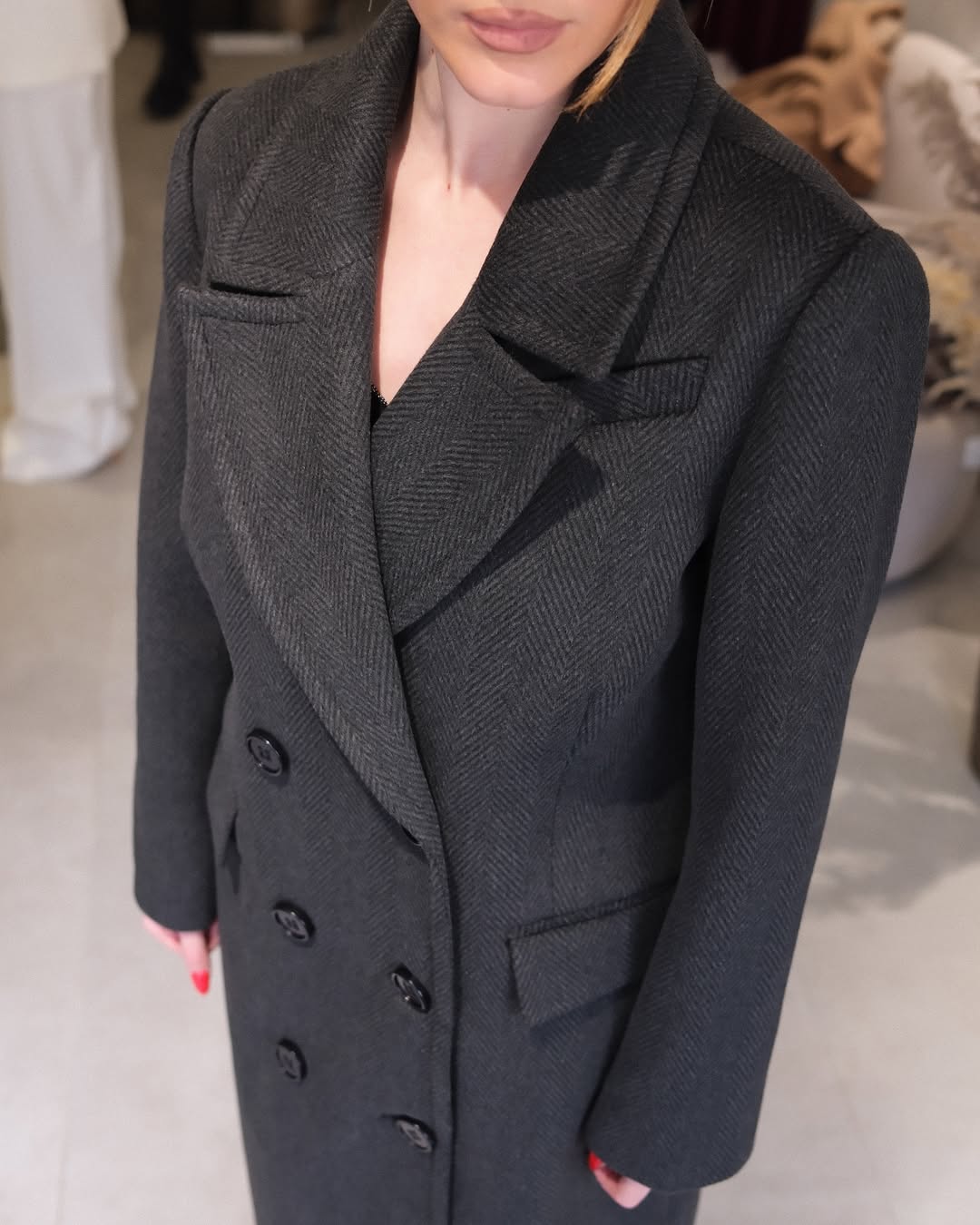 Pallto e trashe me astar dhe me lidhje ne mes. Ka 6 kopsa dhe shoqerohet me kopsa ekstra ne ngjyre qe pershtatet me ngjyren e palltos. Copa eshte me vija te zbehta.
