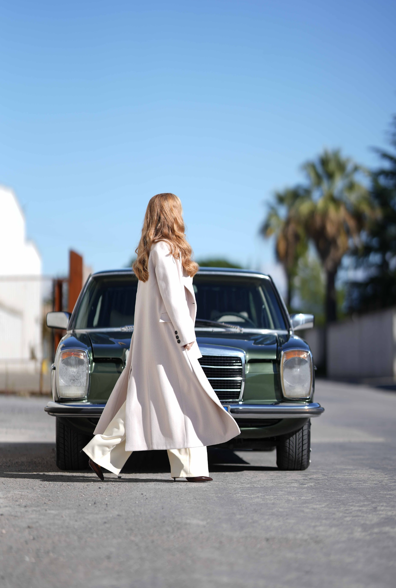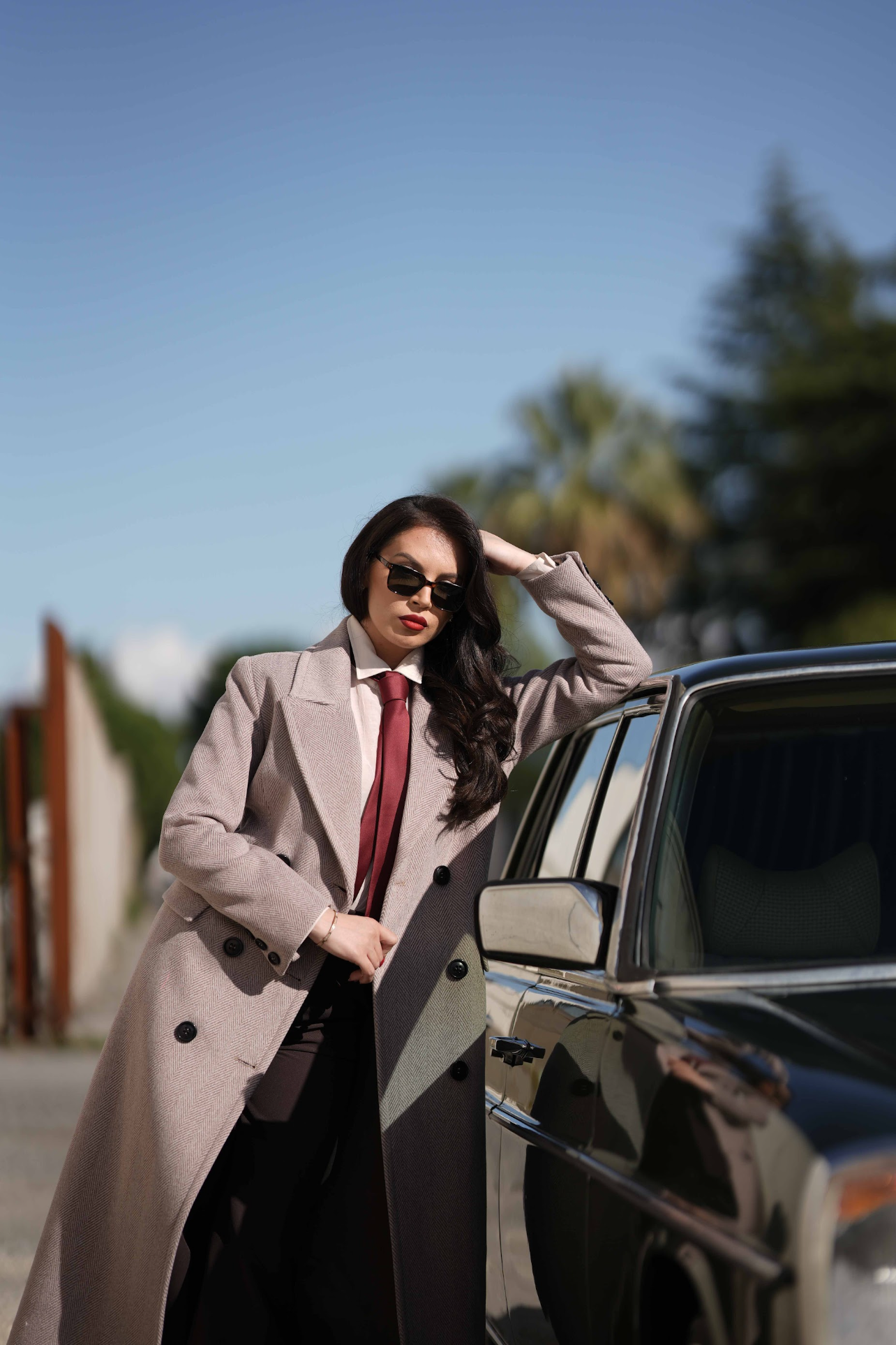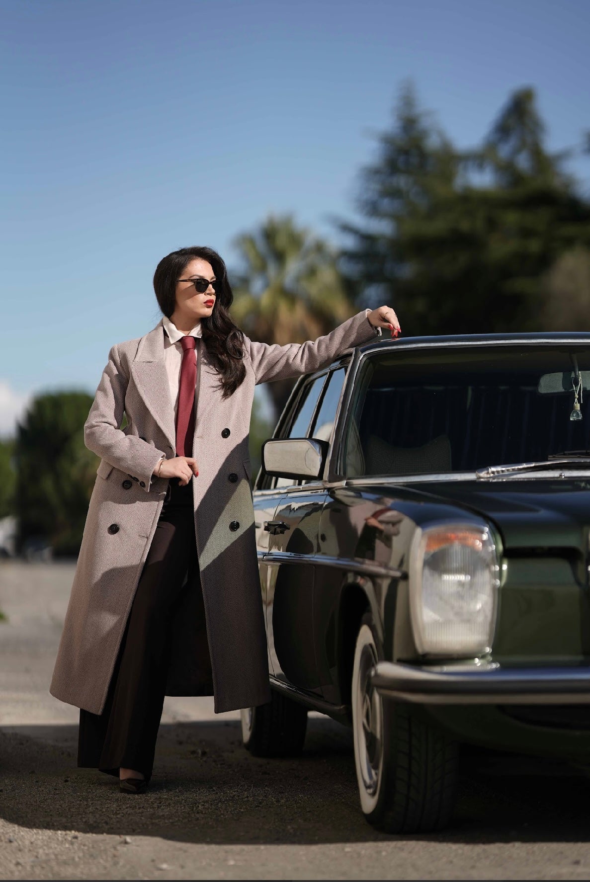Pallto e trashe me astar dhe me lidhje ne mes. Ka 6 kopsa dhe shoqerohet me kopsa ekstra ne ngjyre qe pershtatet me ngjyren e palltos. Copa eshte me vija te zbehta.