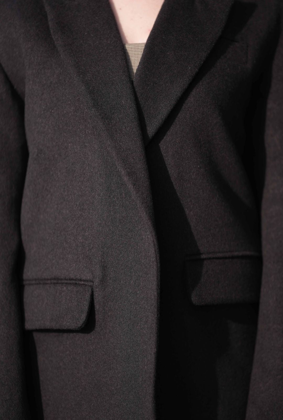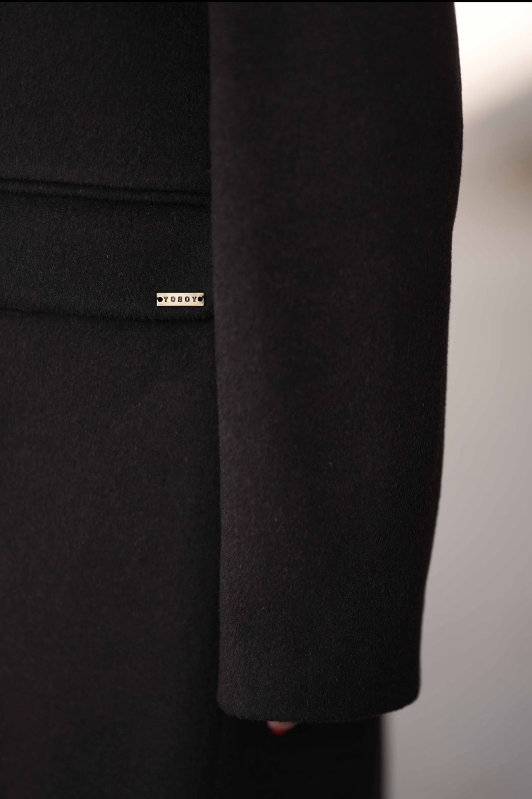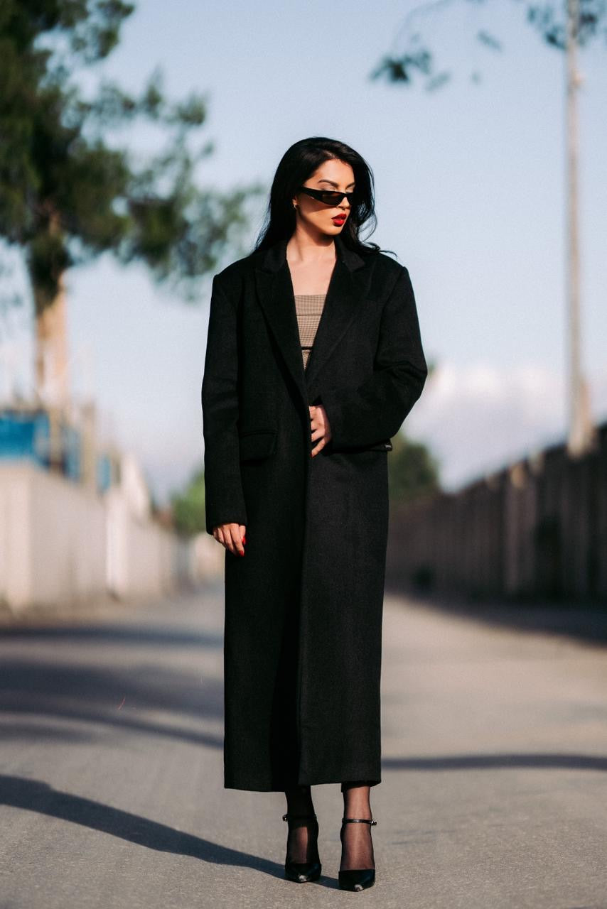 Pallto oversize e gjate me forma minimaliste te theksuara. Pa kopsa dhe me nje te care te gjate nga pas. Material i leshte dhe i plote per dimer, me nje cilesi premium. Ngjyra kafe e erret ka cerka te holla ne kafe te celet.
