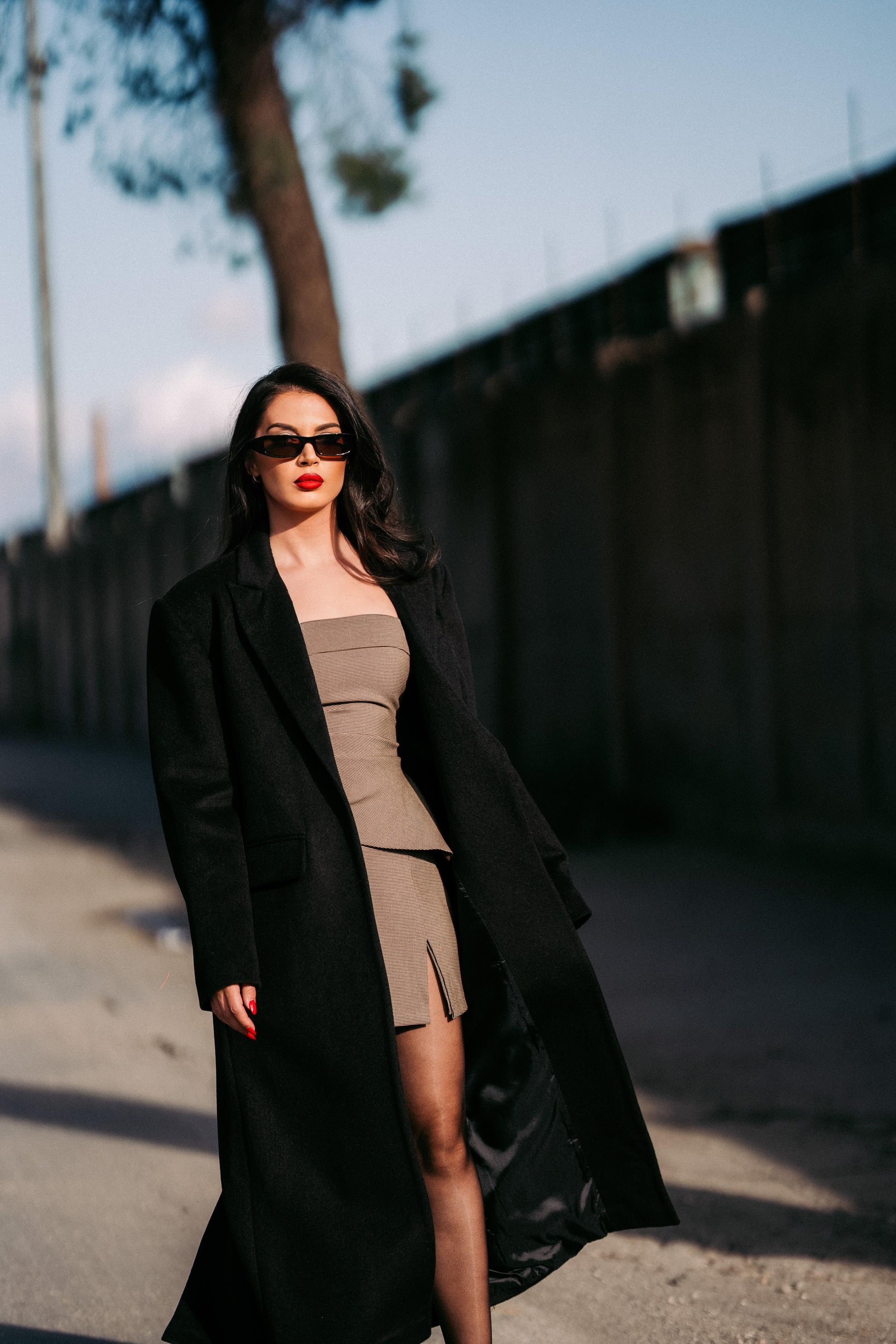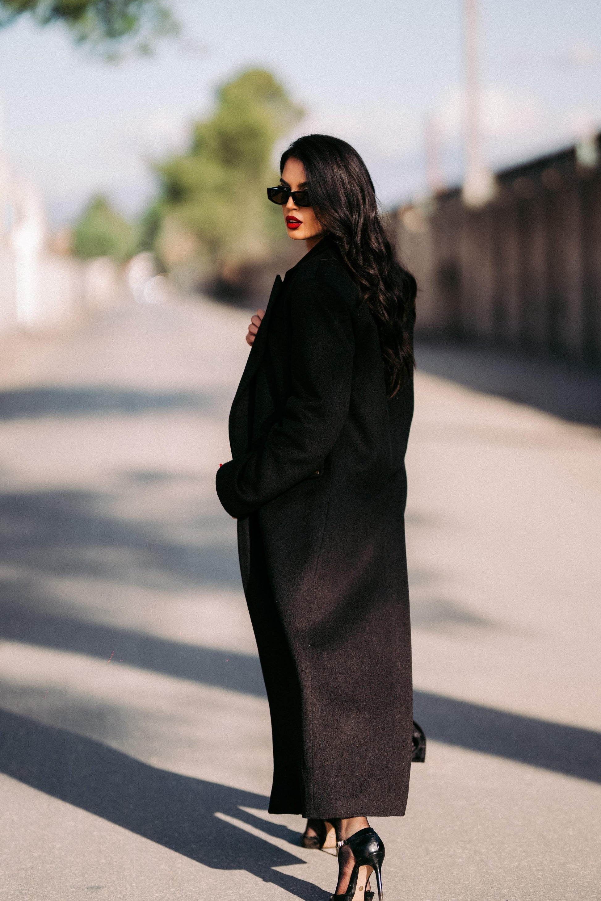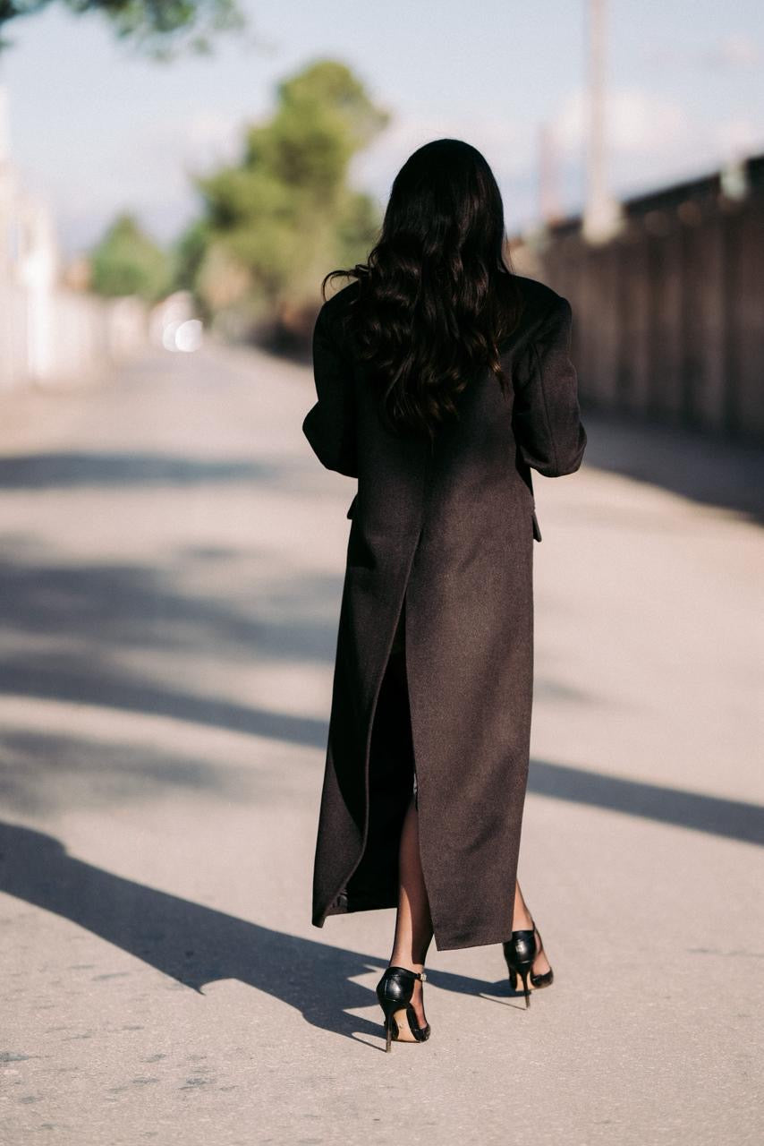 Pallto oversize e gjate me forma minimaliste te theksuara. Pa kopsa dhe me nje te care te gjate nga pas. Material i leshte dhe i plote per dimer, me nje cilesi premium. Ngjyra kafe e erret ka cerka te holla ne kafe te celet.