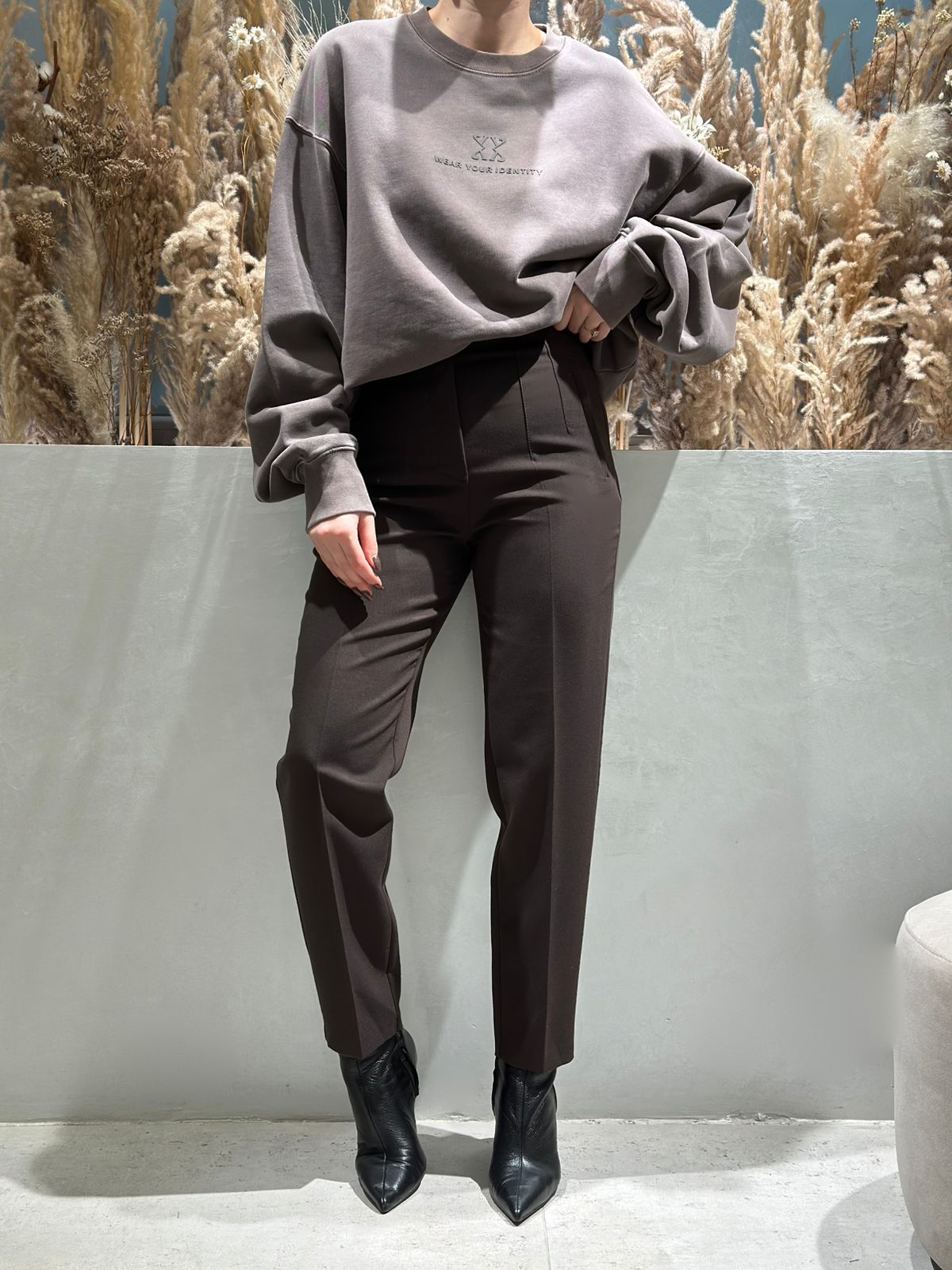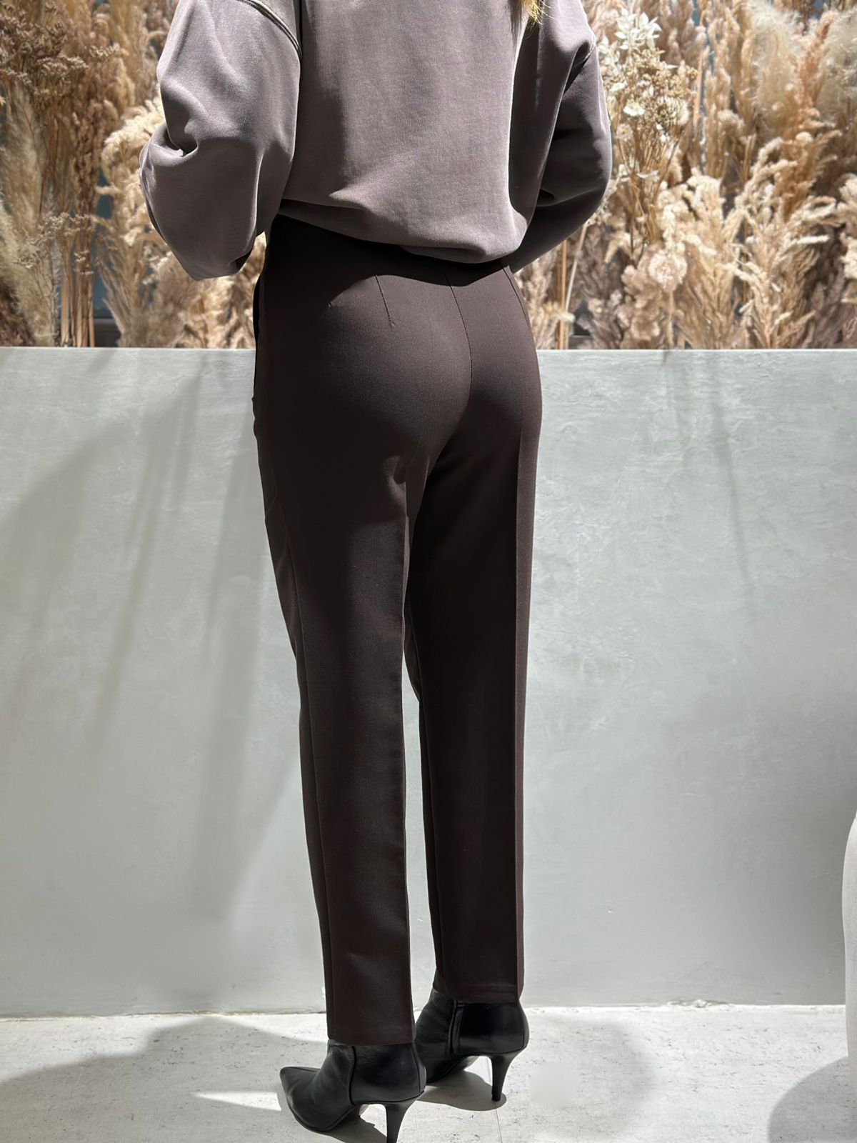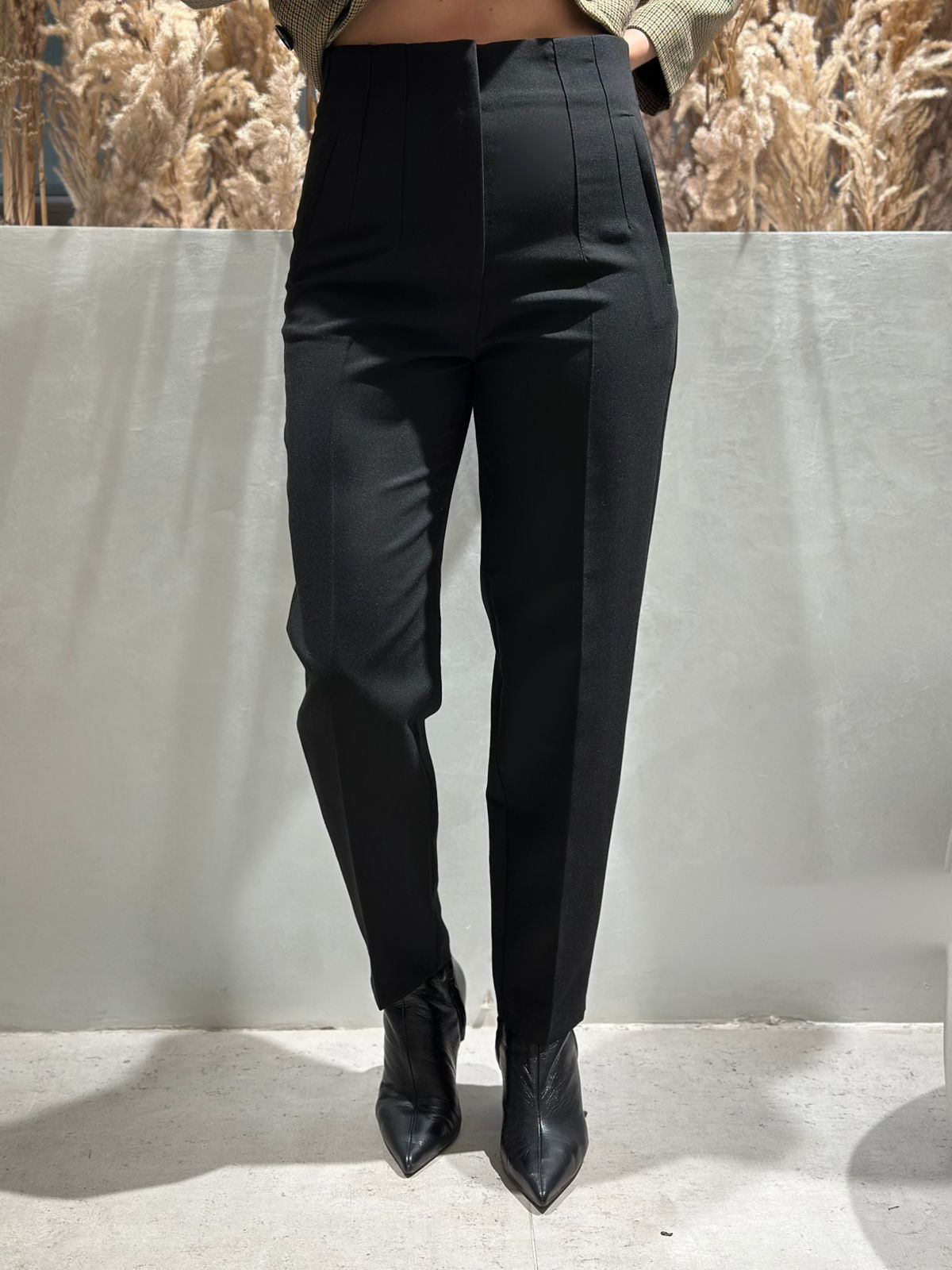 Pantallona slim me bel te larte dhe pensa. Gjatesia deri tek kyci i kembes me dy xhepa anesore.