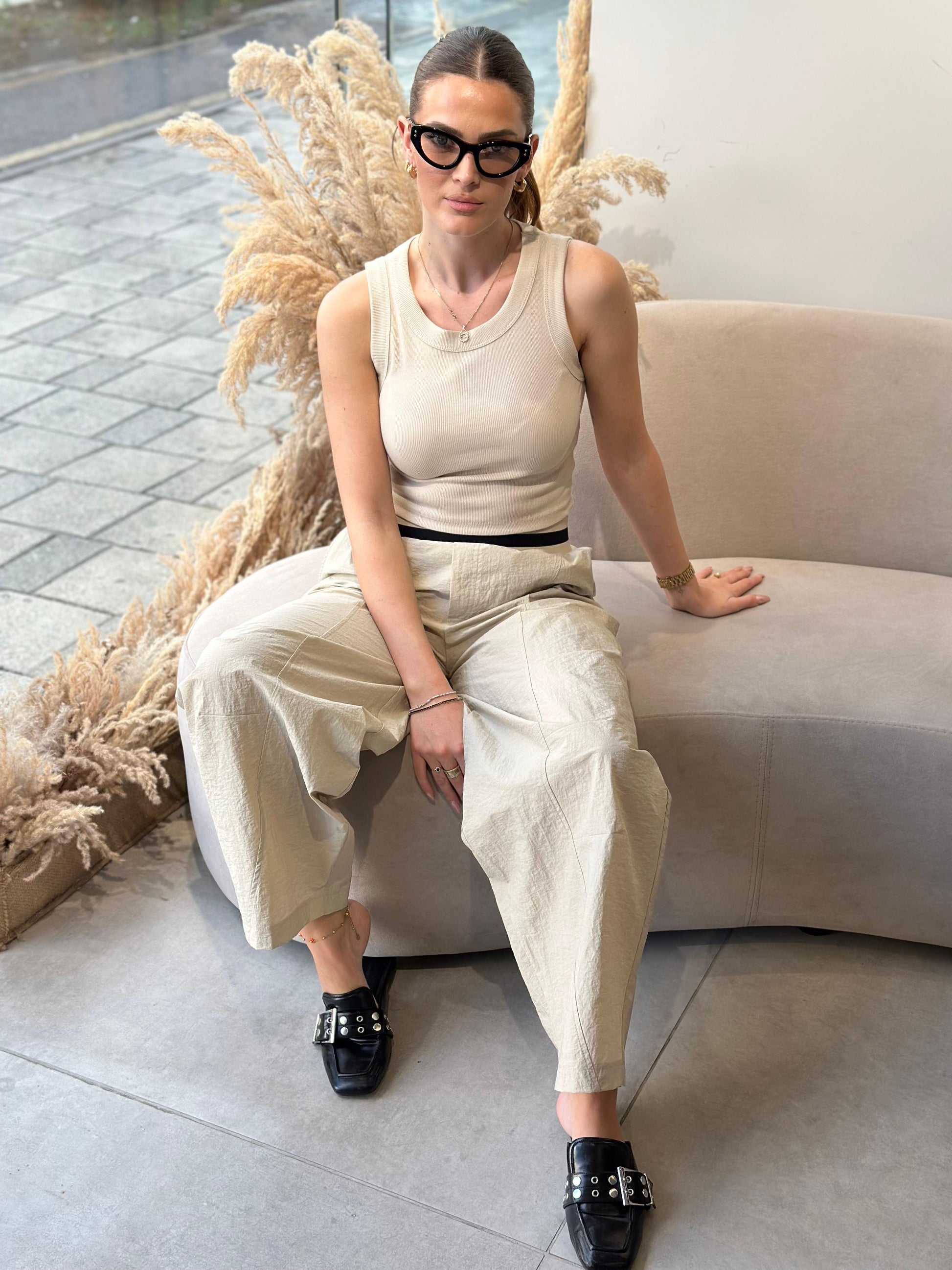 Pantallona me llastik ne bel dhe material feshe. Te lirshme dhe me dy xhepa anesore.