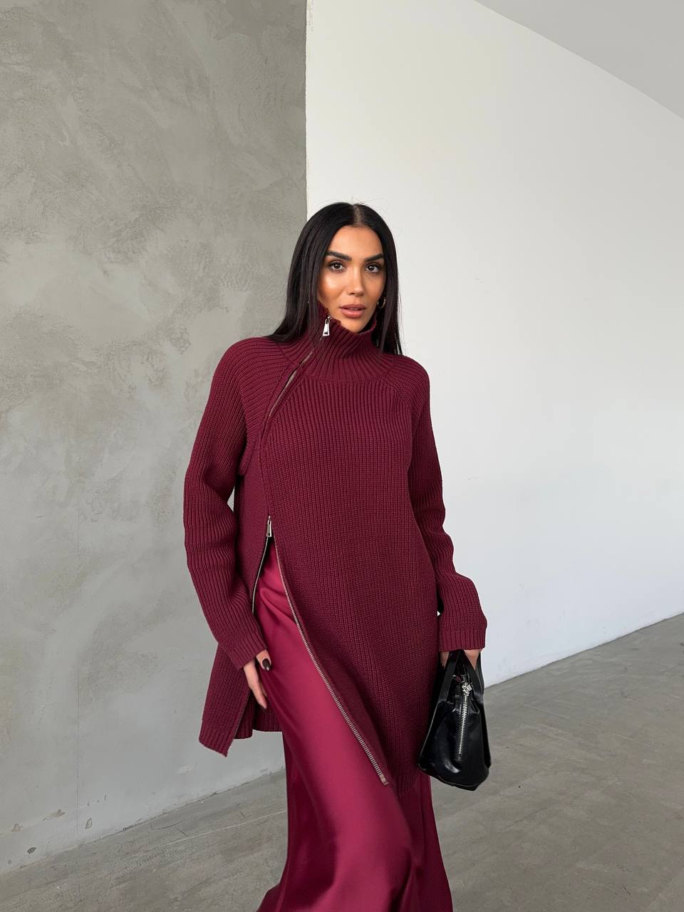 Oversized turtleneck pullover with a side zipper. Premium acrylic material with a chunky knit.