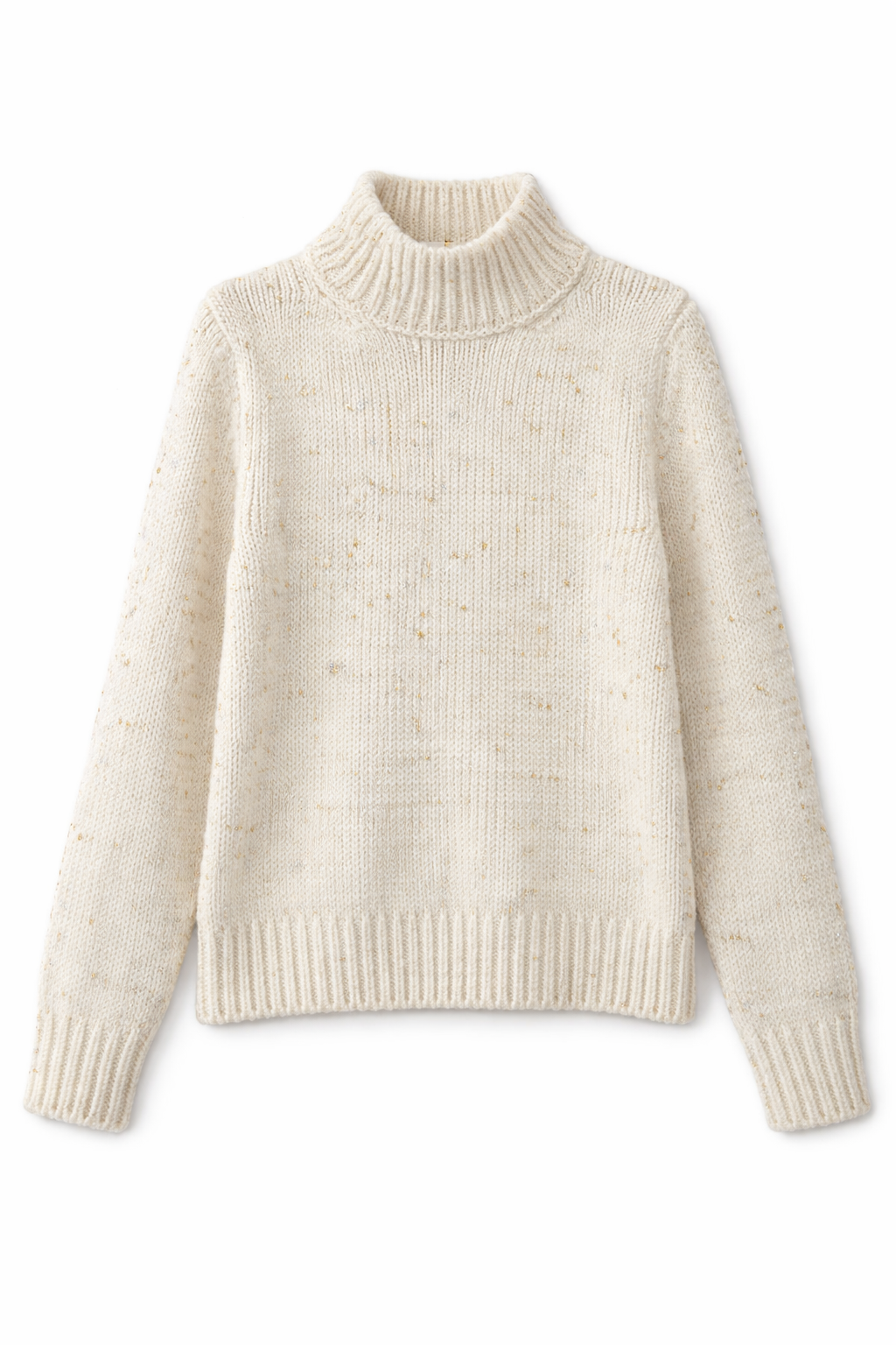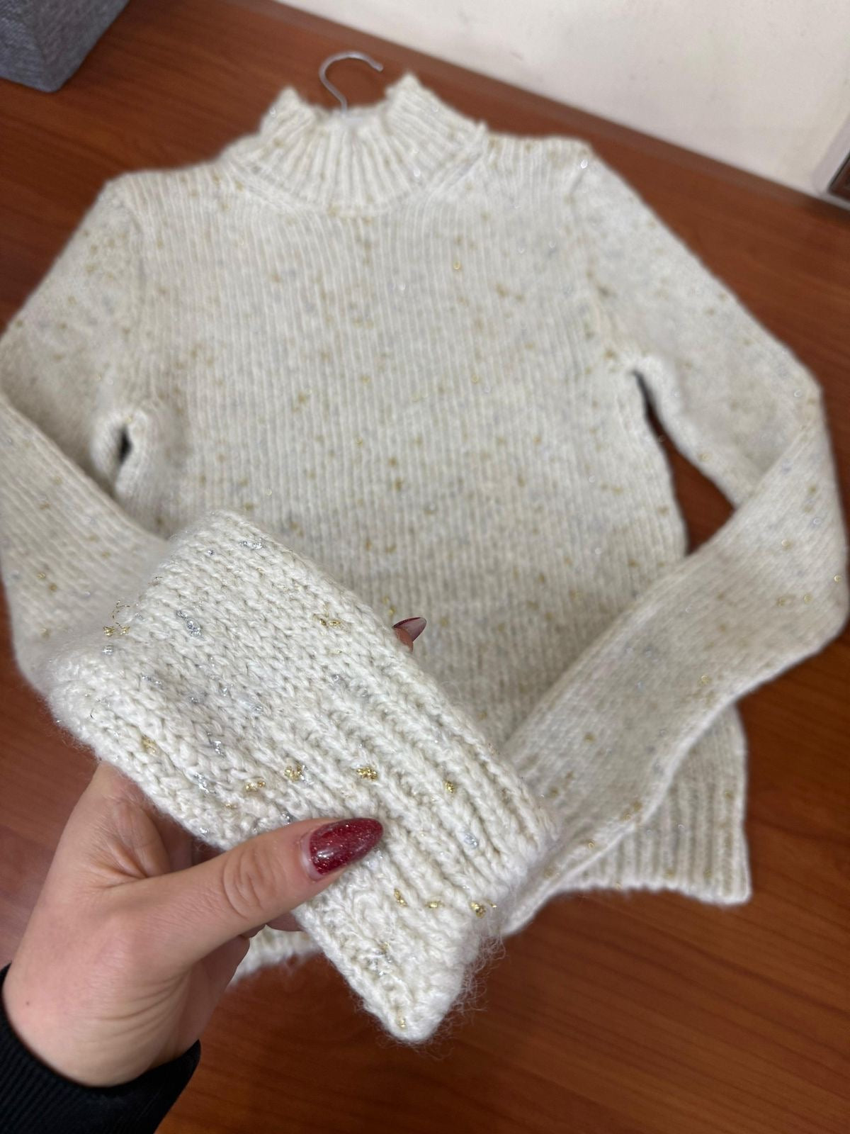 Pulover e leshte me jake golfi ne ngjyre bezhe e hapur me cerka gold dhe silver te lehta.