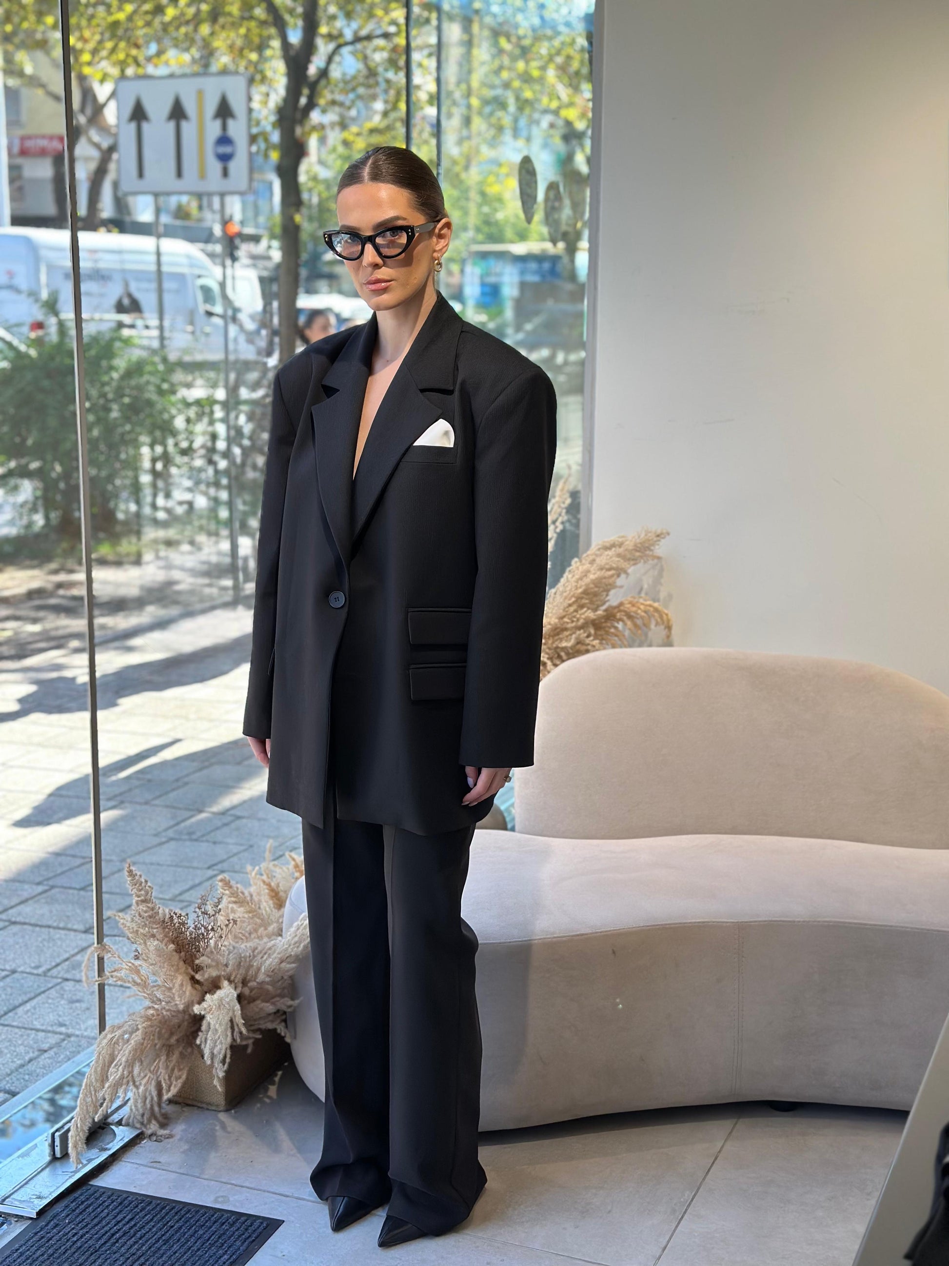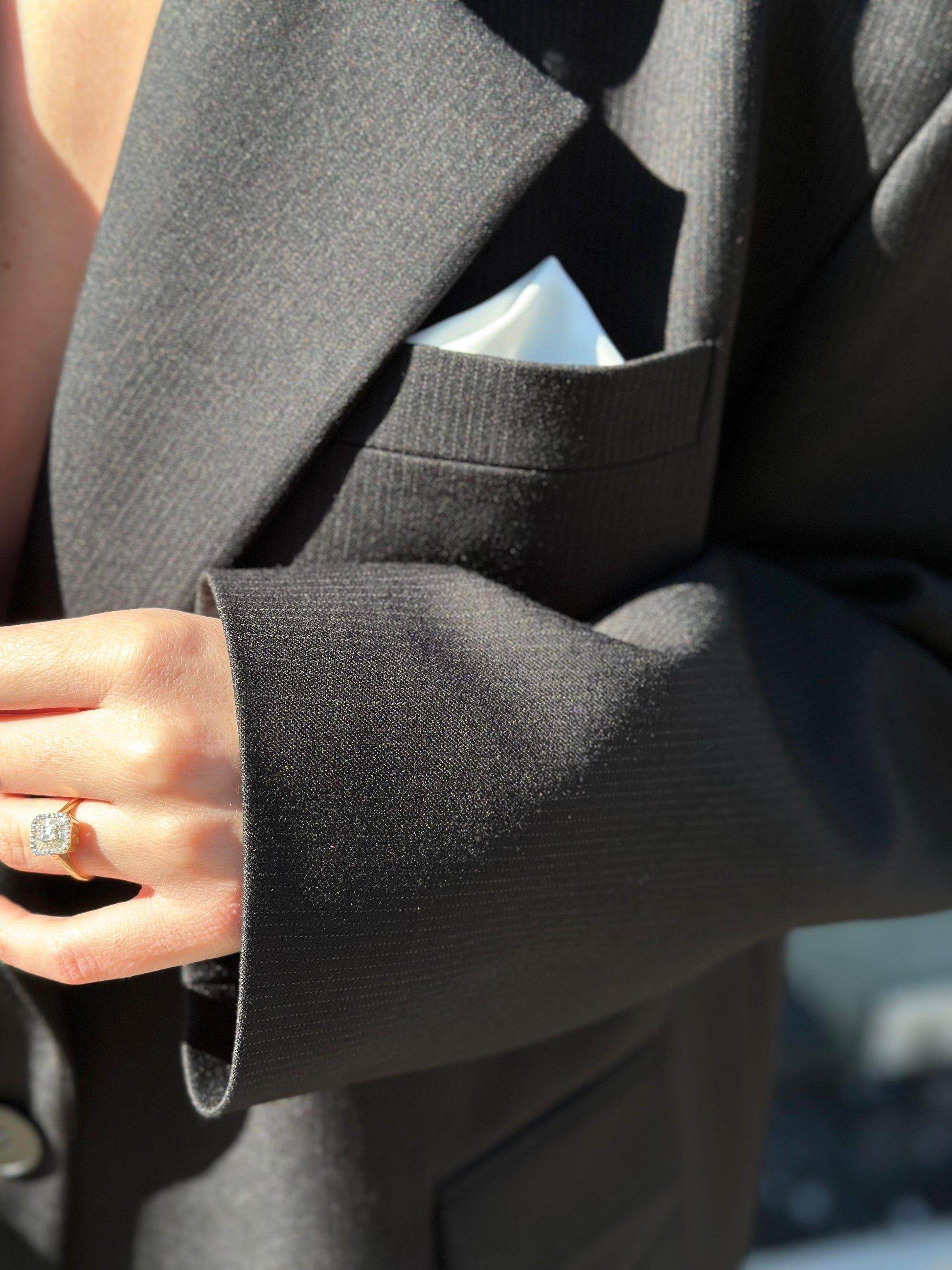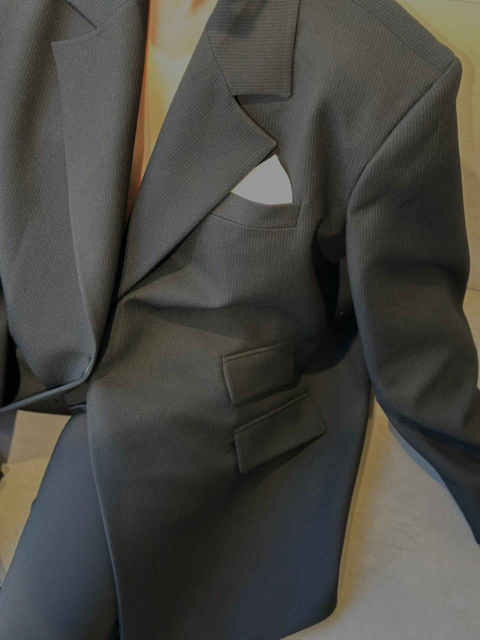 Xhakete oversize me vija te imeta. Cilesia premium, ka nje kopse dhe dy xhepa njeri mbi tjetrin ne anen e majte. Detaj xhepi i vogel tek gjoksi.