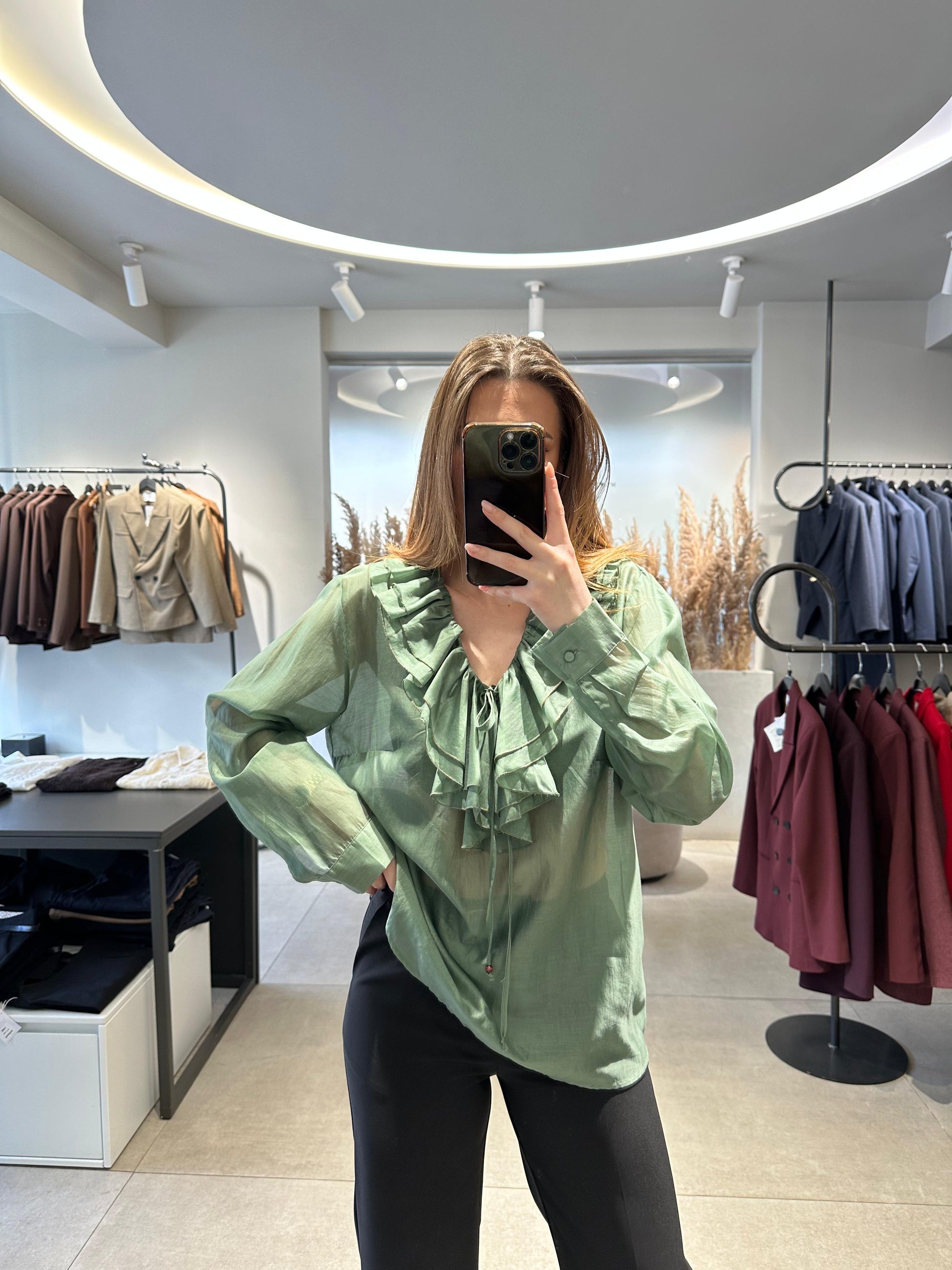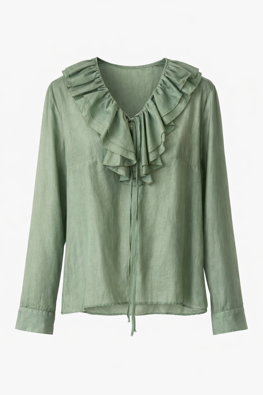 Bluze me ruffles të buta në jakë, lidhëse në qendër, material i lehtë, ngjyrë sage/green e zbehtë.