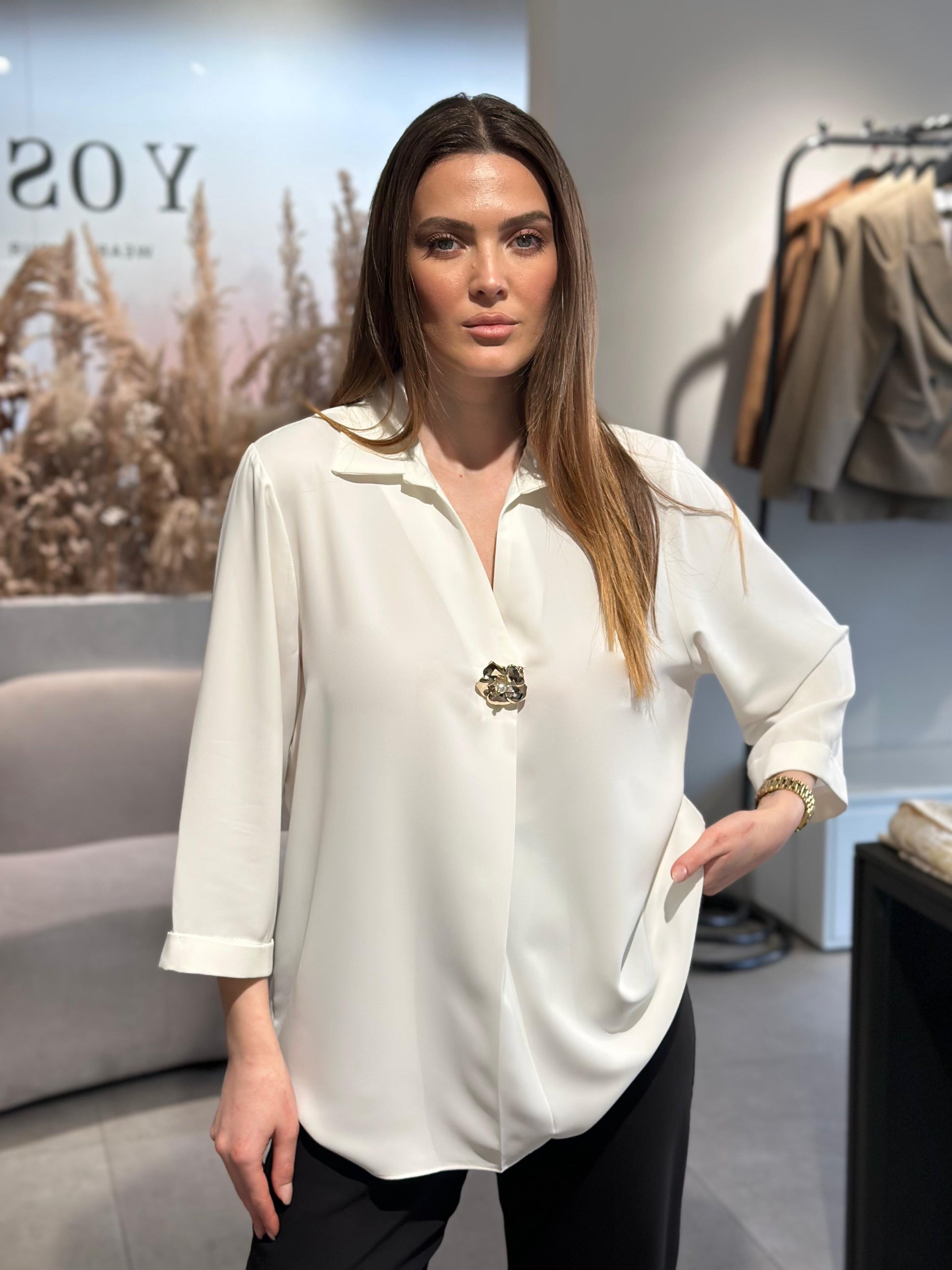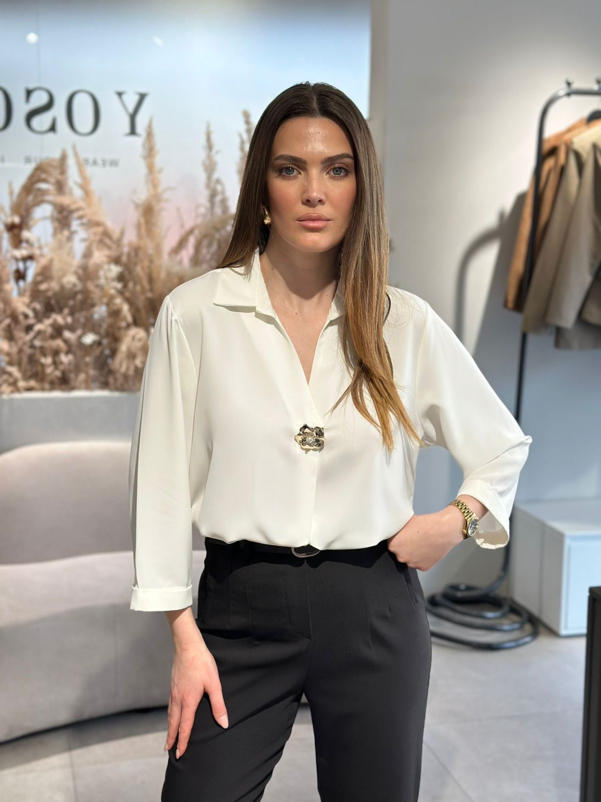 Bluze krem e bardhe me jake V dhe me detaj spile tek jaka.