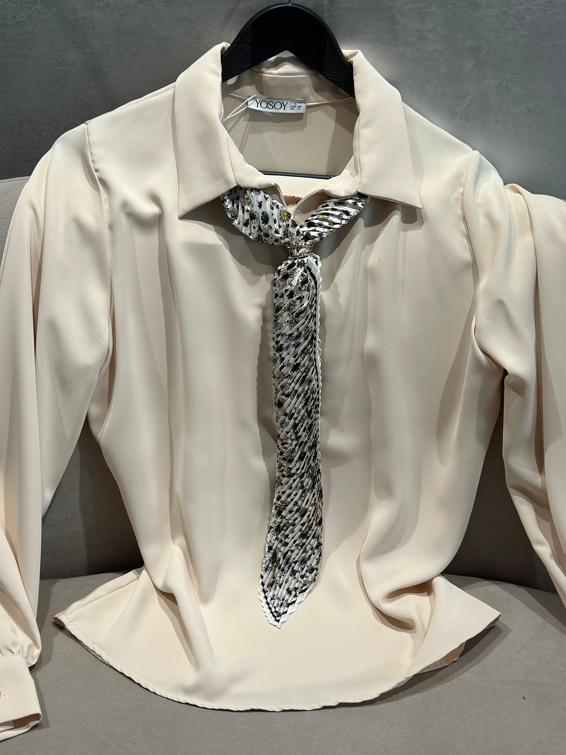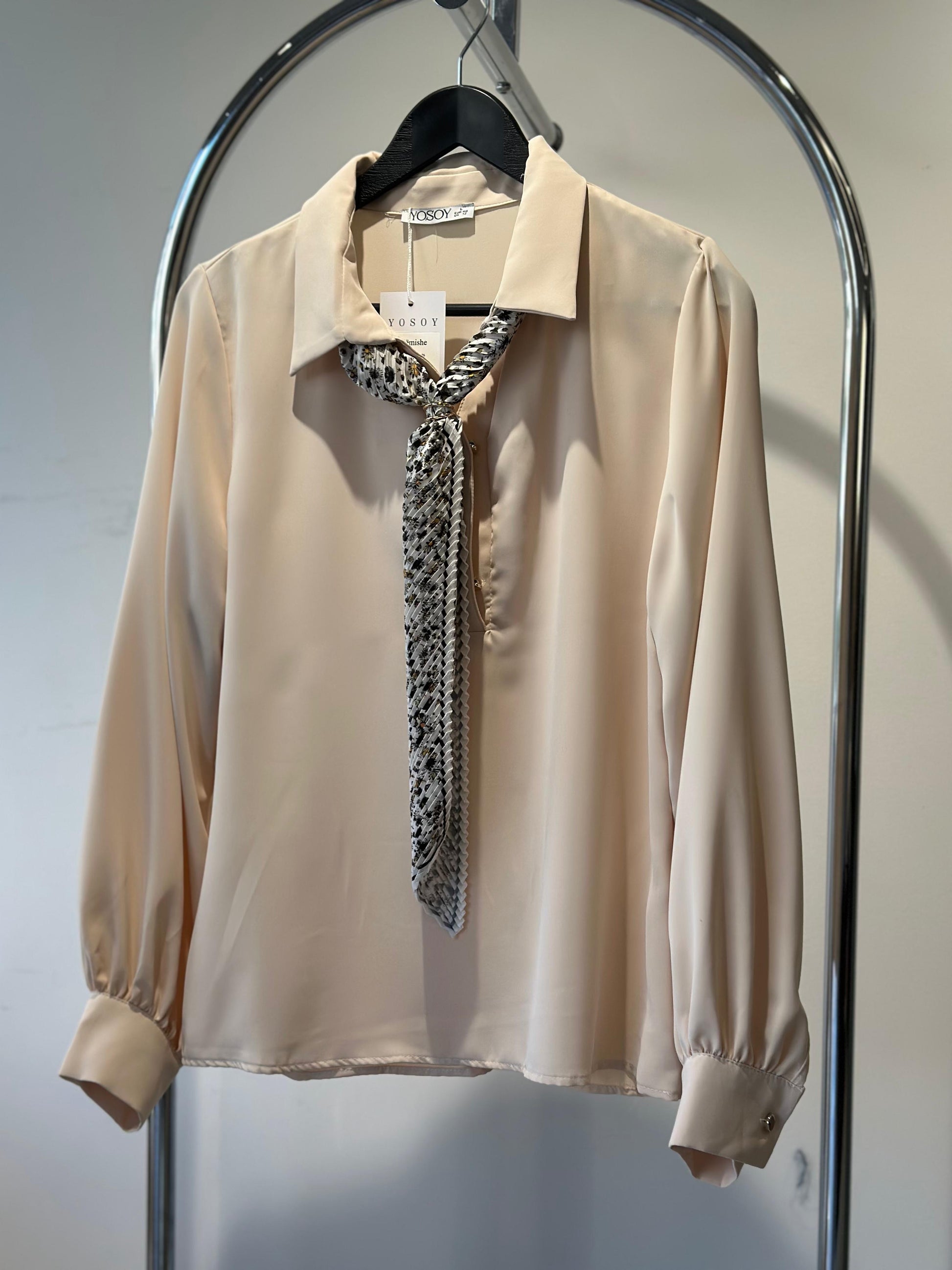 Bluze krem e holle me jake kemishe dhe dy kopsa. Menget e derdhura dhe pak te fryra ne fund. Shoqerohet me shallin e vet leopard dhe cope firzamonike.