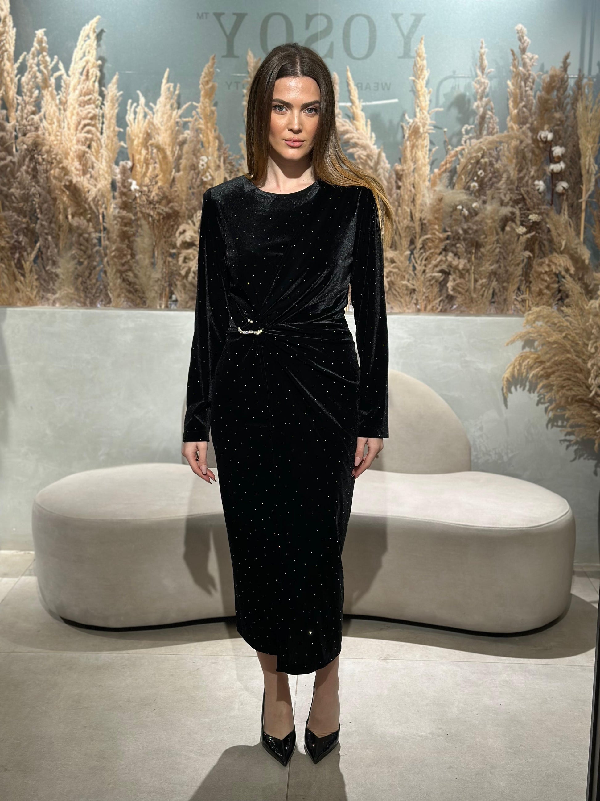 Fustan i gjate velvet me gure ne gjatesine e tij. Eshte me vata tek supet dhe me qepje draping.