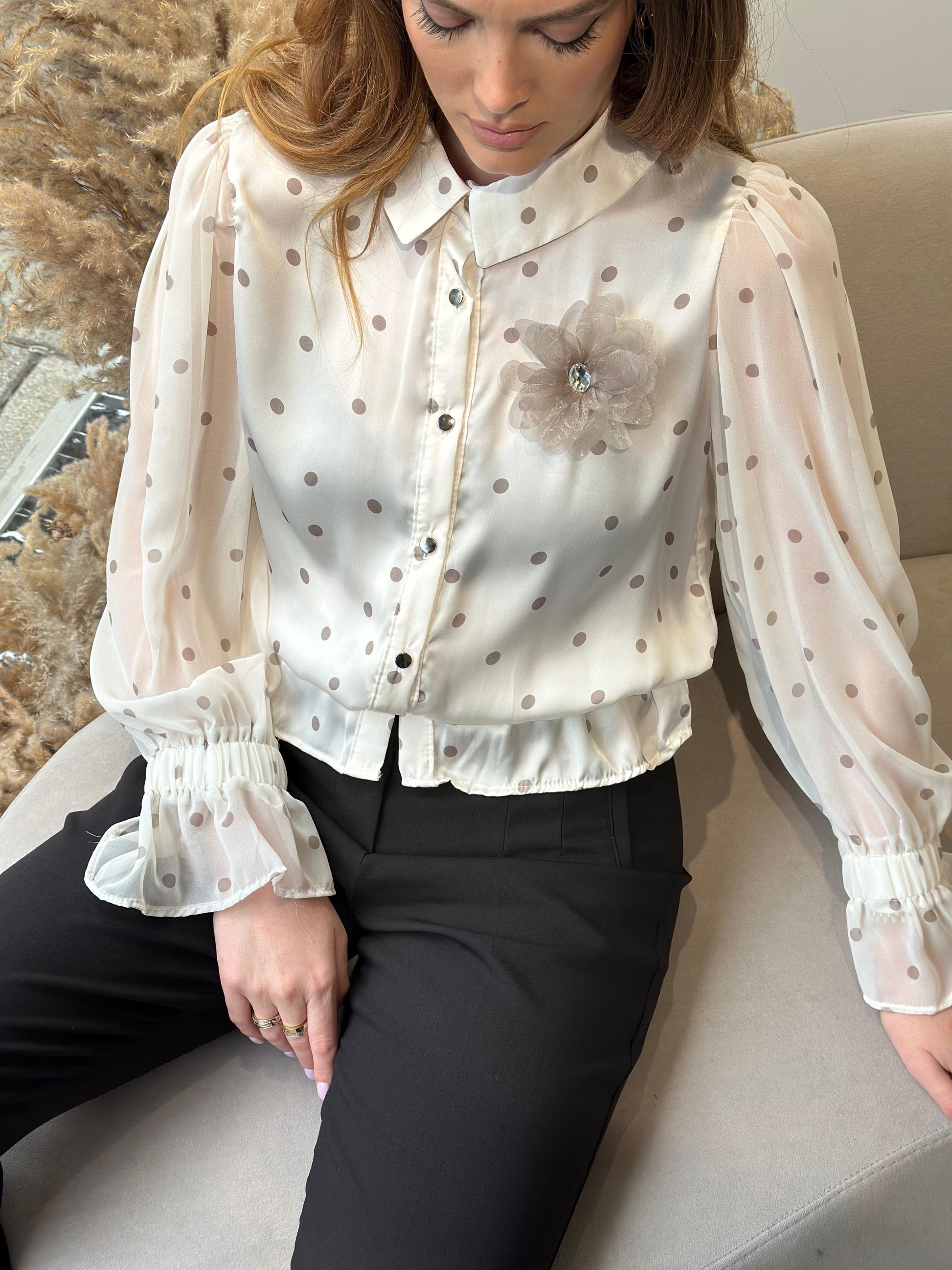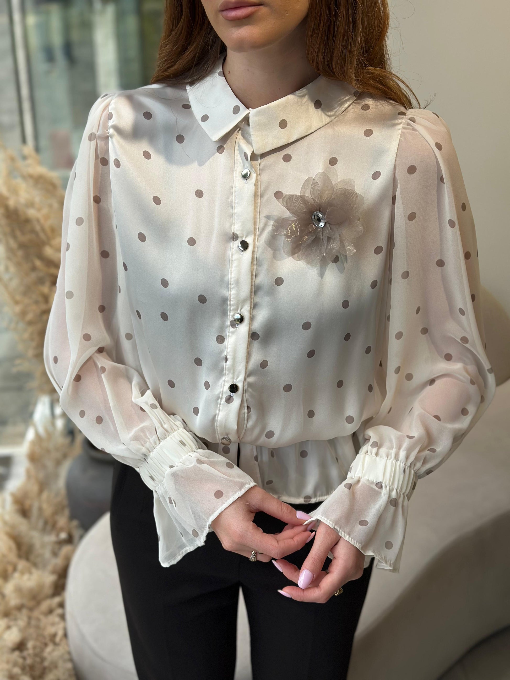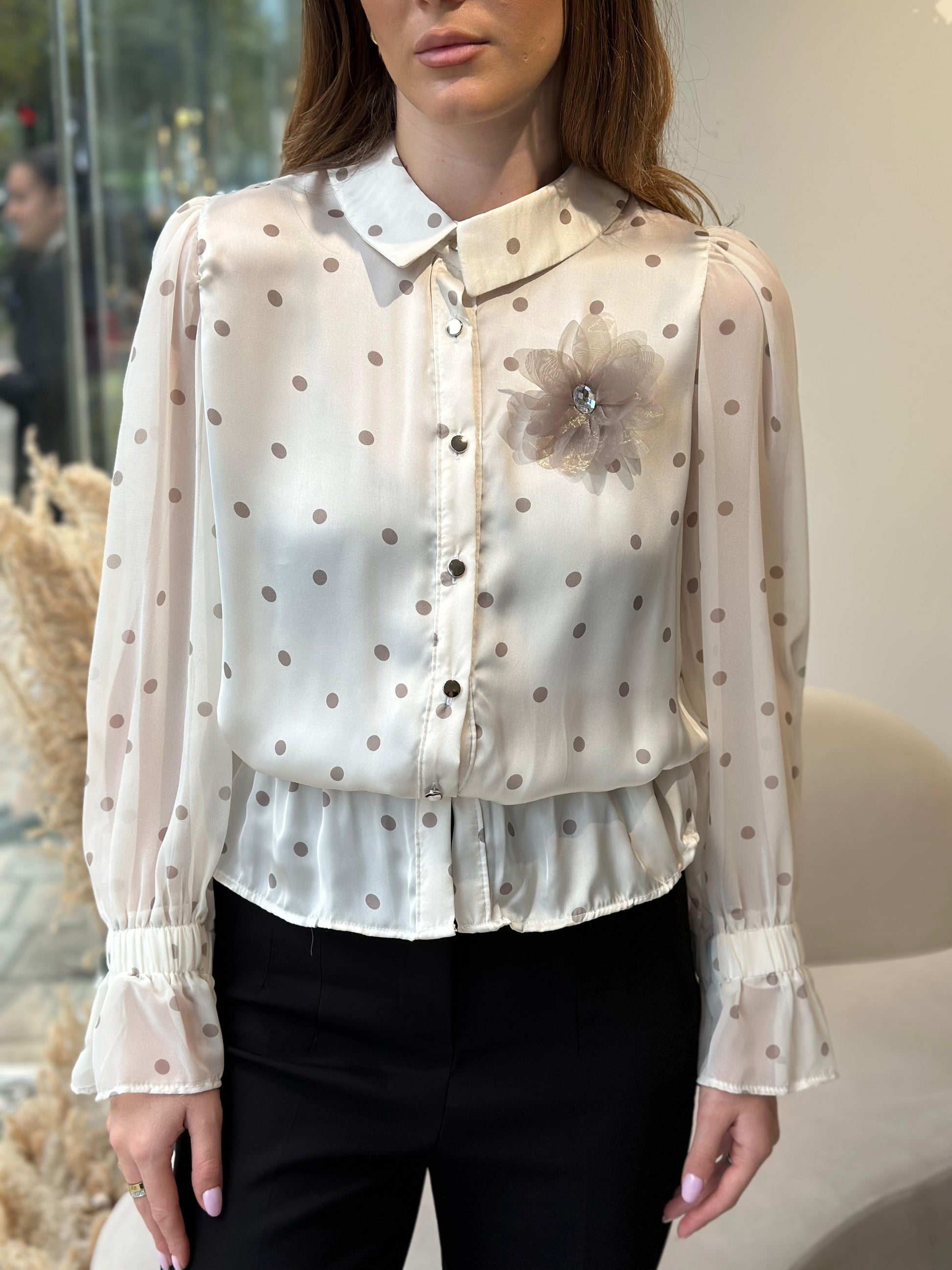 Kemishe krem e holle pana me pika kafe dhe me aksesor lule kafe qe mund te hiqet. Menget dhe beli mblidhen me llastik.