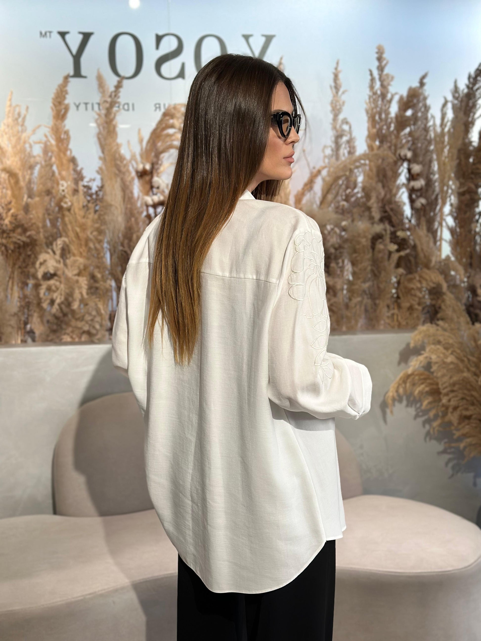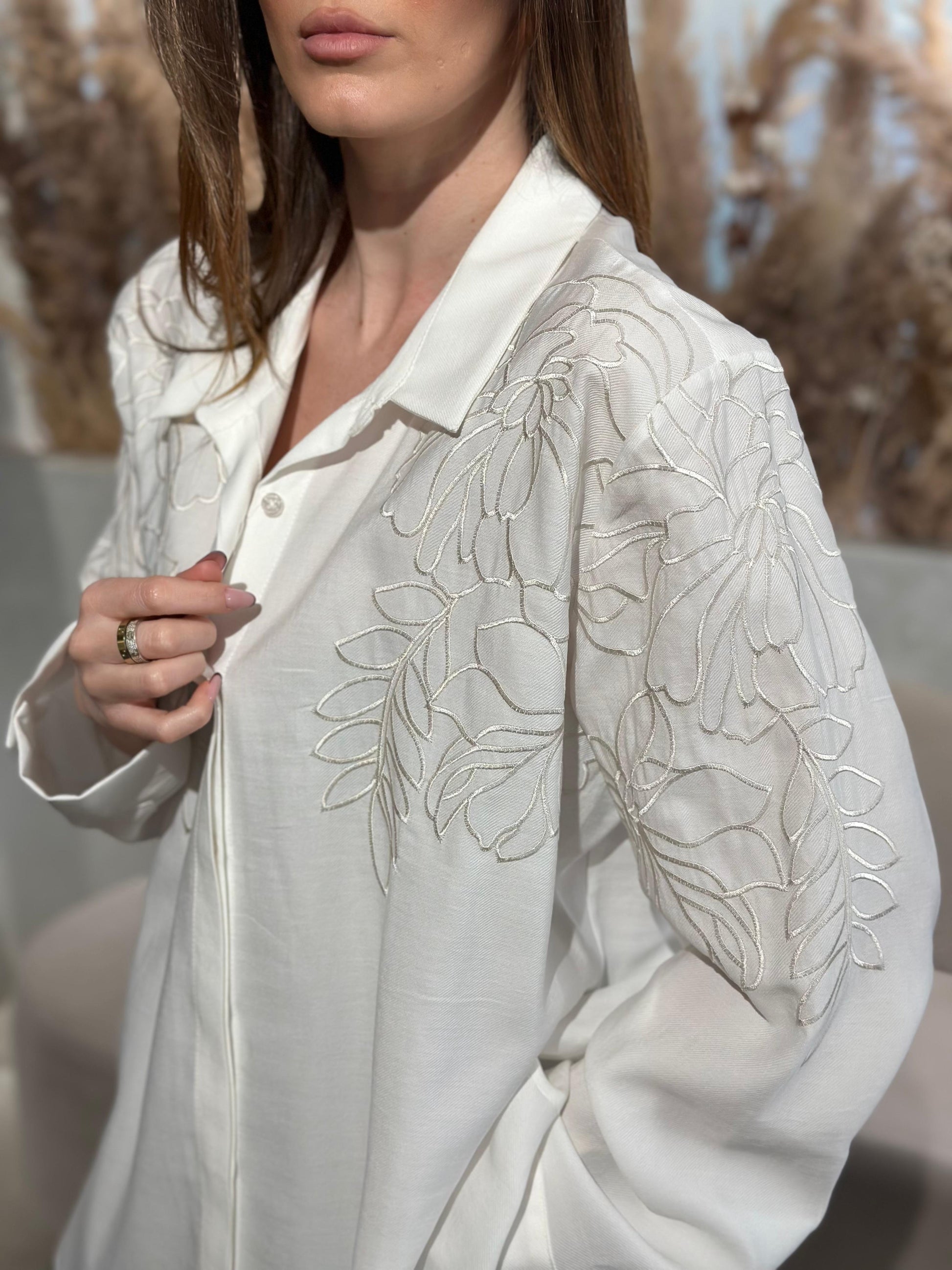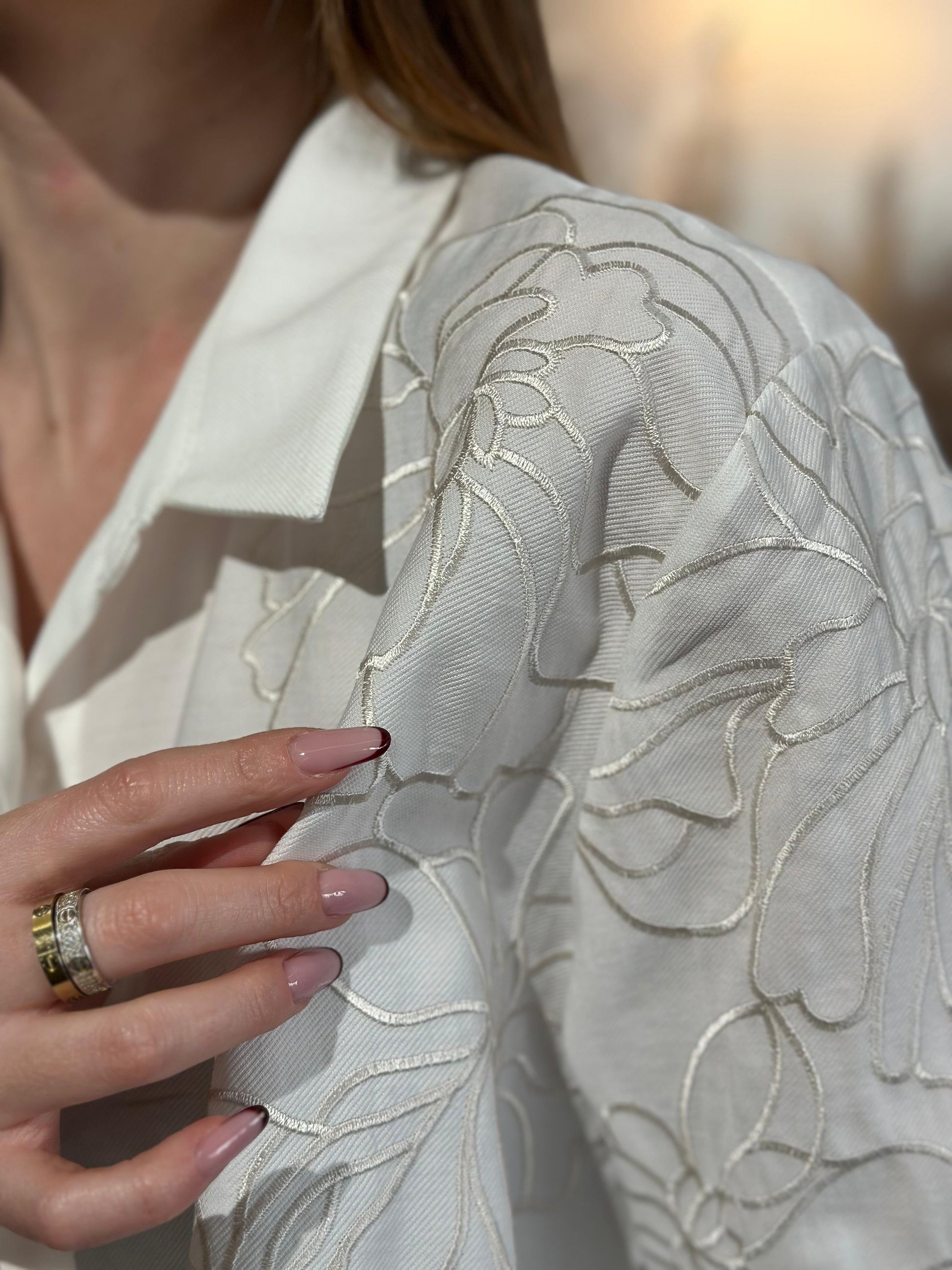 Kemishe e lehte oversize me menge te gjata. Detaje te qendisura bezhe ne dizajne lulesh.