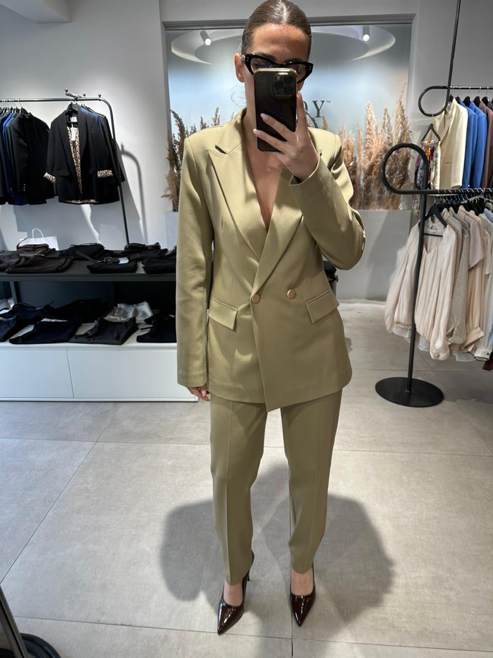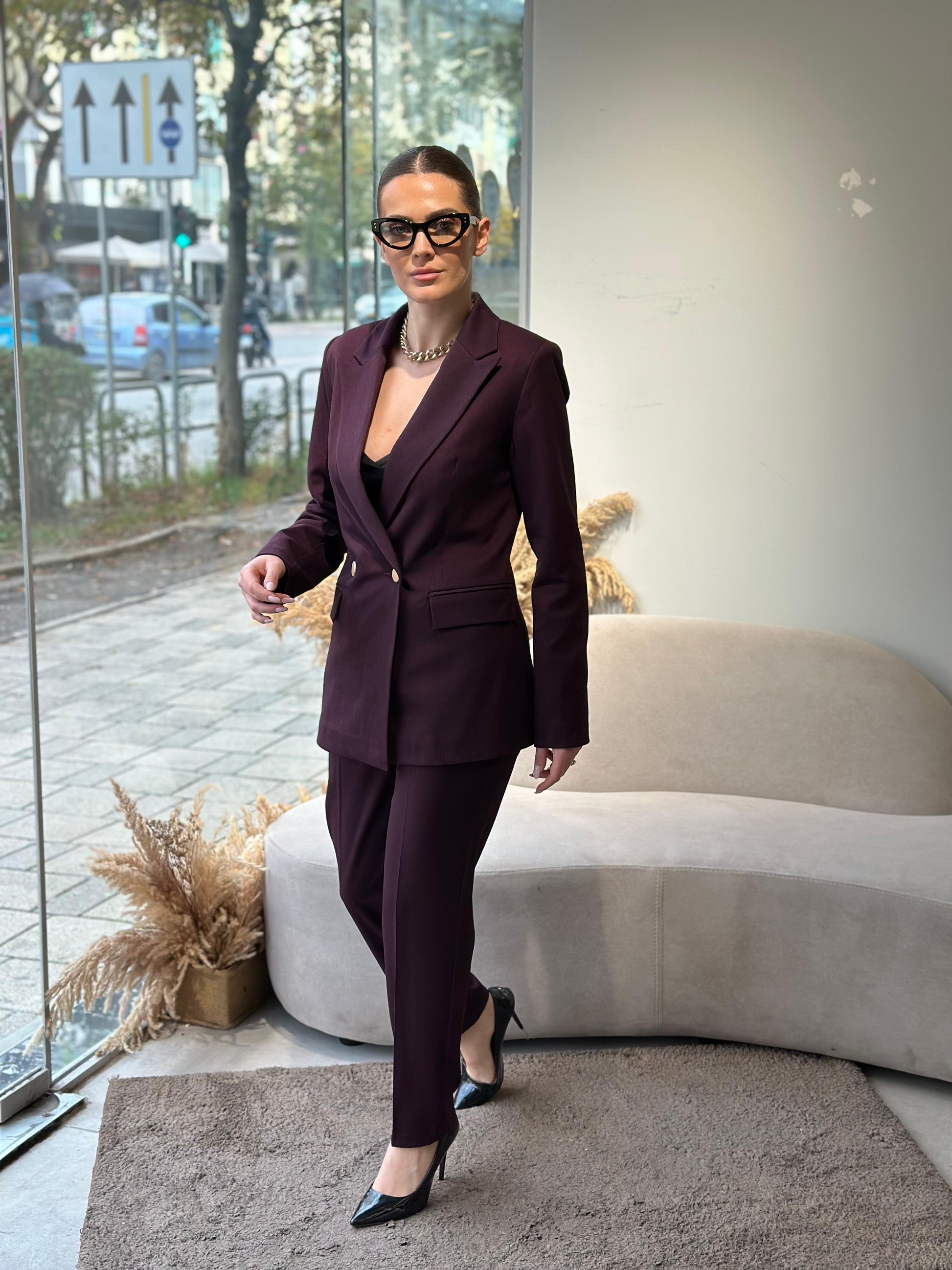 Kostum klasik me dopio kopse gold. Xhaketa klasike me pak bel. Pantallonat e gjata stili slim kaush. Copa e plote dimerore.