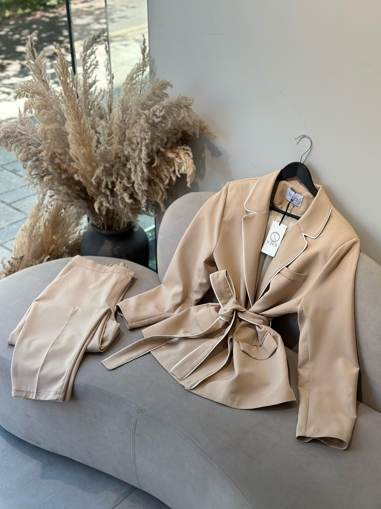 Kostum ne ngjyre kafe e hapur klasik me lidhje. Lidhesja ne bel me nje kontur detaj te bardhe. Pantallonat prerje fit klasike.