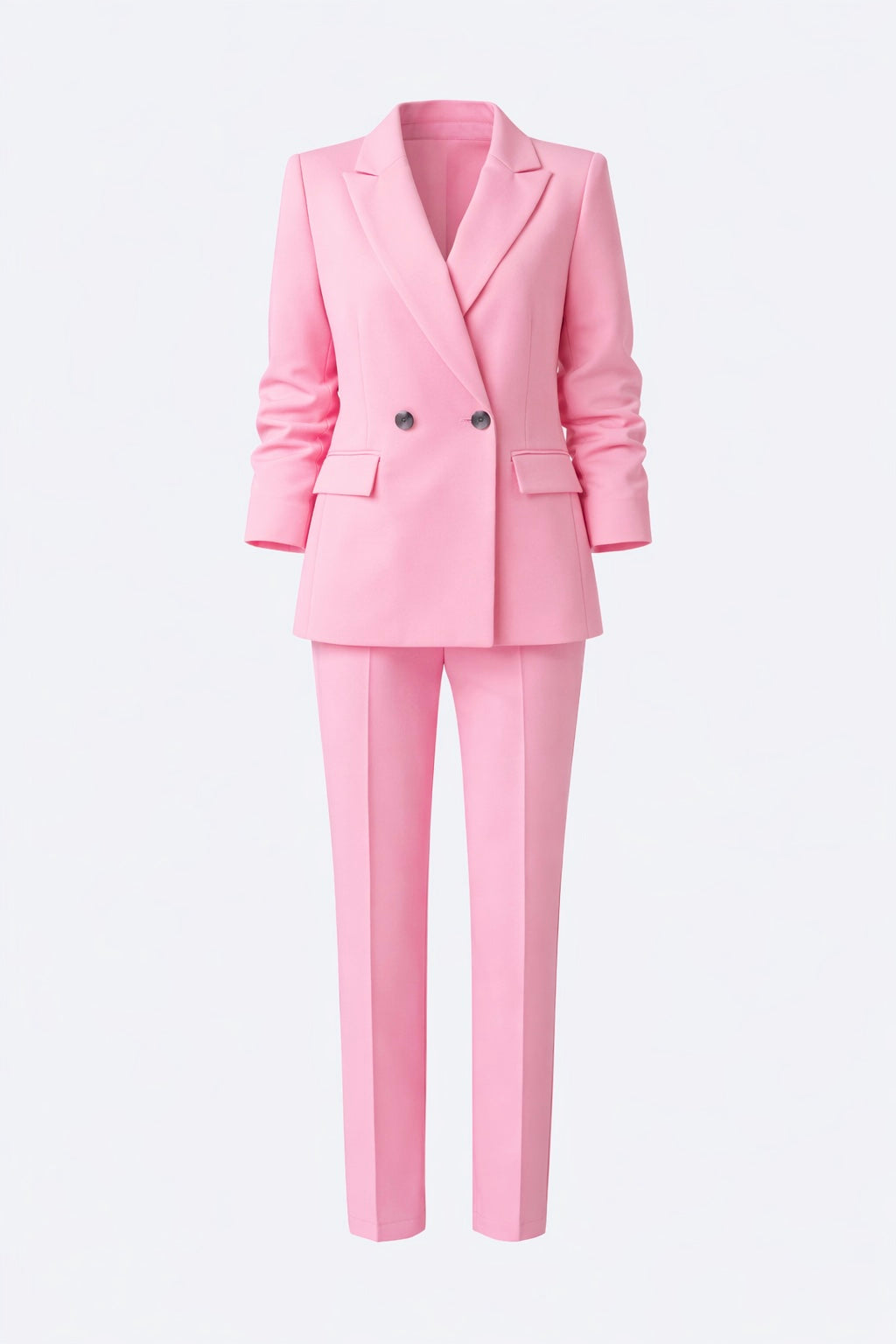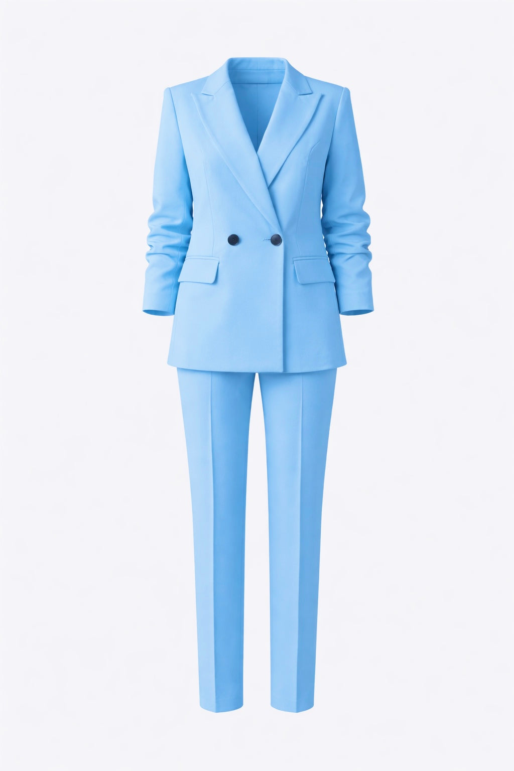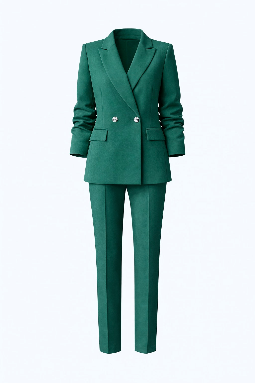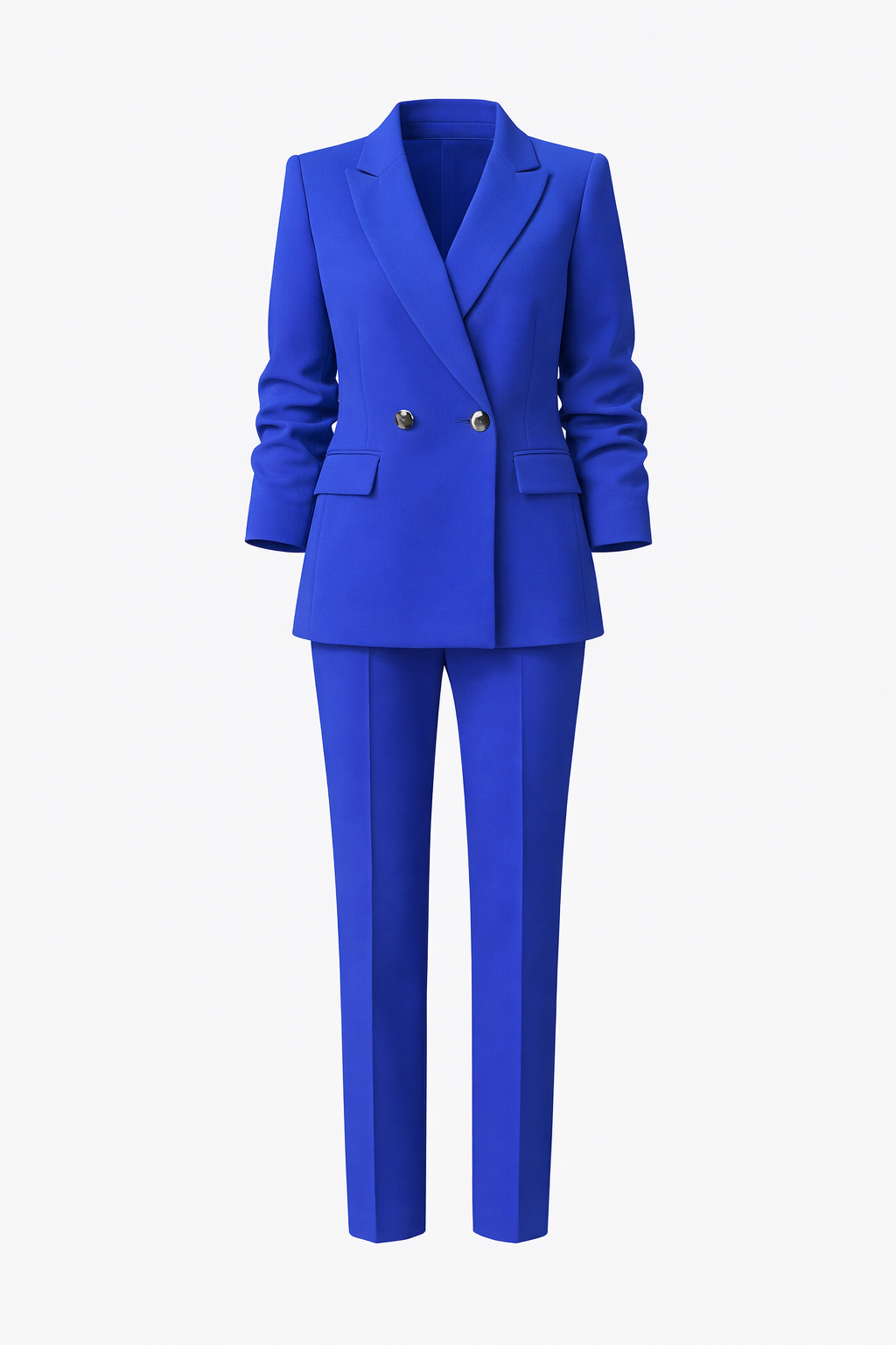 Kostum dopio kopsë në masa të mëdha. Kopsat janë metalike, ngjyrë argjend.