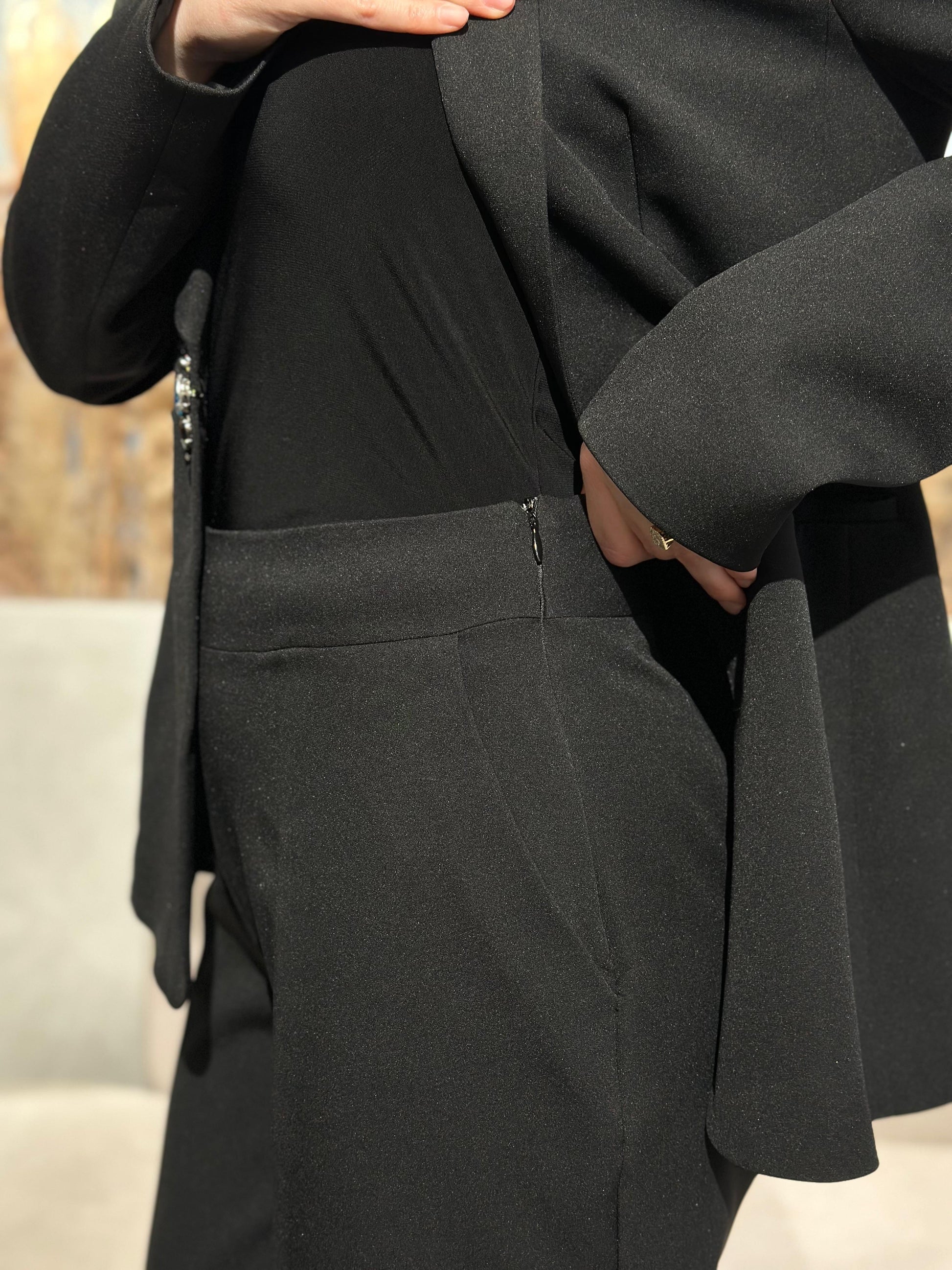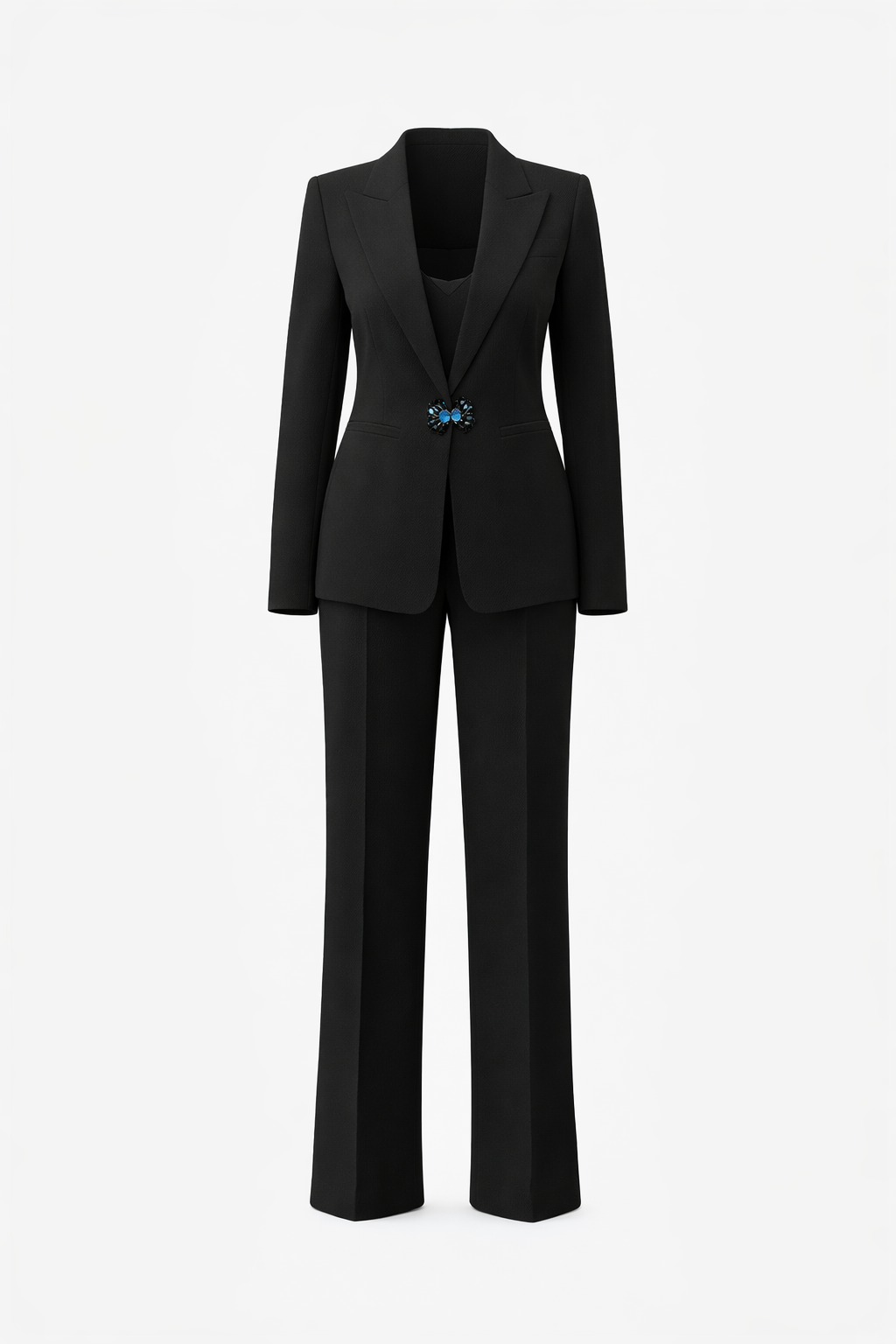 Kostum i zi me xhakete klasike dhe pantallona te gjata stil paralel. Xhaketa kapet ne bel me nje aksesor me gure jeshile dhe blu.