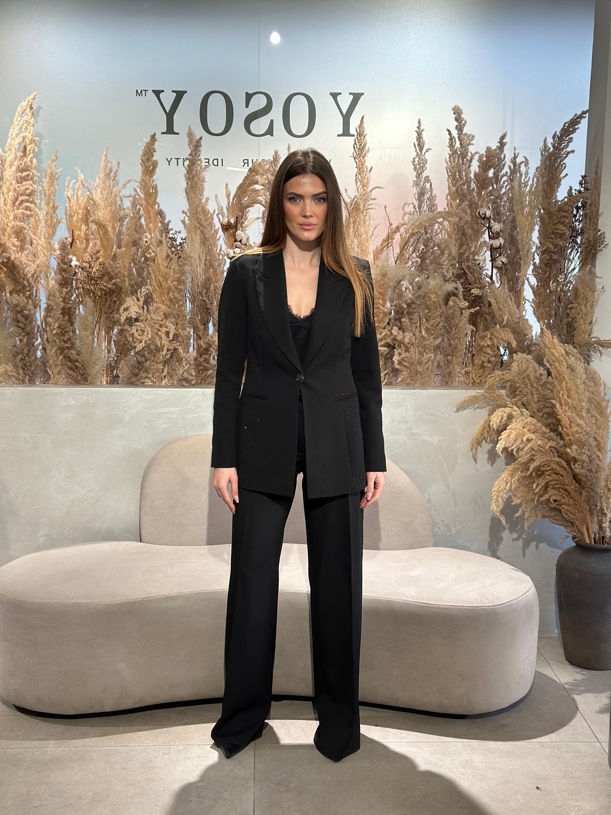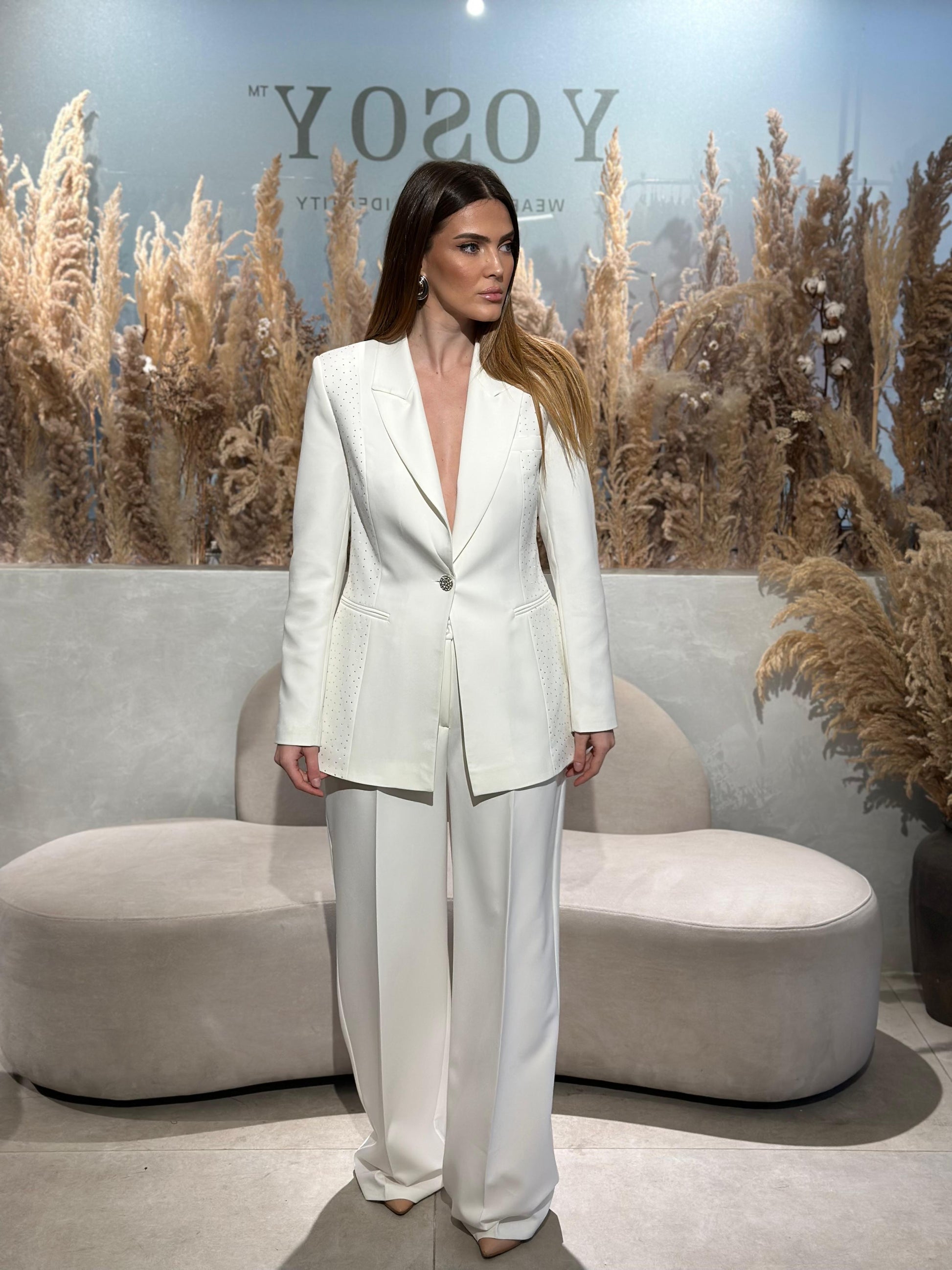 Kostum klasik me xhakete me 1 kopse dhe bel te theksuar ne menyre elegante. Xhaketa me gure perpara ne dy linja anesore. Pantallona te gjata te drejta, stil pak i gjere.