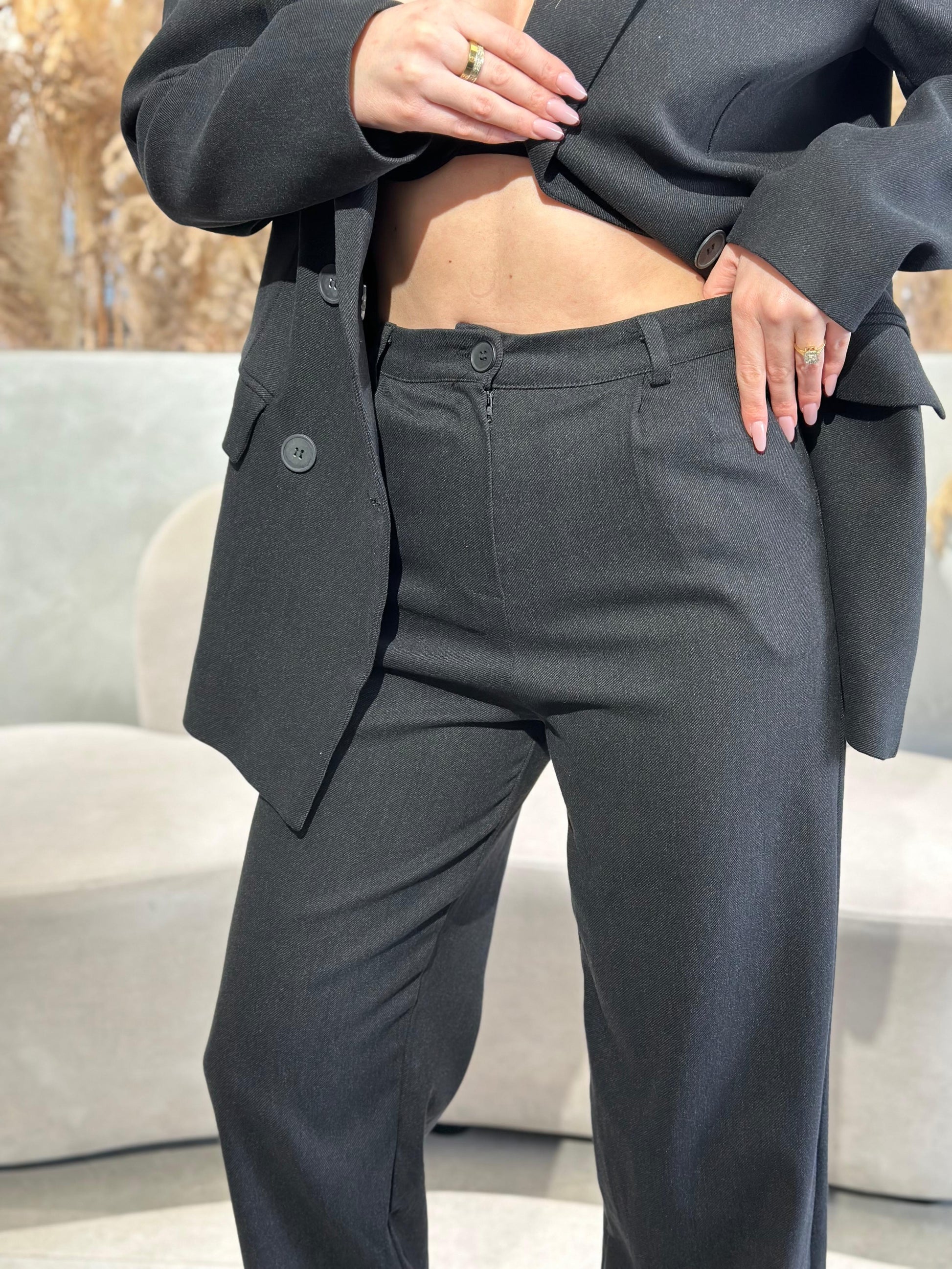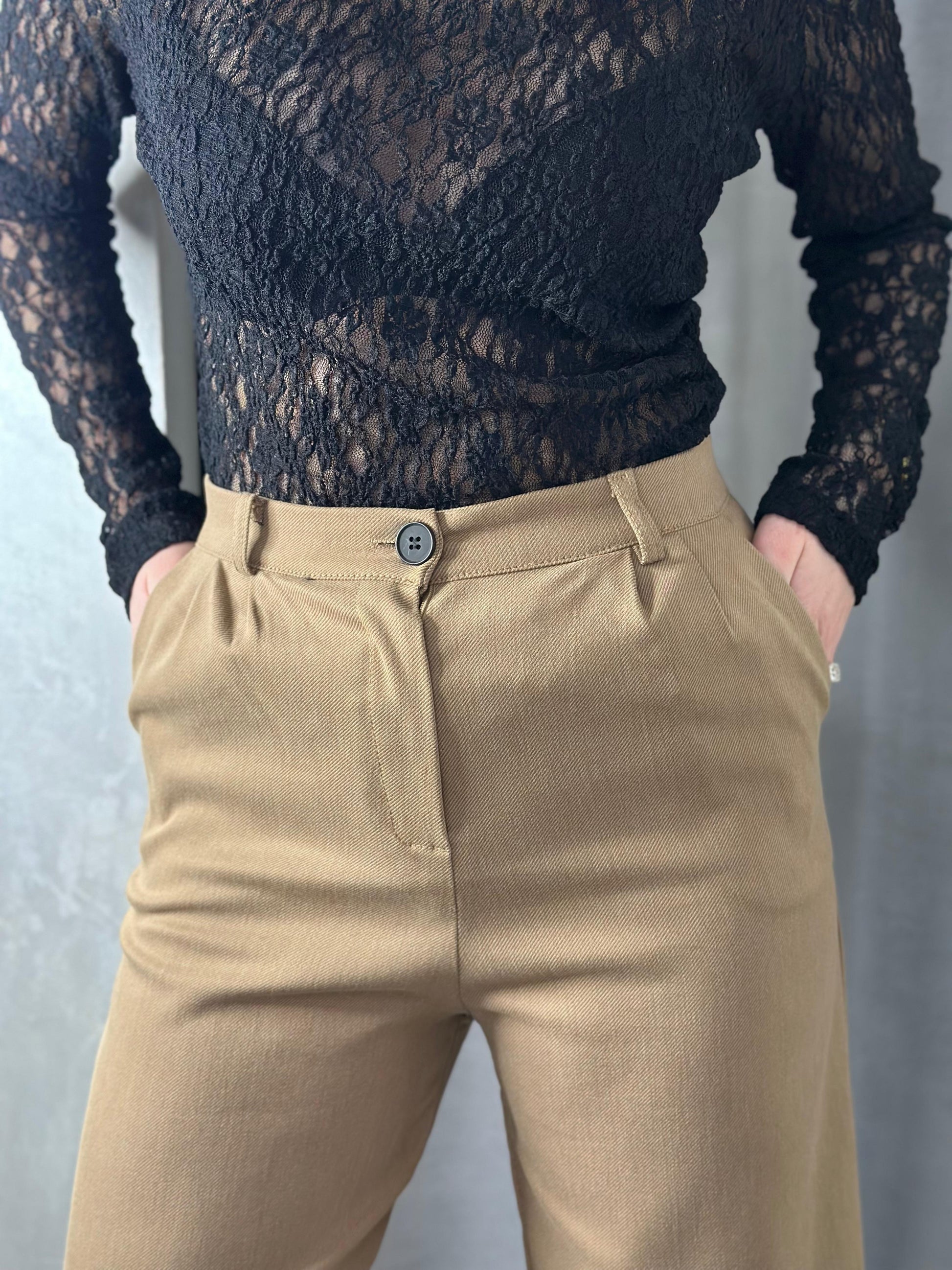 Pantallona te gjata te gjera me pensa perpara dhe xhepa. Cope e plote dimerore. Mund te kombinohet me xhaketen e saj duke i perfituar me nje cmim ulje si set.