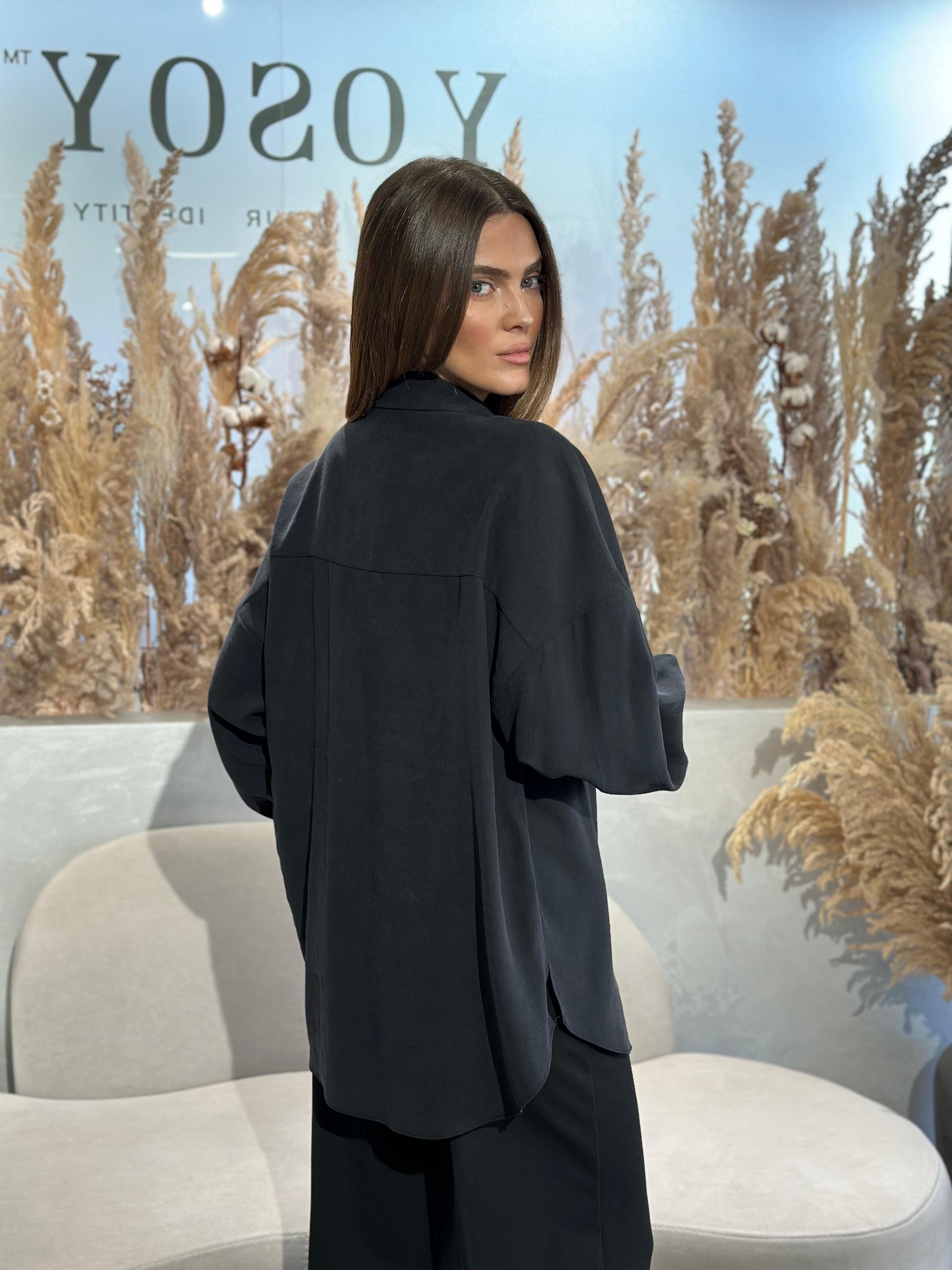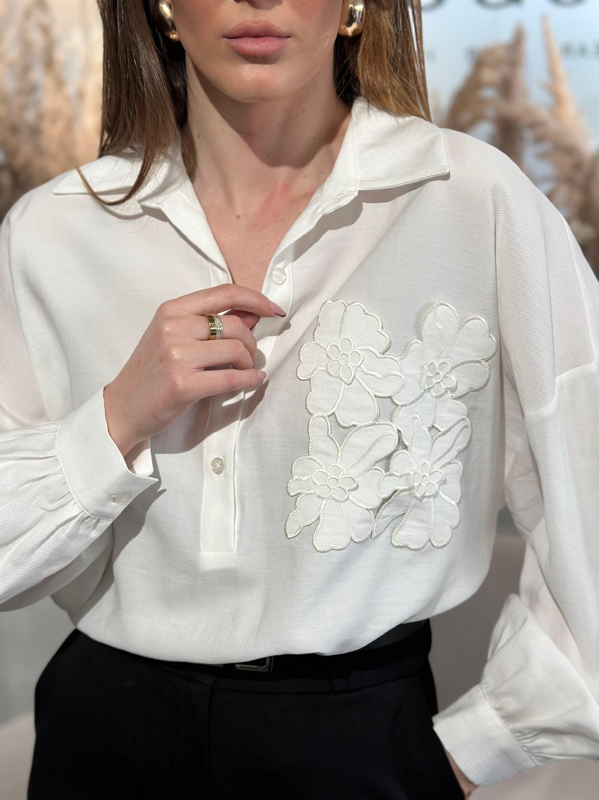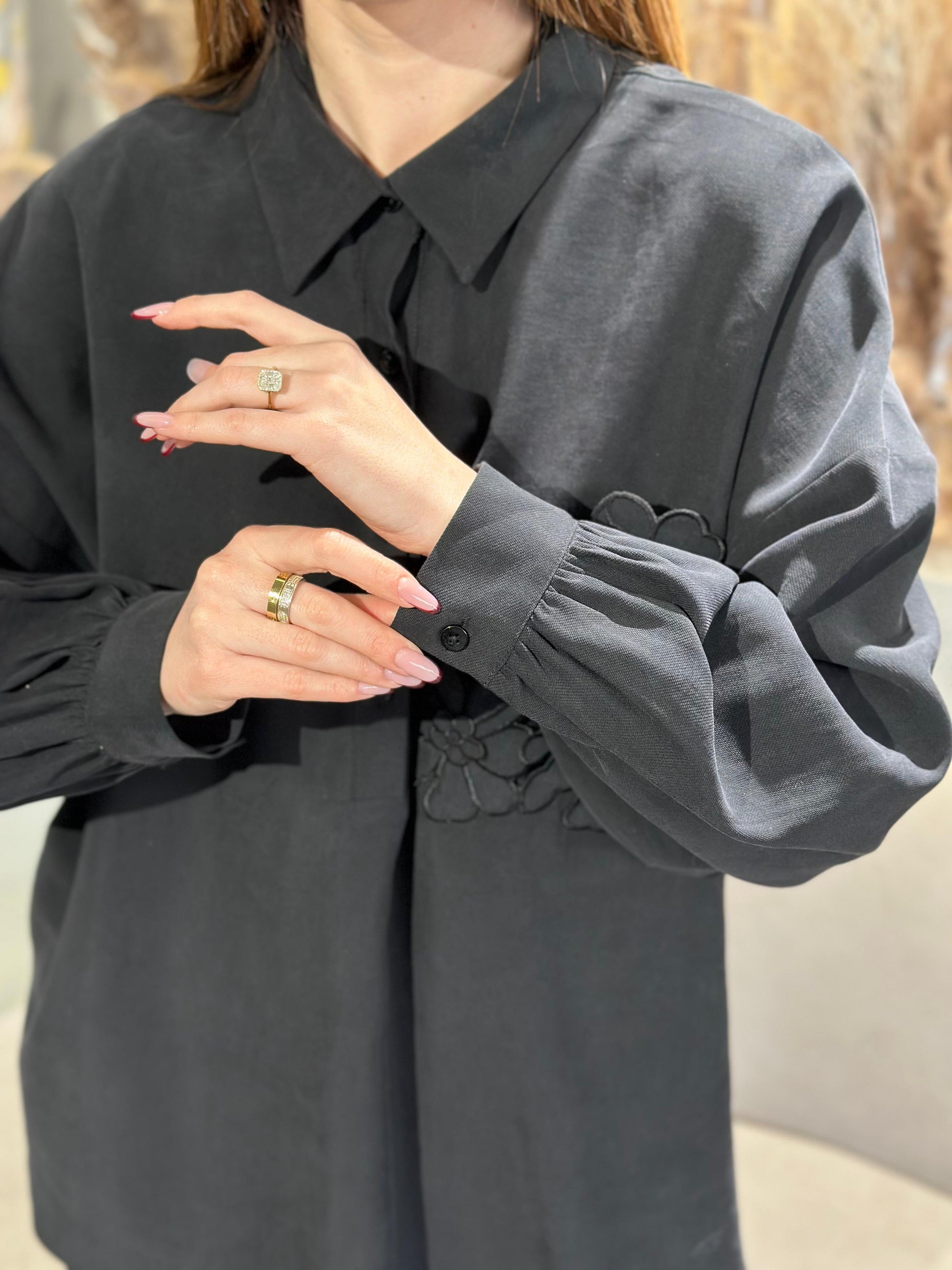 Kemishe oversize me kopsa deri tek kraharori. Menget e gjata dhe te derdhura, te mbledhura tek mansheta. Ka nje detaj me lule te qendisura ne vend te xhepit lart majtas.