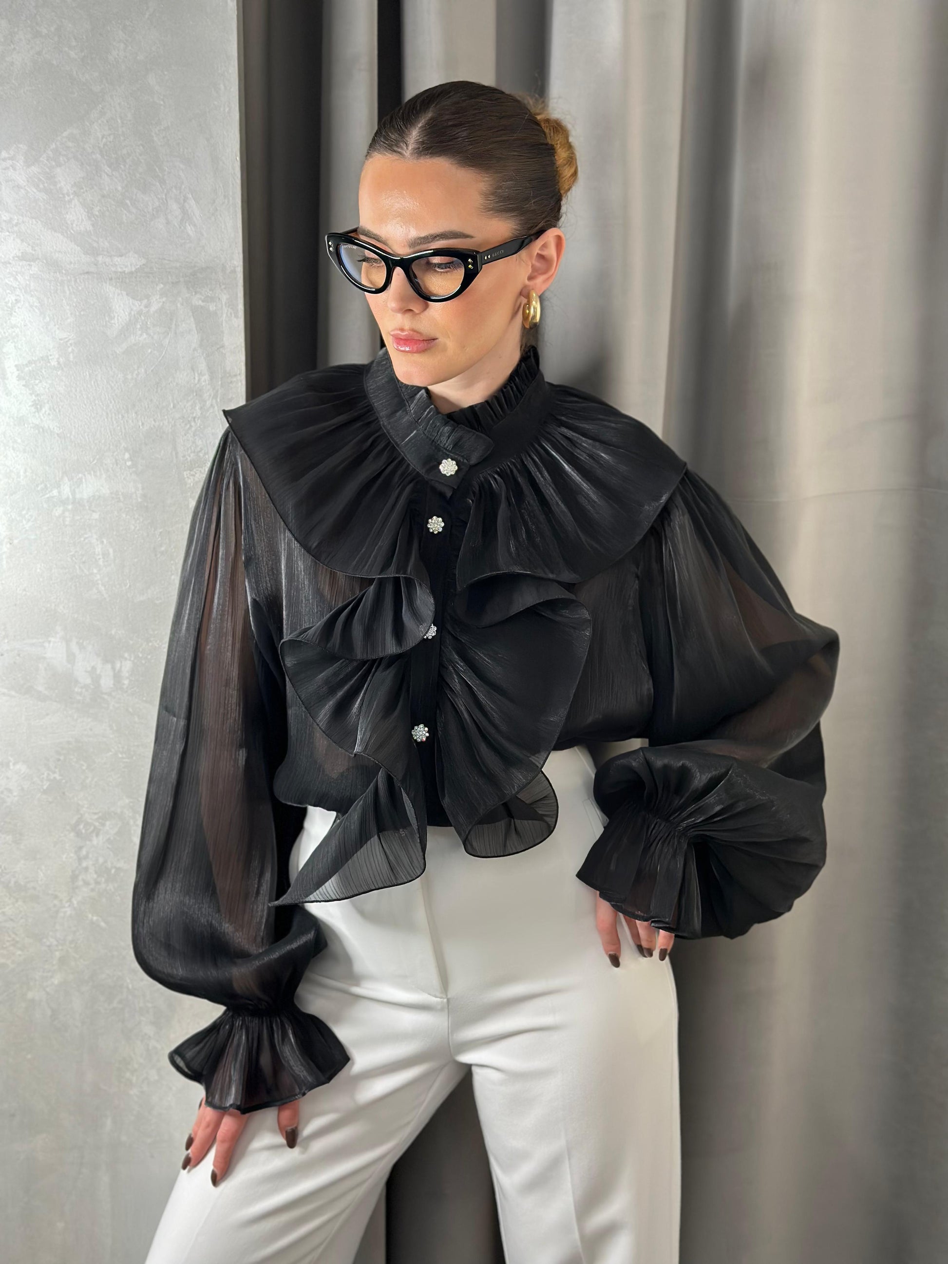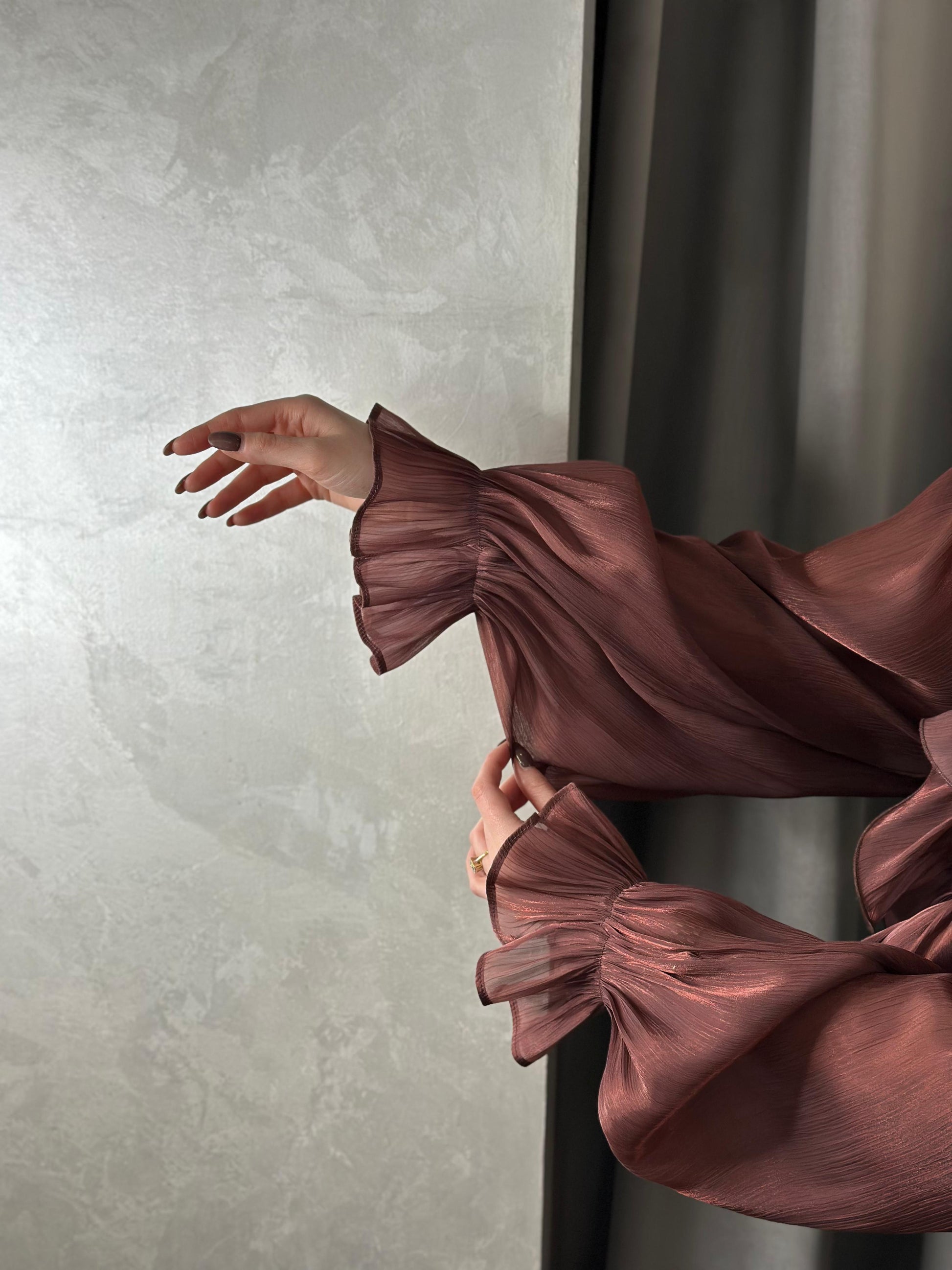 Kemishe me pala valezuese tek jaka dhe menget. Material transparent, shoqerohet me kanotiere per t’u veshur posht.